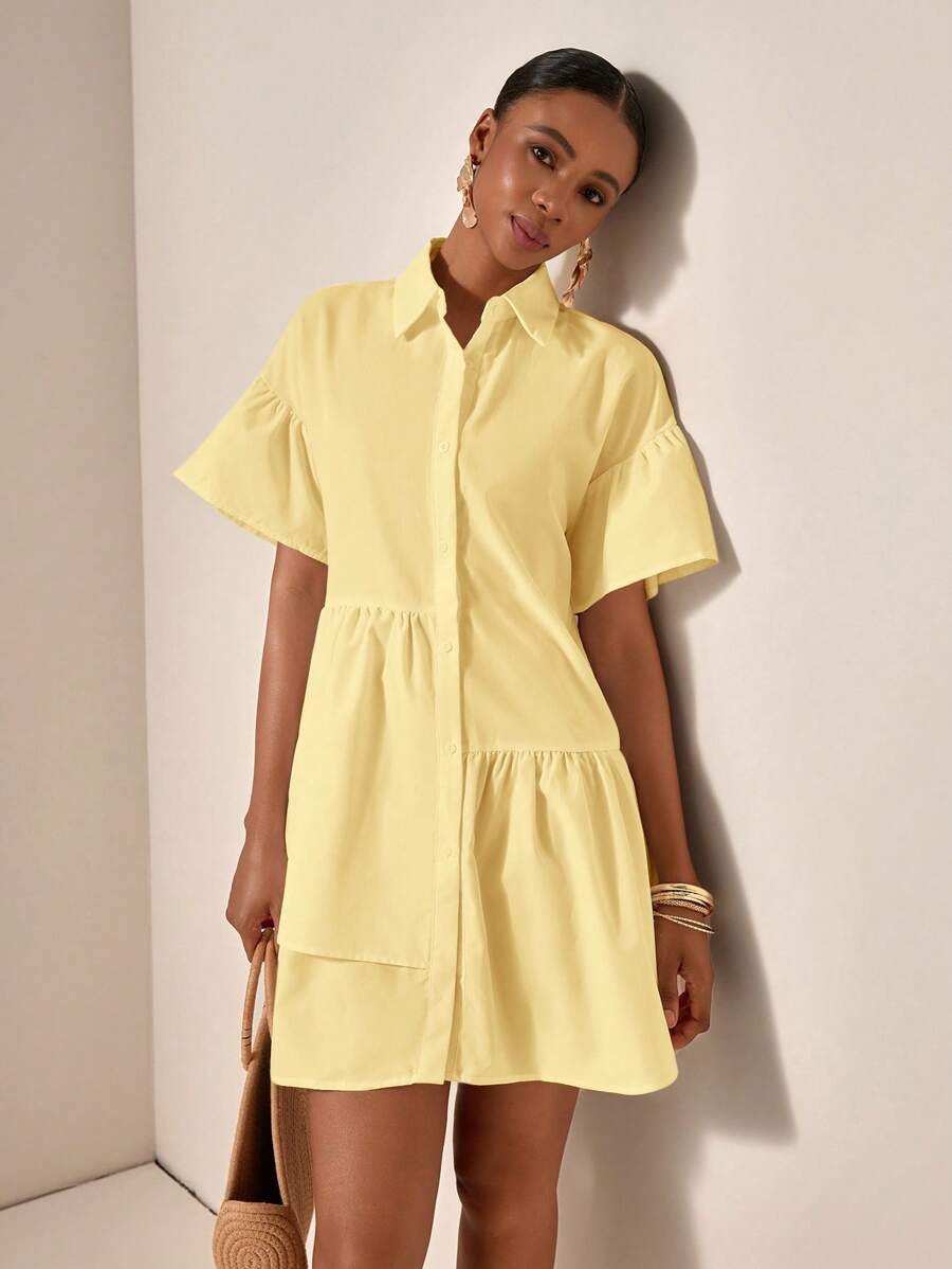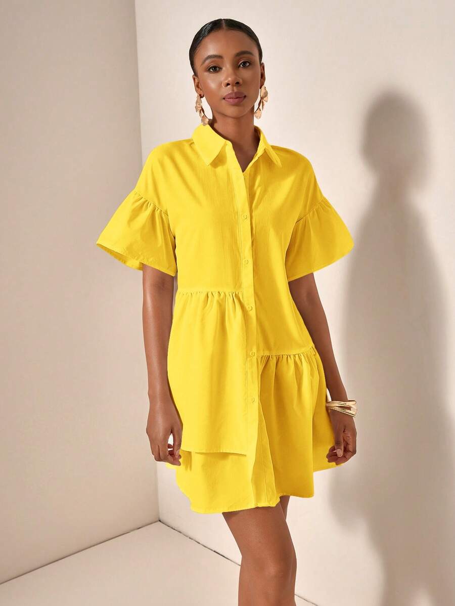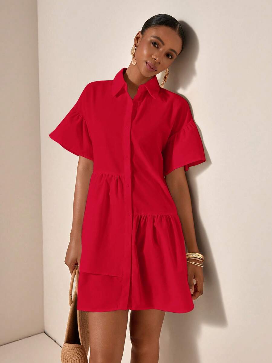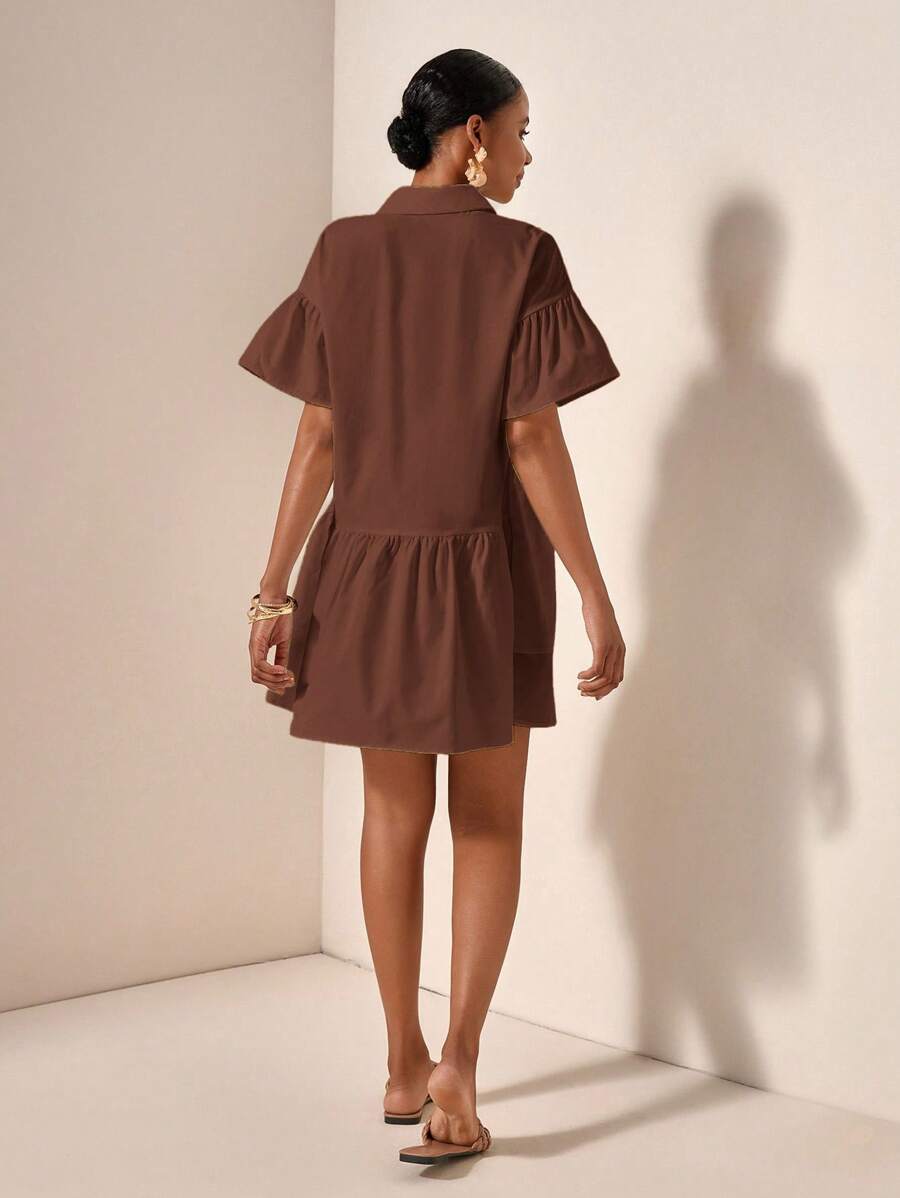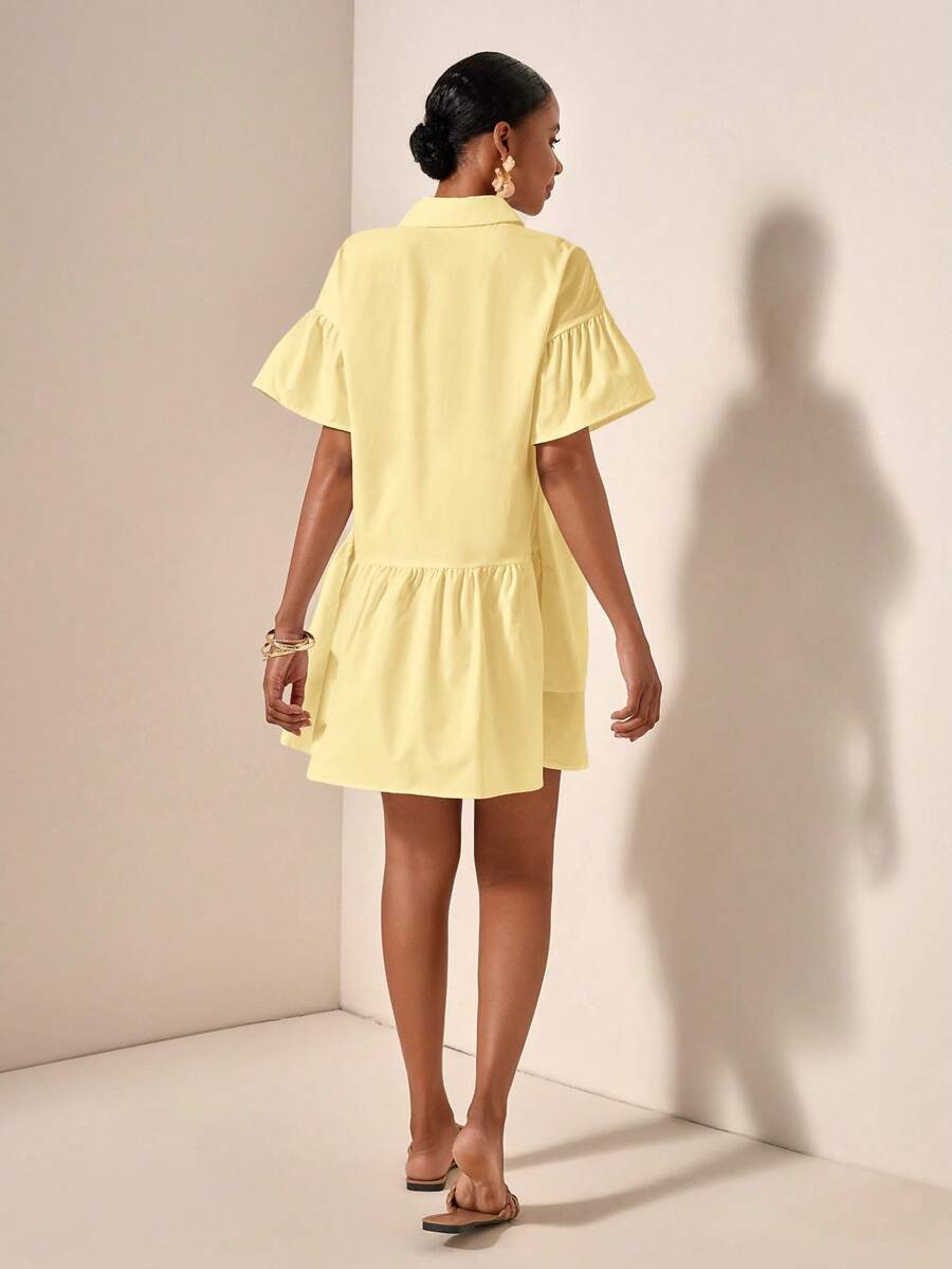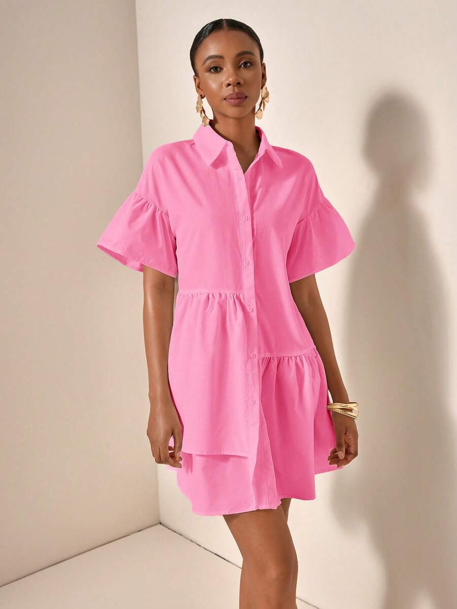 MIU Solid Color Front Button Ruffle Hem Short Sleeve Vacation Dress, Summer