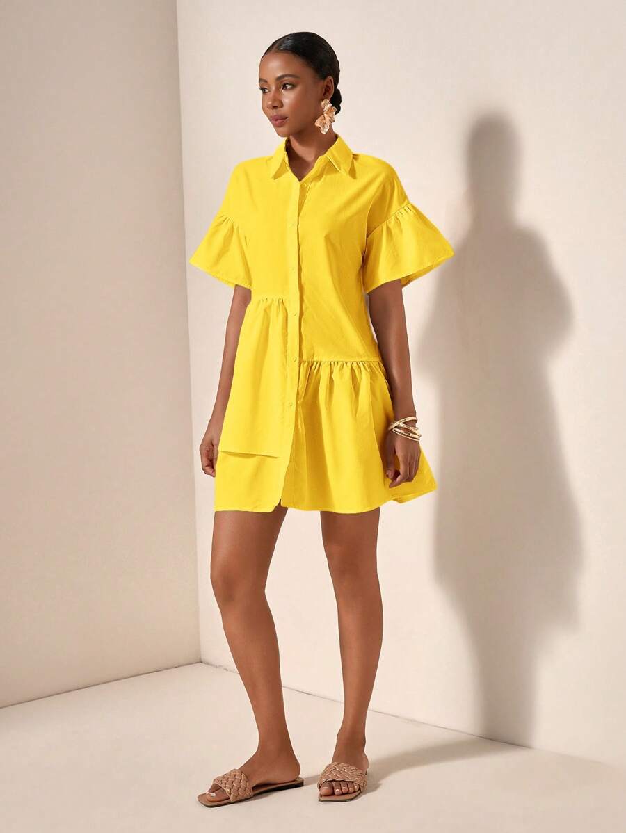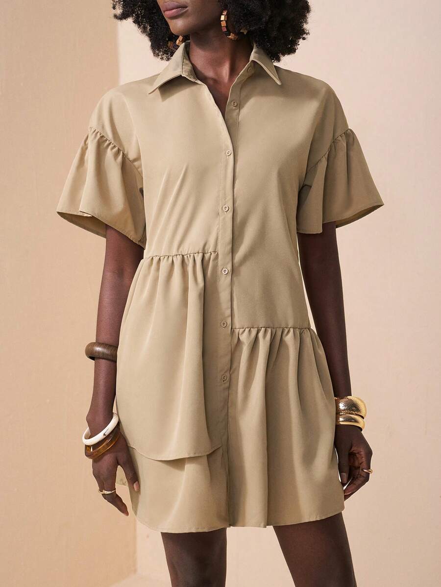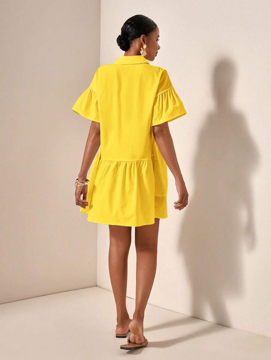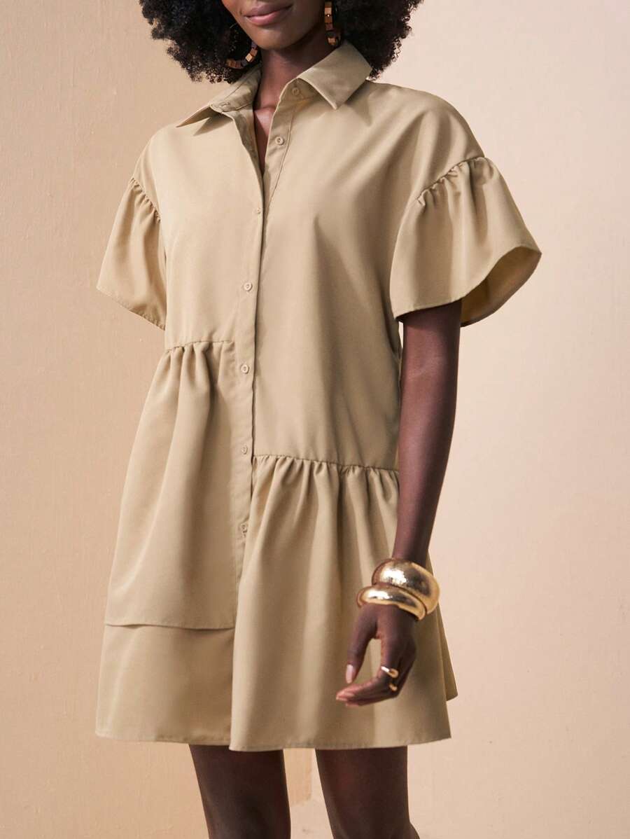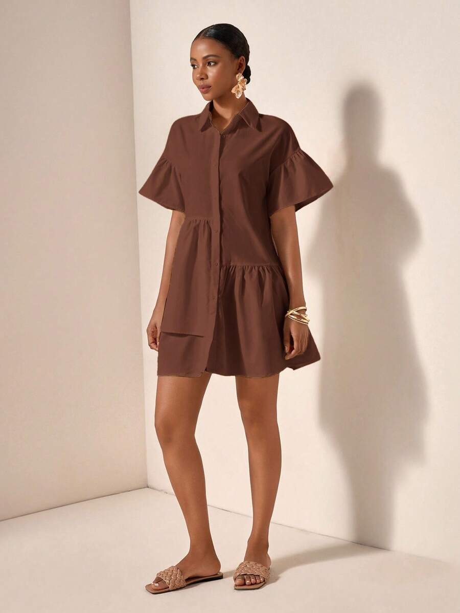 MIU Solid Color Front Button Ruffle Hem Short Sleeve Vacation Dress, Summer