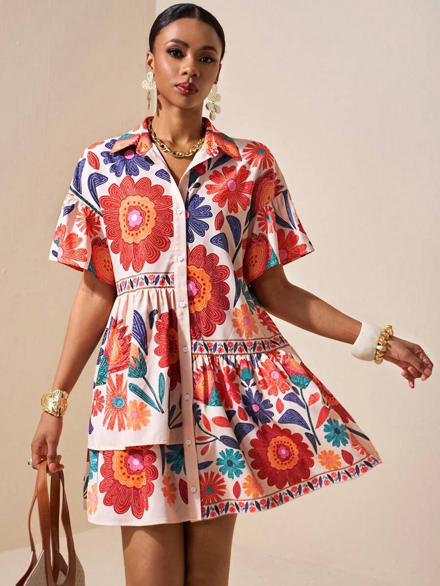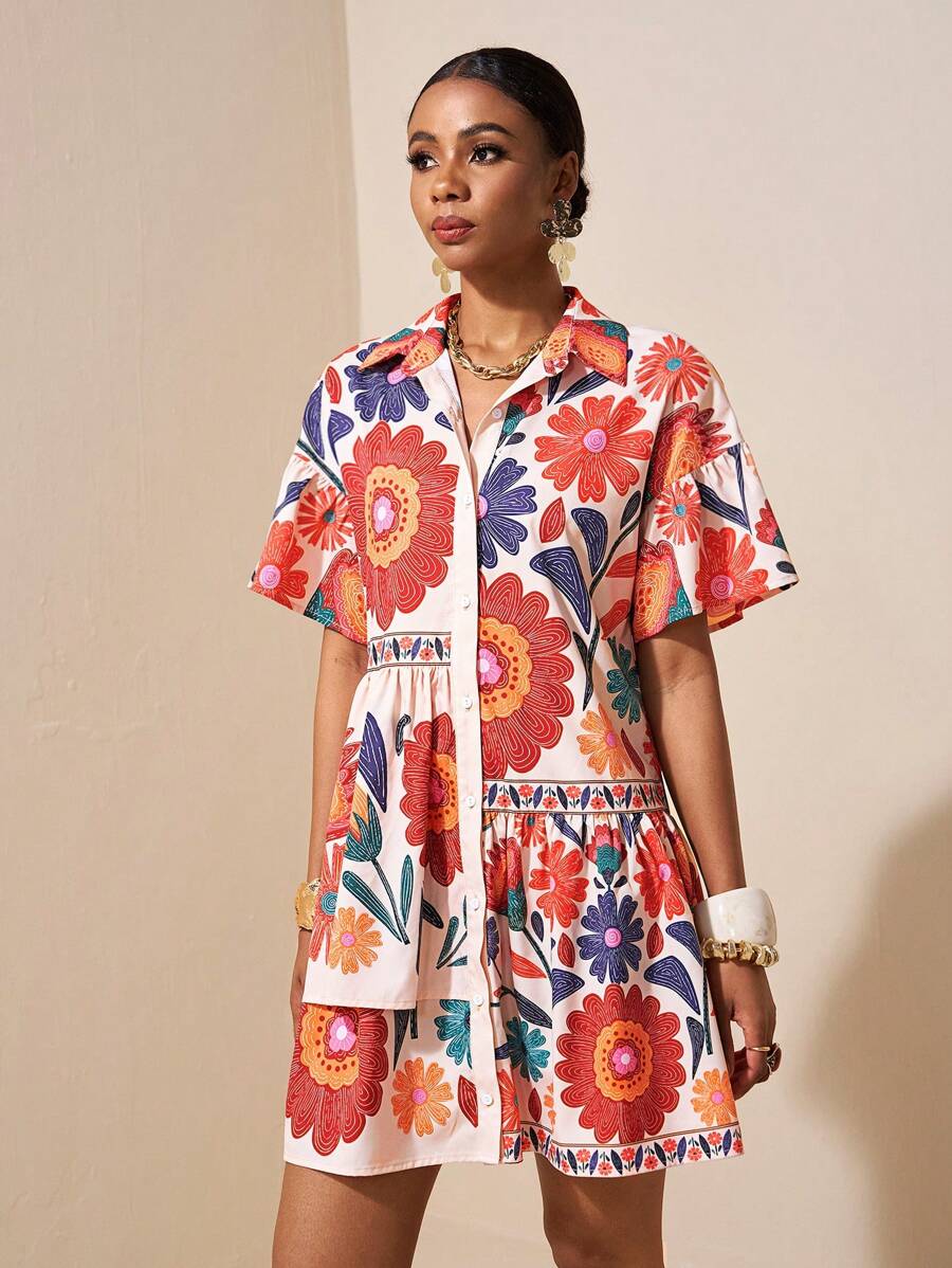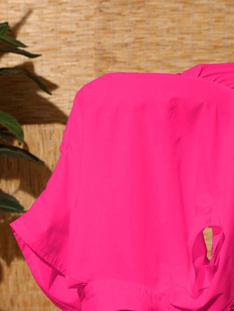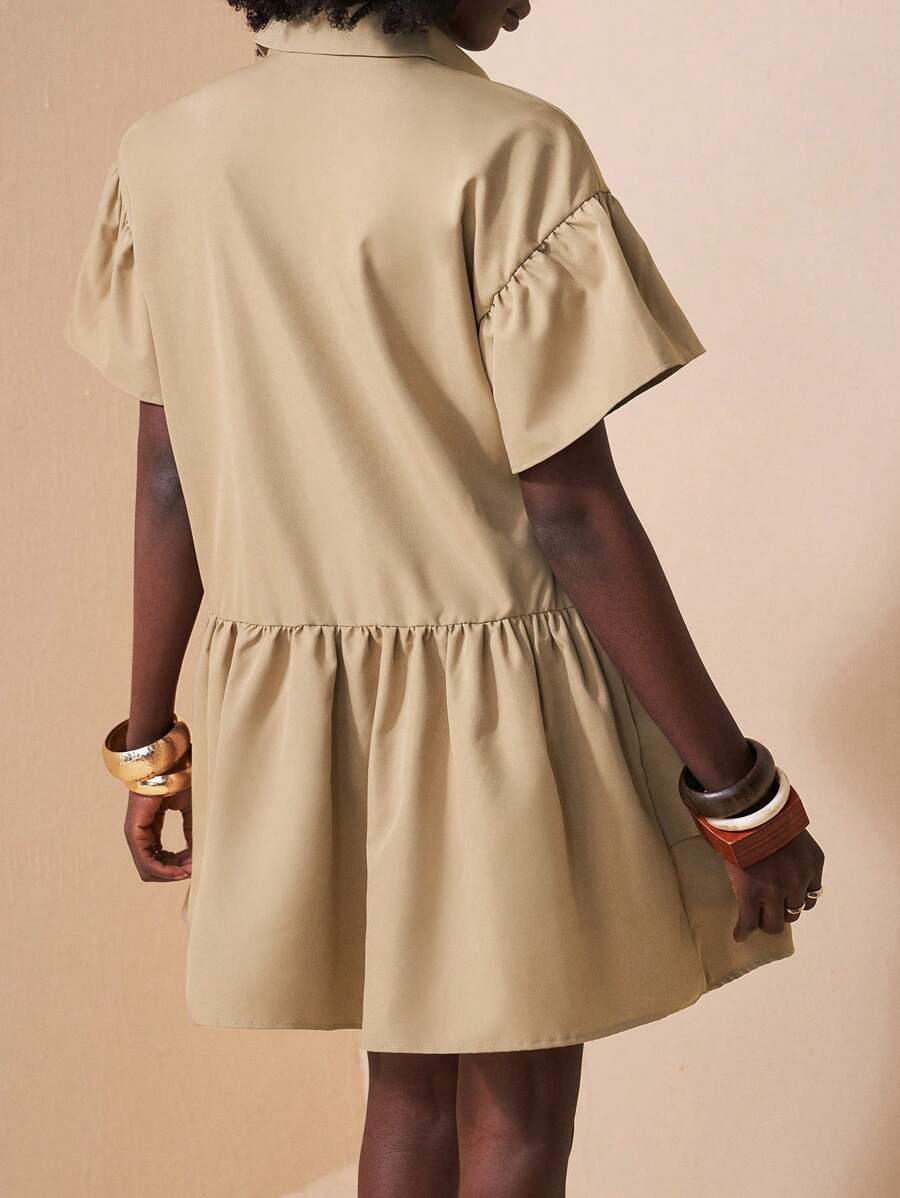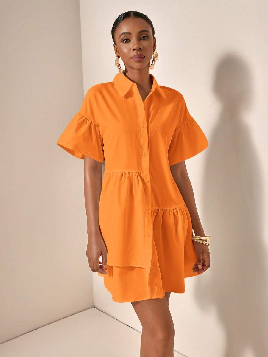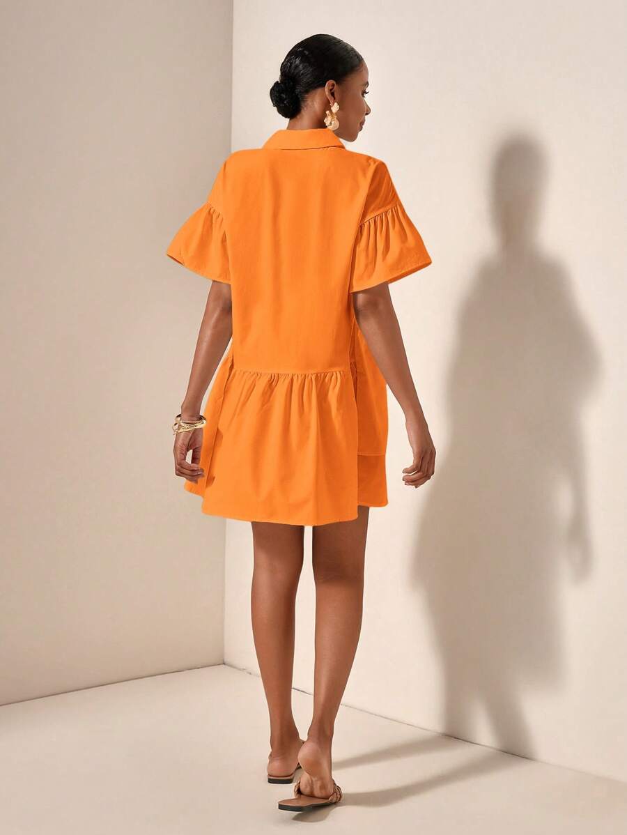 MIU Solid Color Front Button Ruffle Hem Short Sleeve Vacation Dress, Summer
