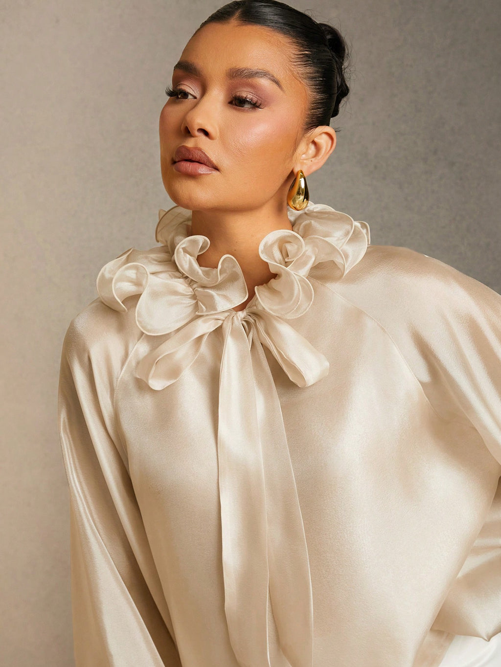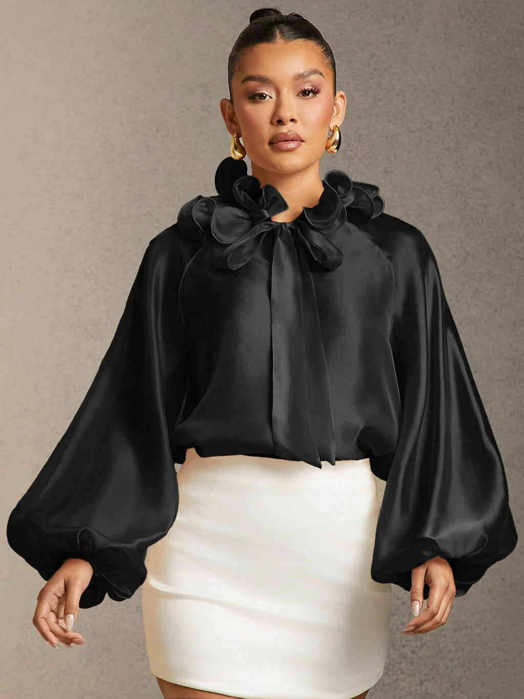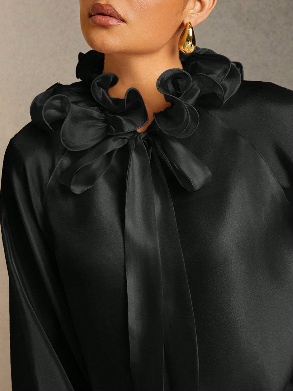 MIU Solid Color Ruffled Tie Neck Elegant Work Wear Long Sleeve Blouse