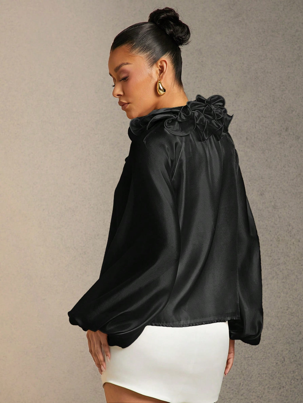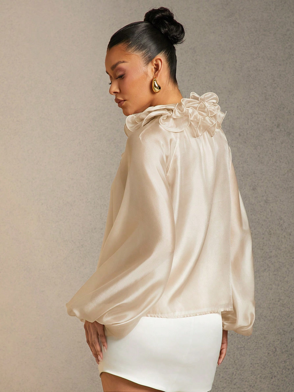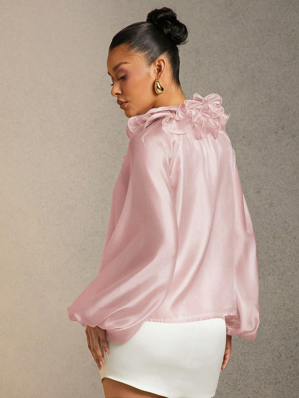 MIU Solid Color Ruffled Tie Neck Elegant Work Wear Long Sleeve Blouse
