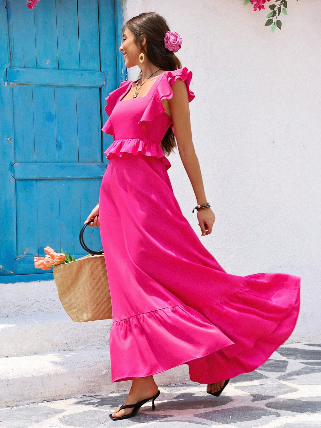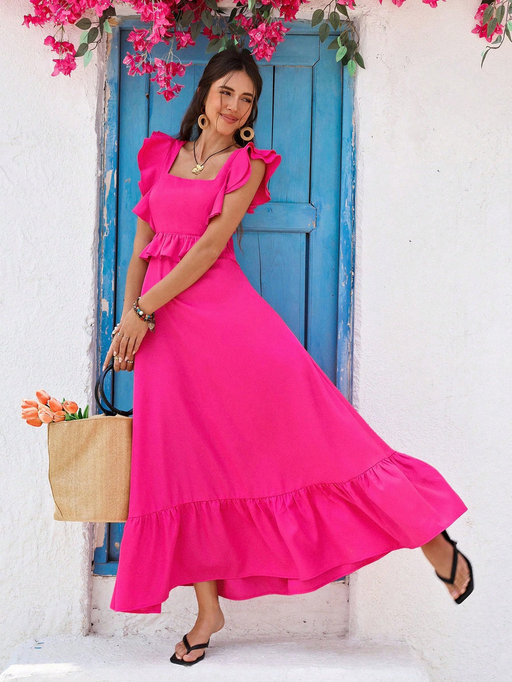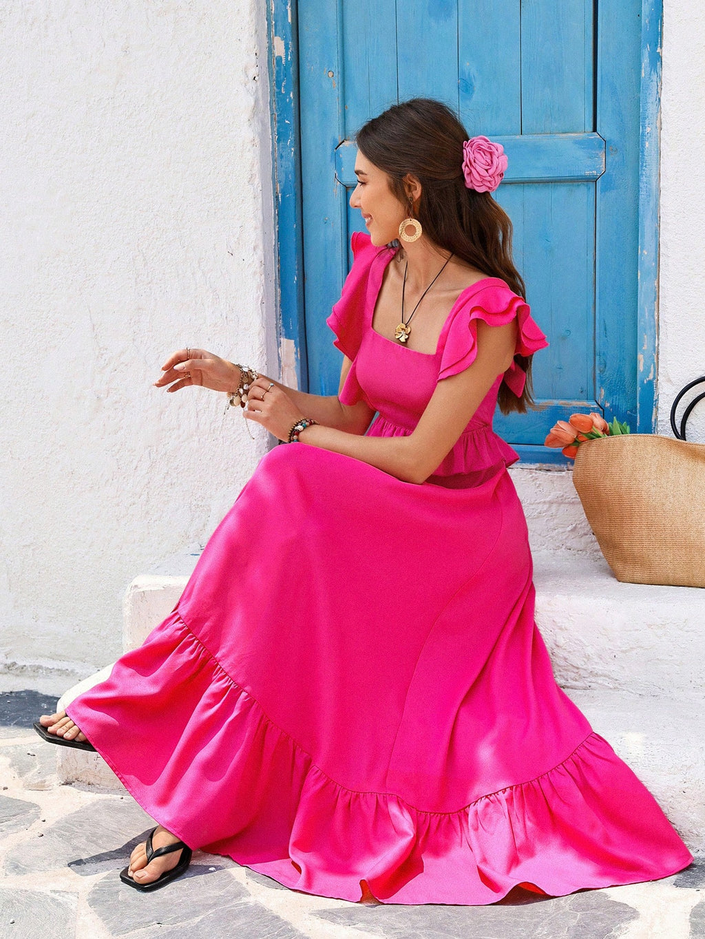 MIU Solid Color Woven Square Collar Hooded Sleeve Women's Dress, Women's Long Dresses, Women Vacation Dress