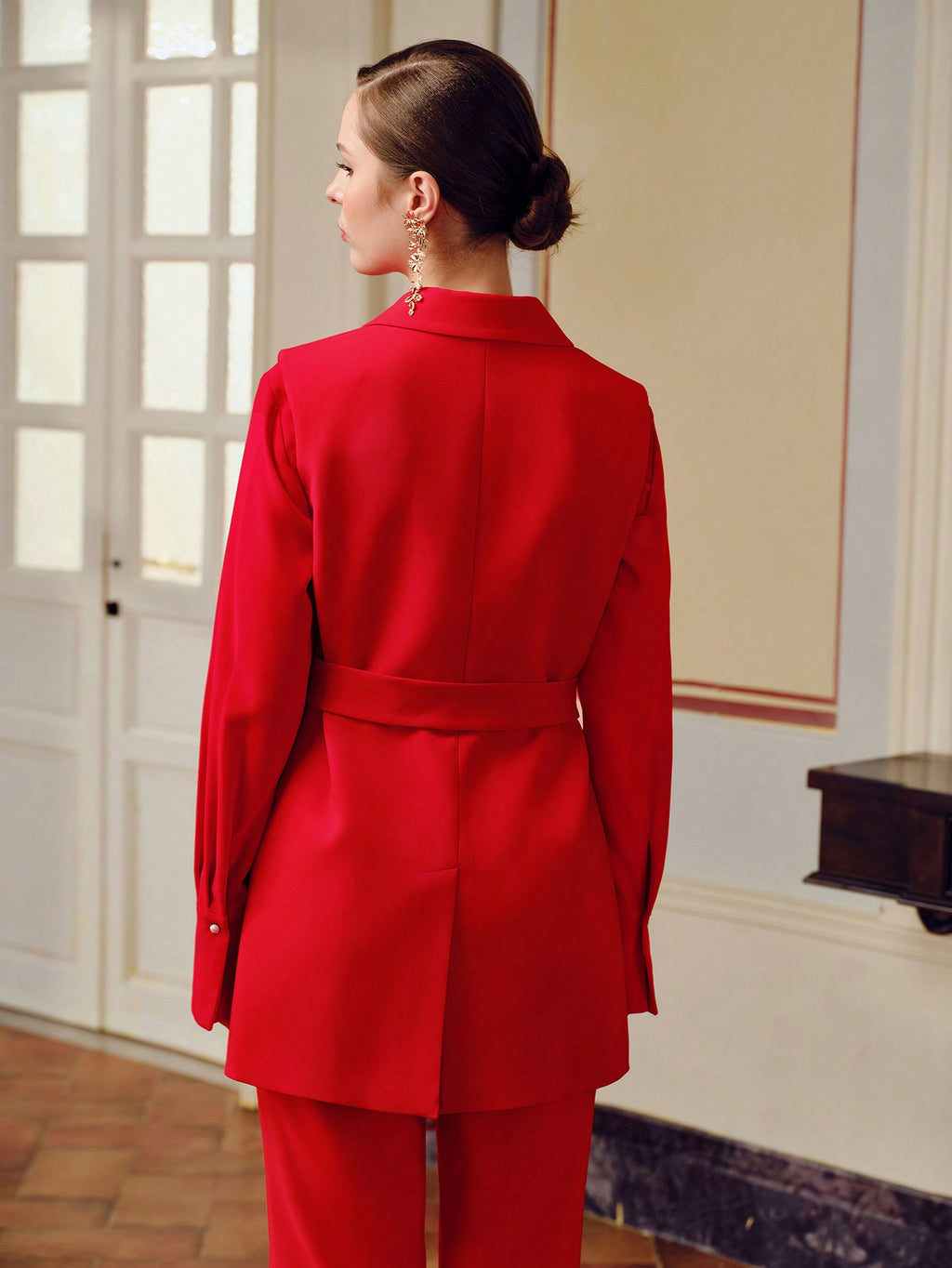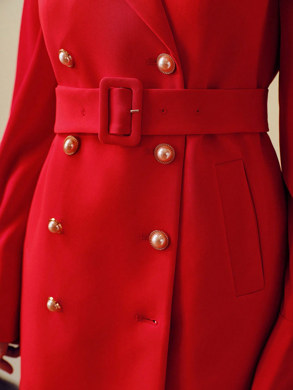 MIU SOLID PEAK COLLAR DOUBLE BREASTED PLACKET BUCKLE BELTED BLAZER