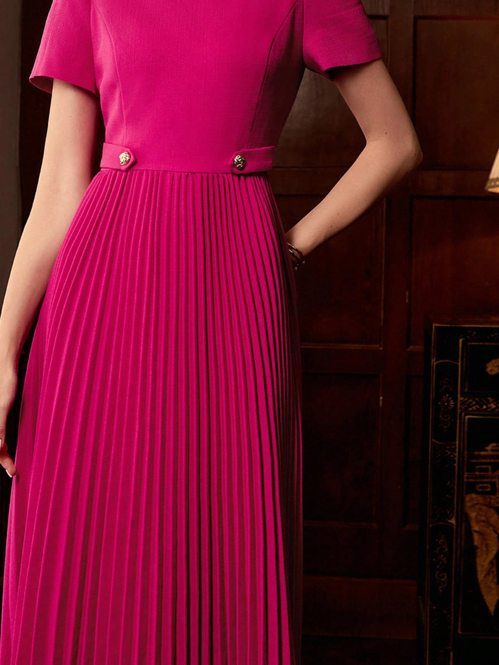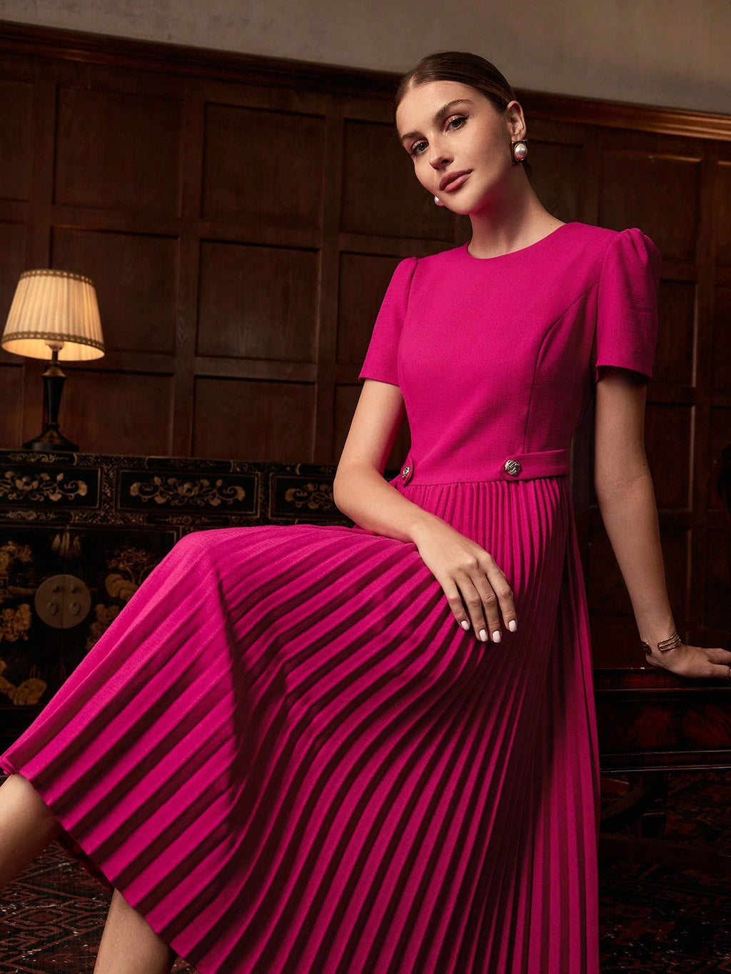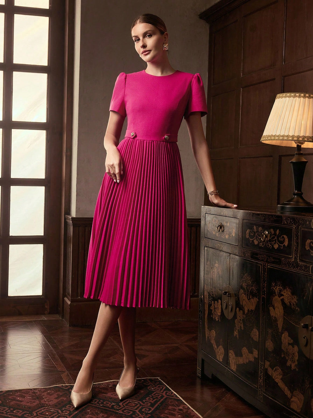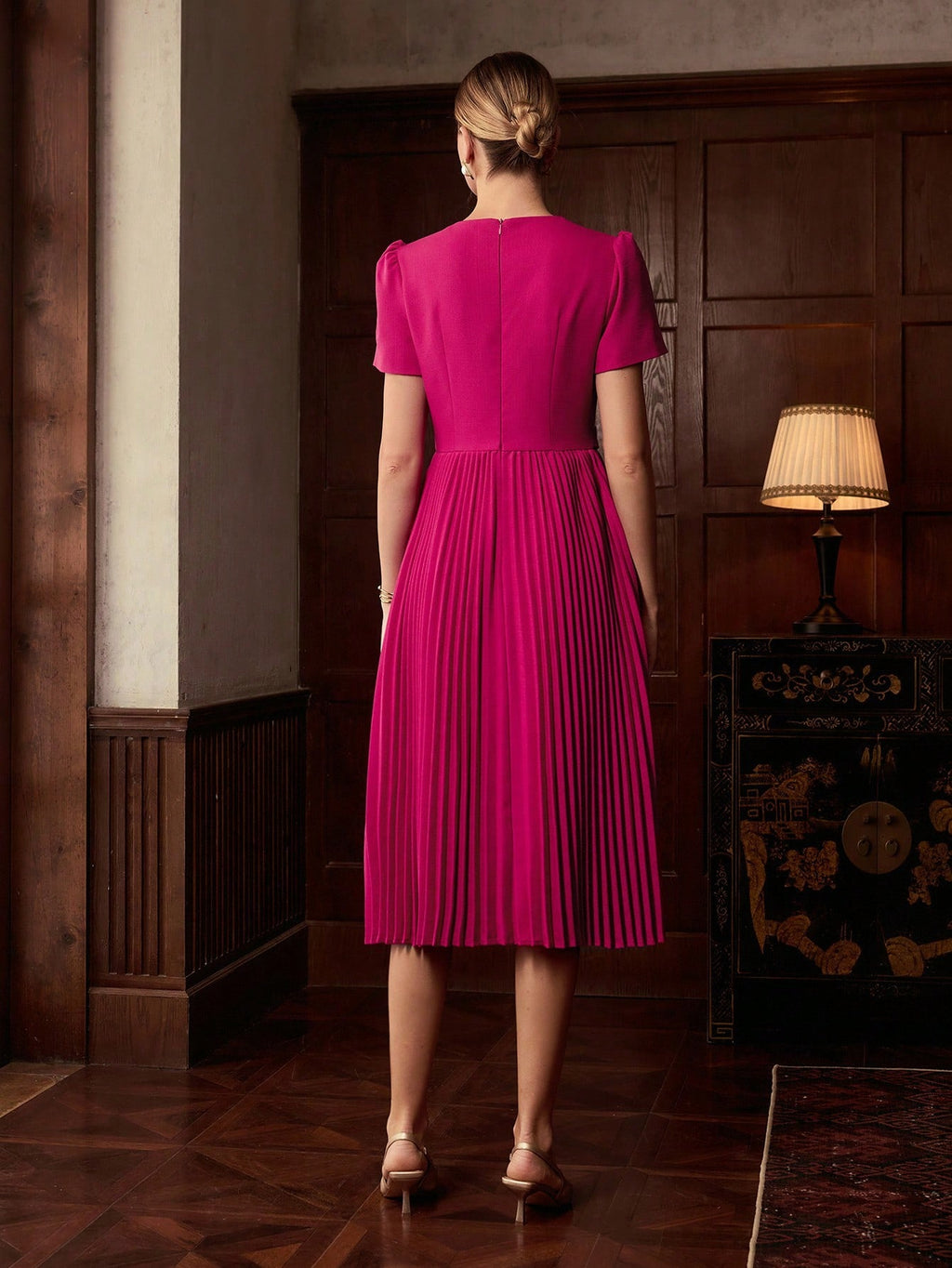 MIU SOLID PUFF SLEEVE PLEATED HEM MIDI DRESS