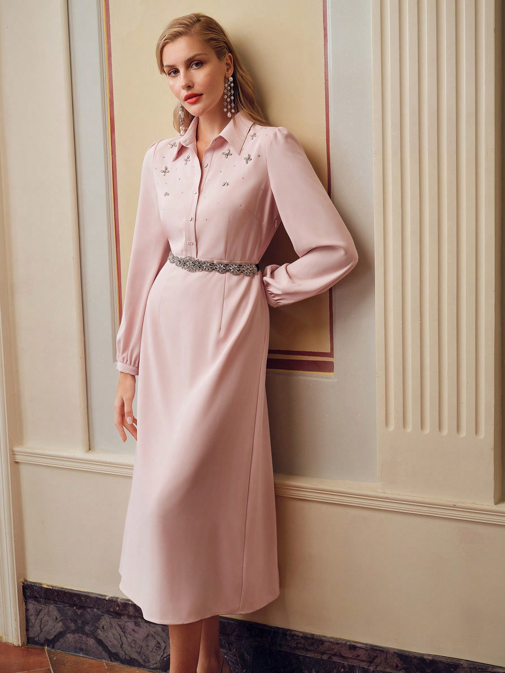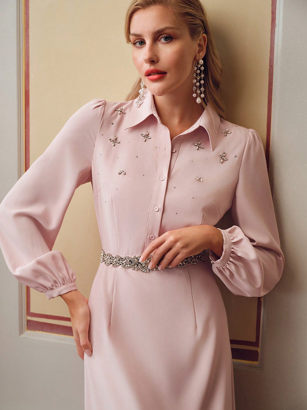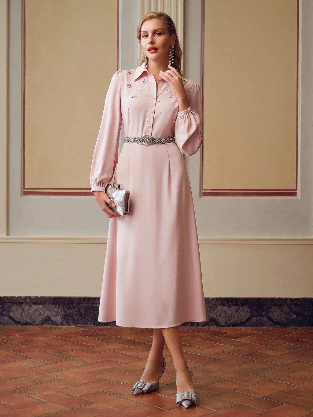 MIU SOLID RHINESTONE DETAIL LANTERN SLEEVE MIDI DRESS WITHOUT BELT