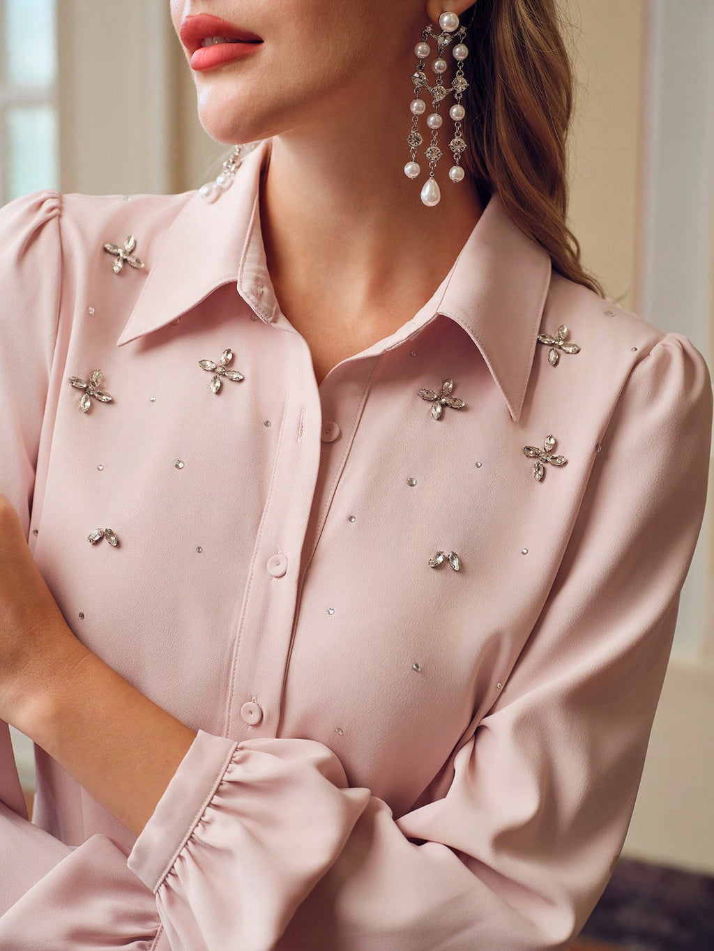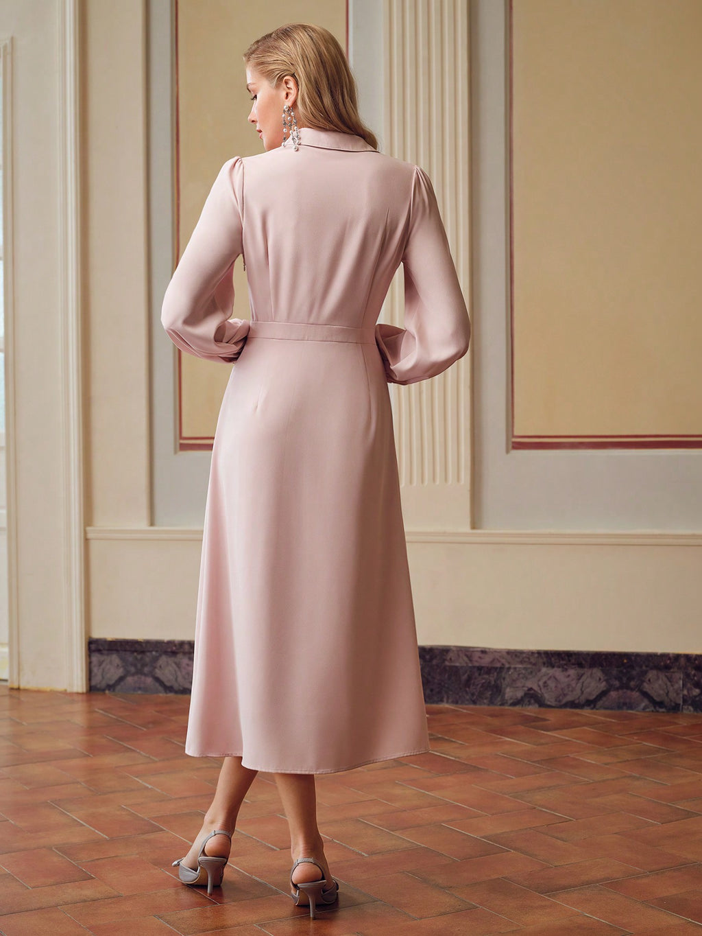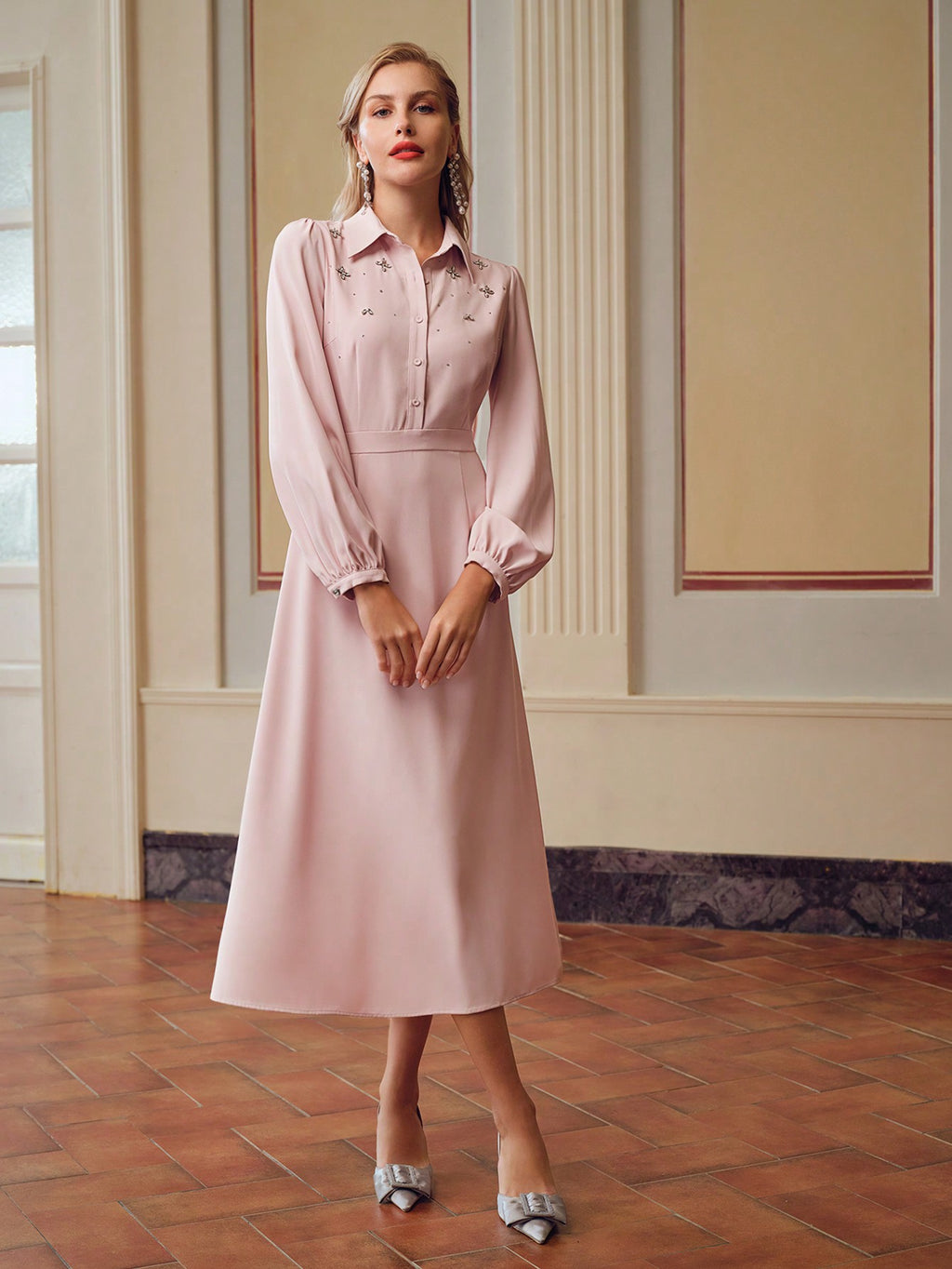MIU SOLID RHINESTONE DETAIL LANTERN SLEEVE MIDI DRESS WITHOUT BELT