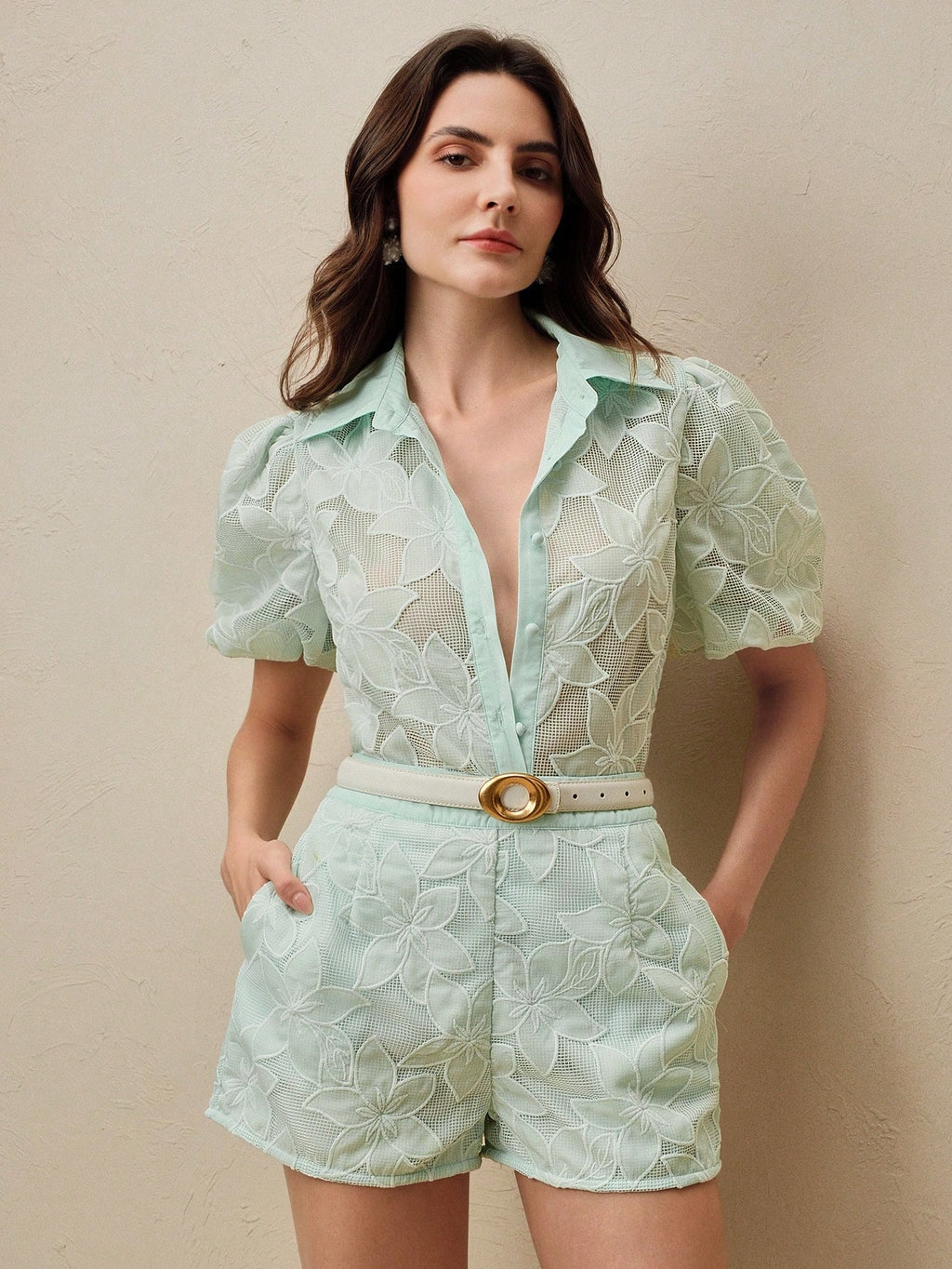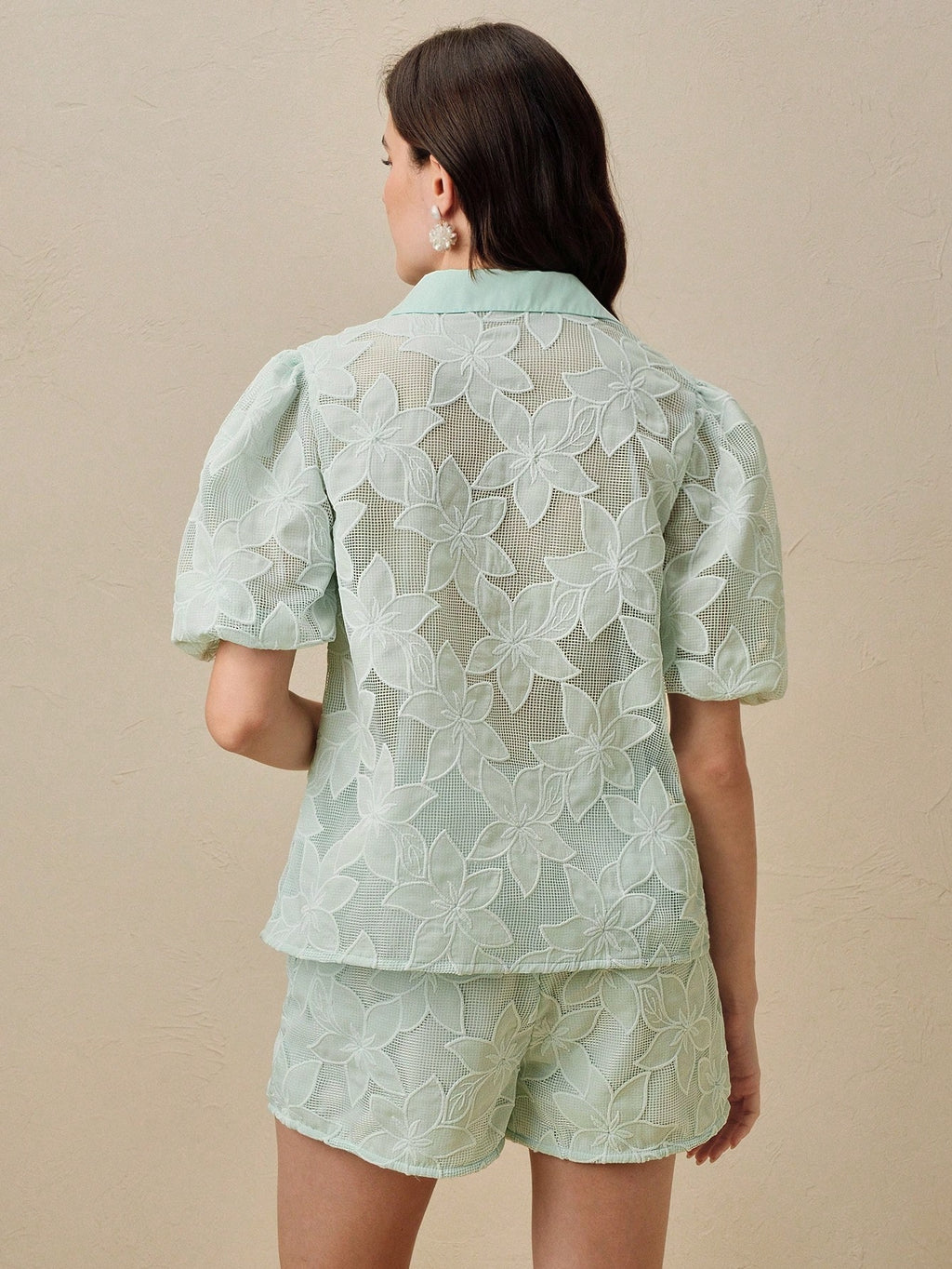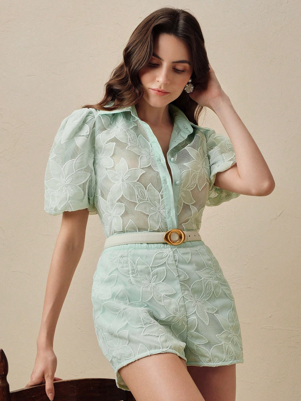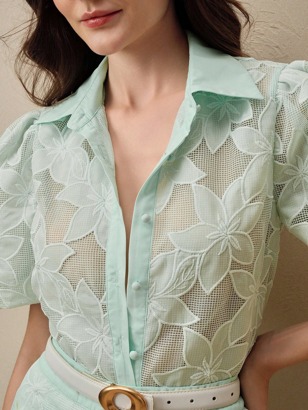 MIU Spring And Summer Fashion Business Casual Lace Bubble Short Sleeve Shirt