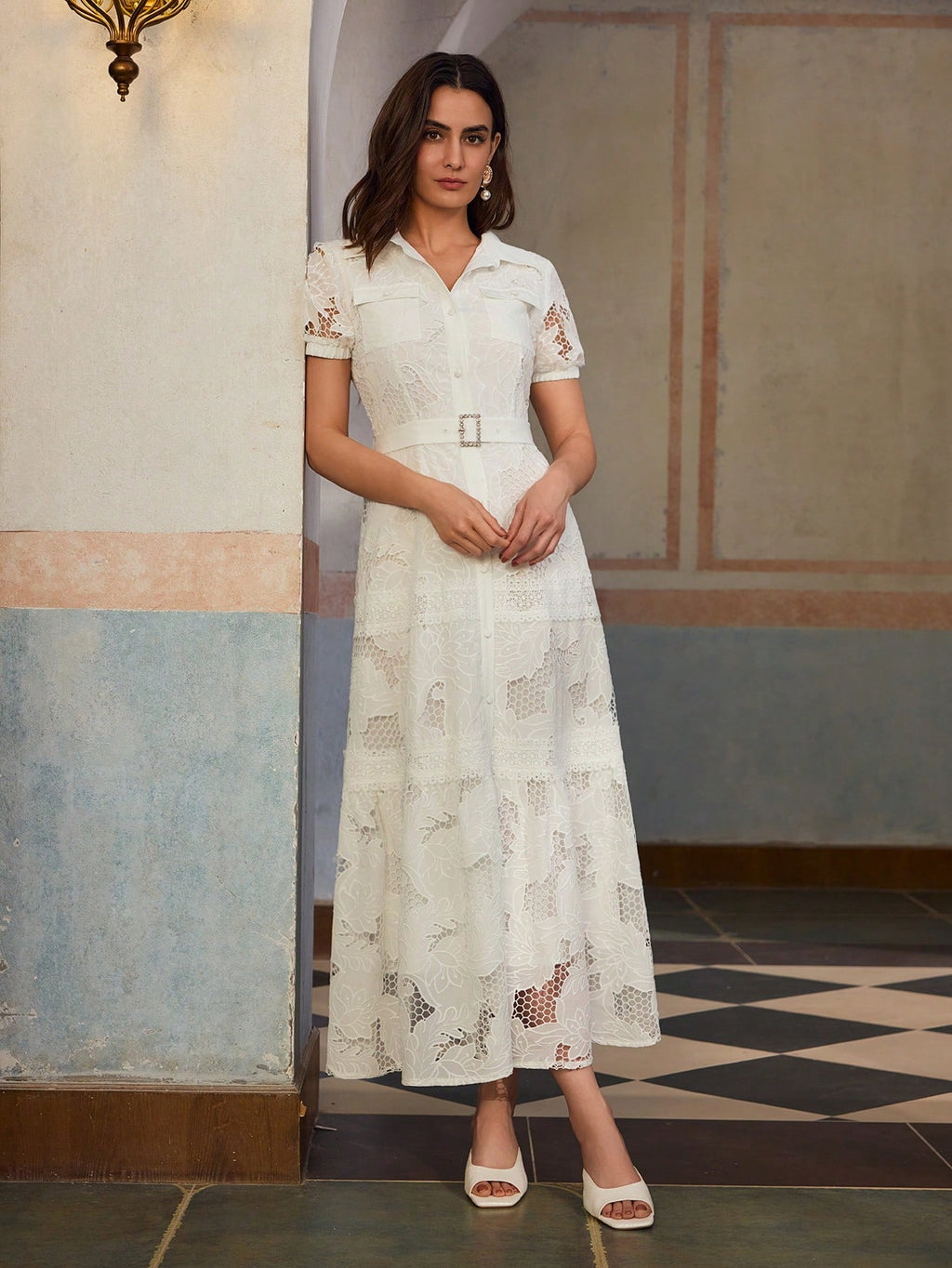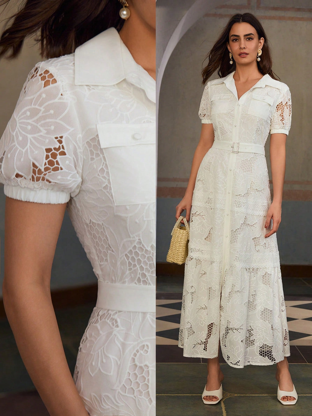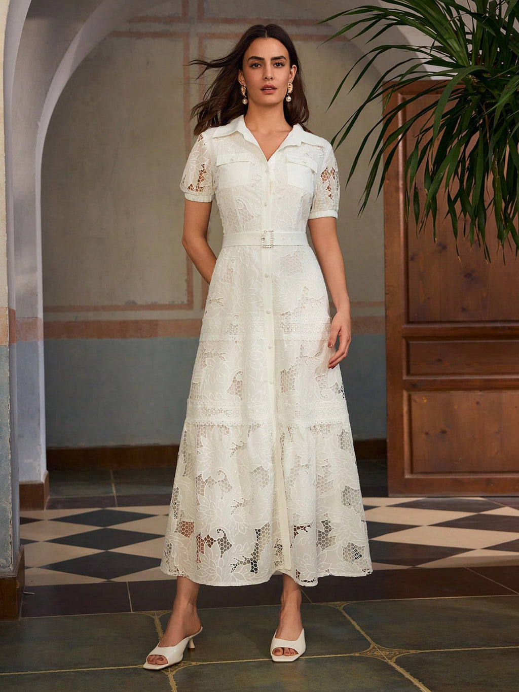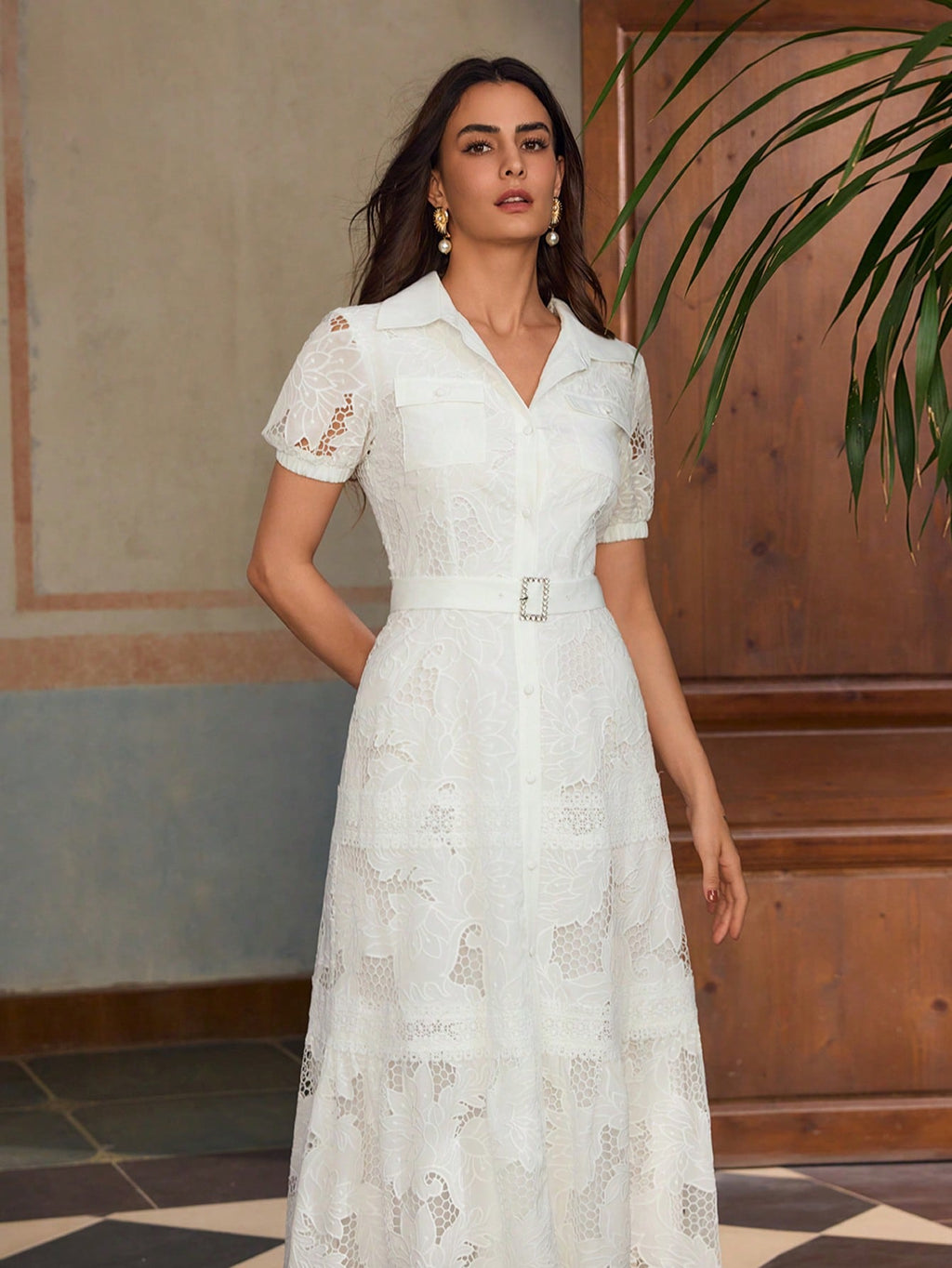 MIU Spring/Summer Vacation White Dress, Lace Embroidery Patchwork Utility Pockets Collared Short Sleeve Dress