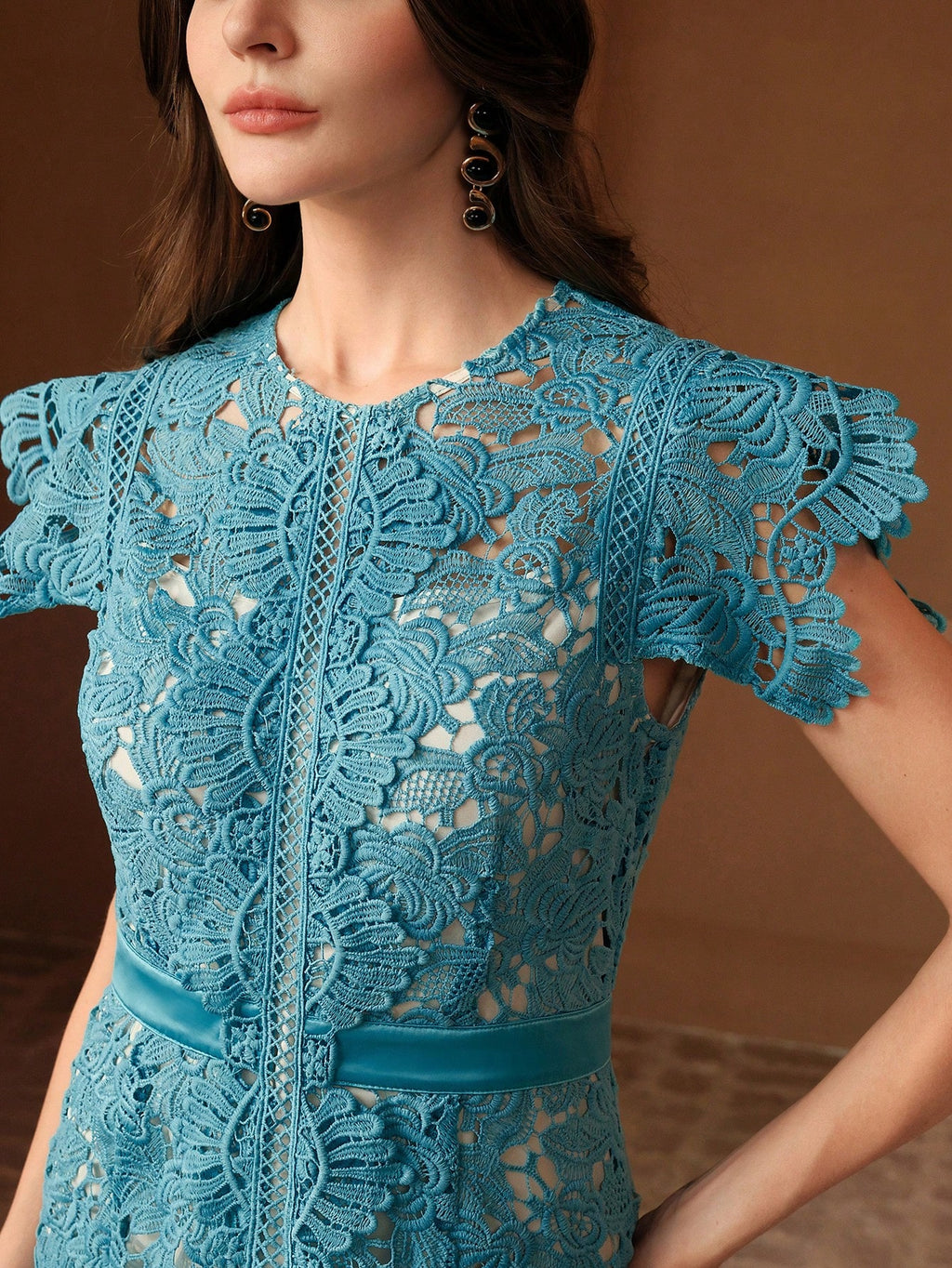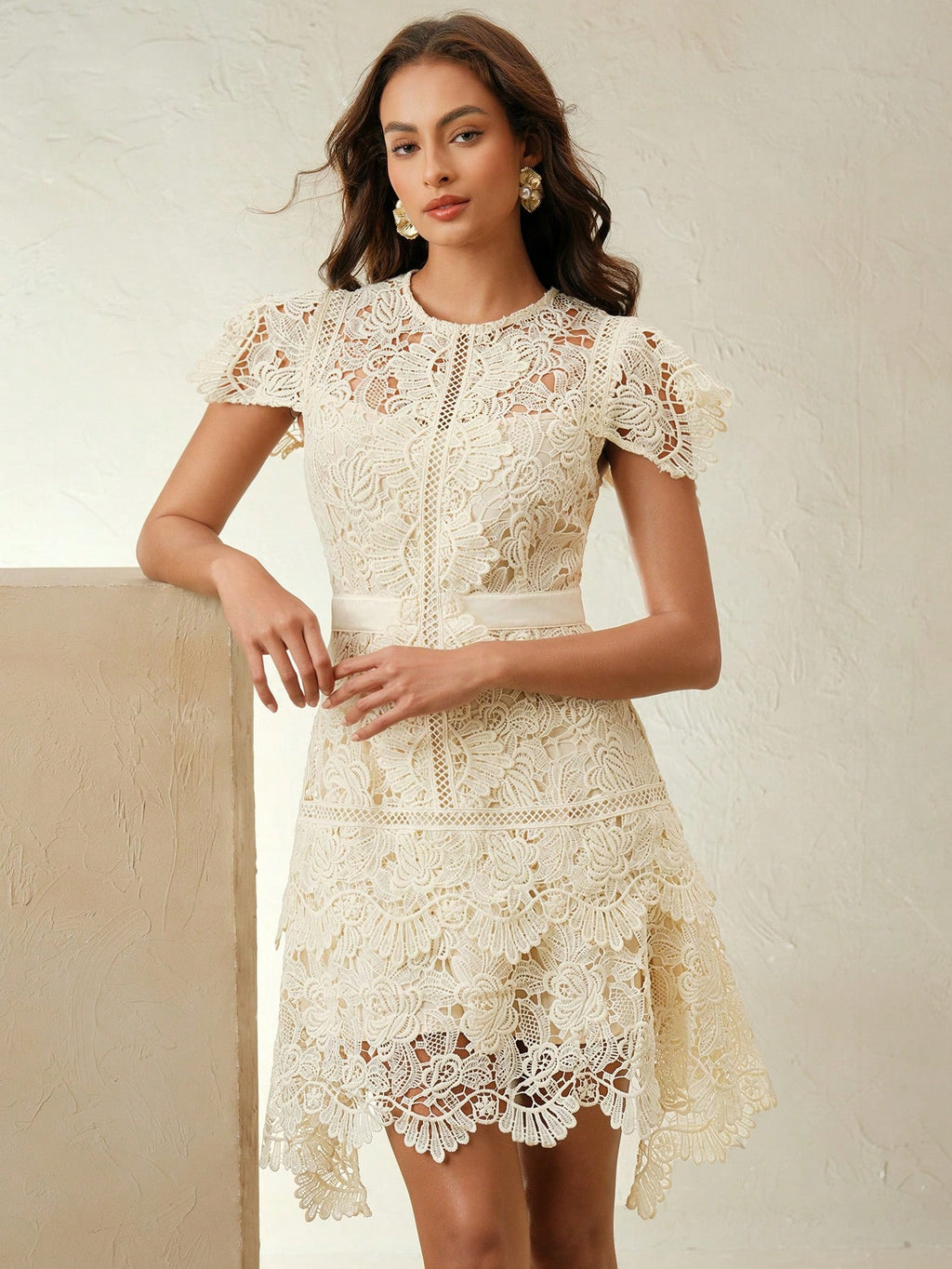 MIU Spring, Vacation, Festival Women's Elegant Lace Hollow Embroidered New Summer Patchwork Floral Round Neck Short Sleeve Dress