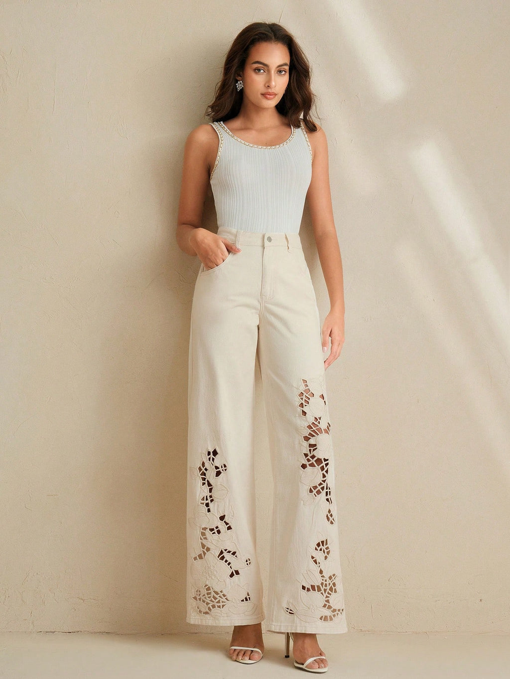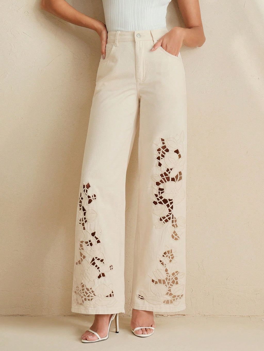 MIU Straight-Cut Embroidered Perforated Mustard Yellow Women Jeans