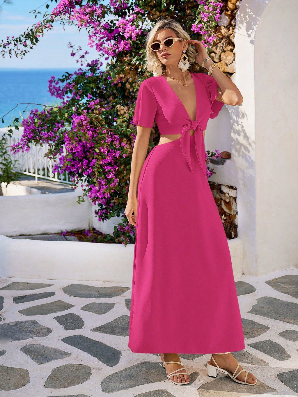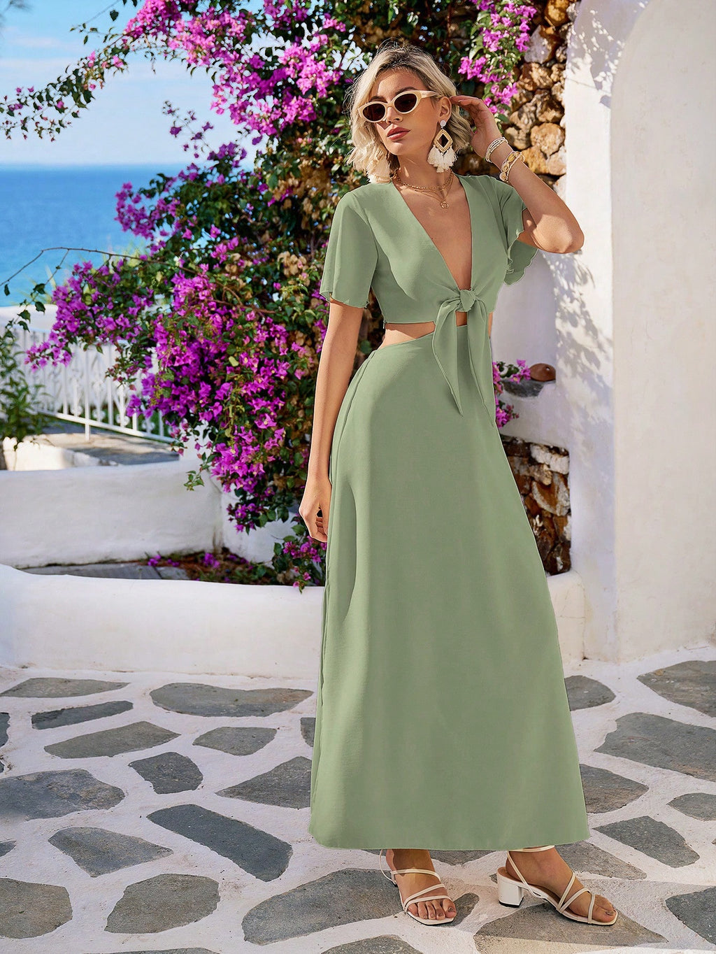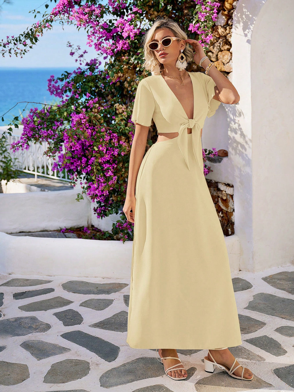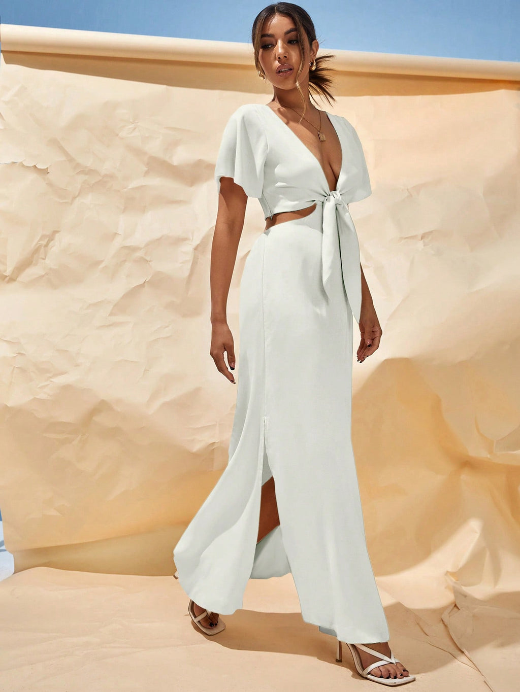 MIU Summer Beach Tie Front Deep V Neck Cutout Waist Split Hem Maxi Dress,White Graduation Dress