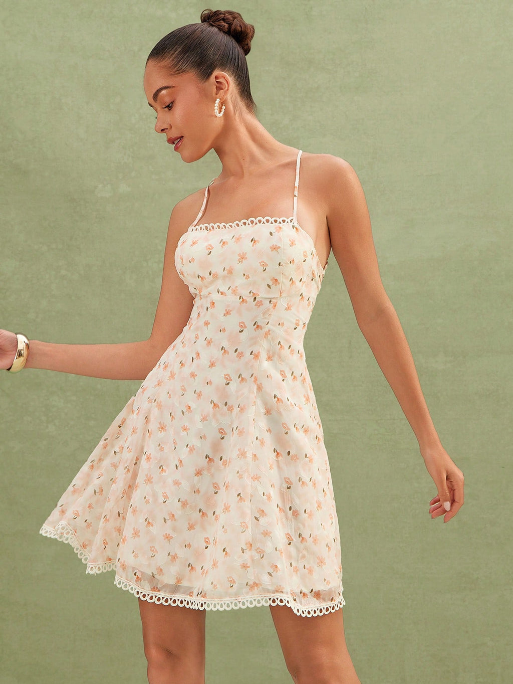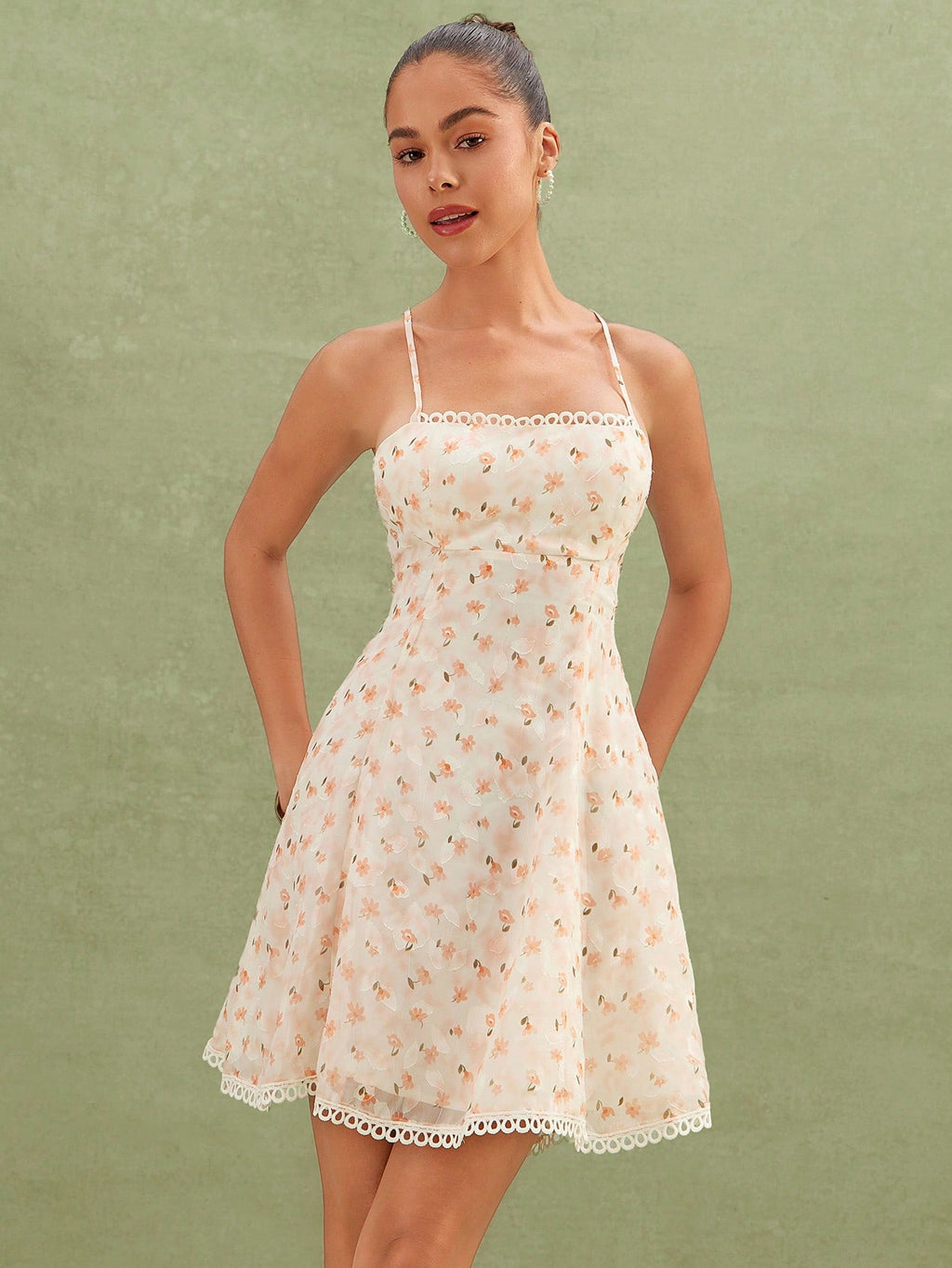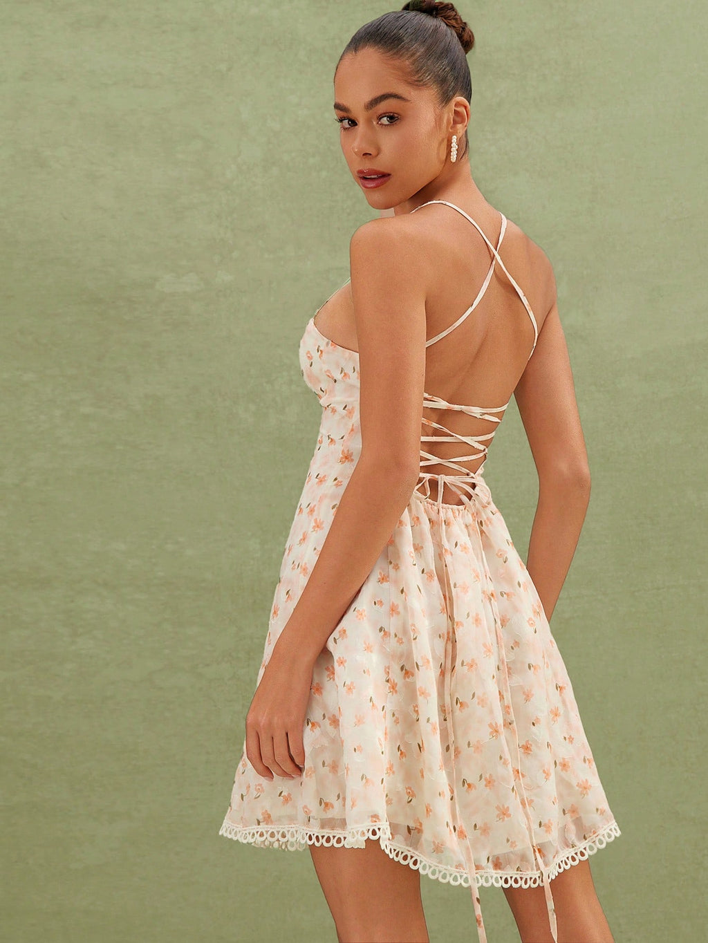 MIU Summer Floral Lace Up Back Mini Vacation Dress, Vacation Outfits Woman