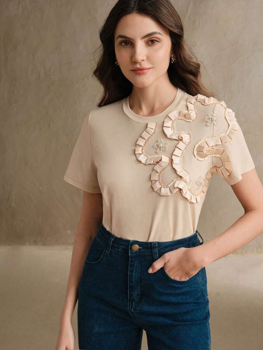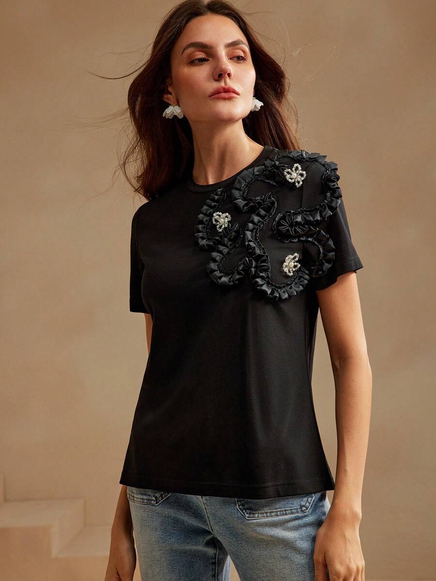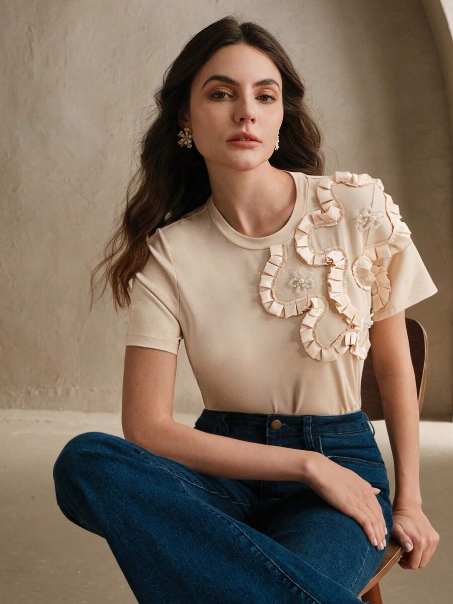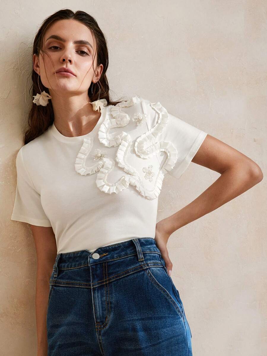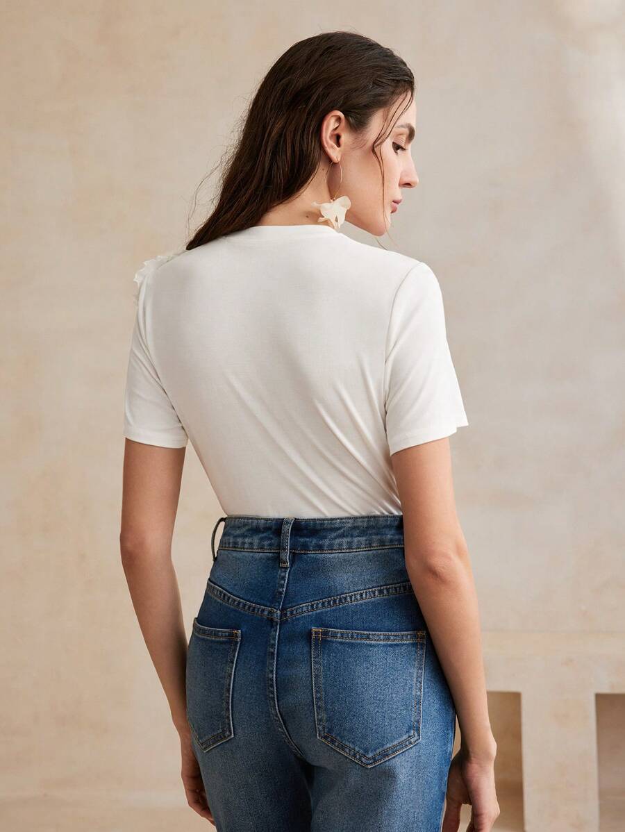 MIU Urban Blue Elasticized 3D Flower Short Sleeve T-Shirt For Women, Spring Summer