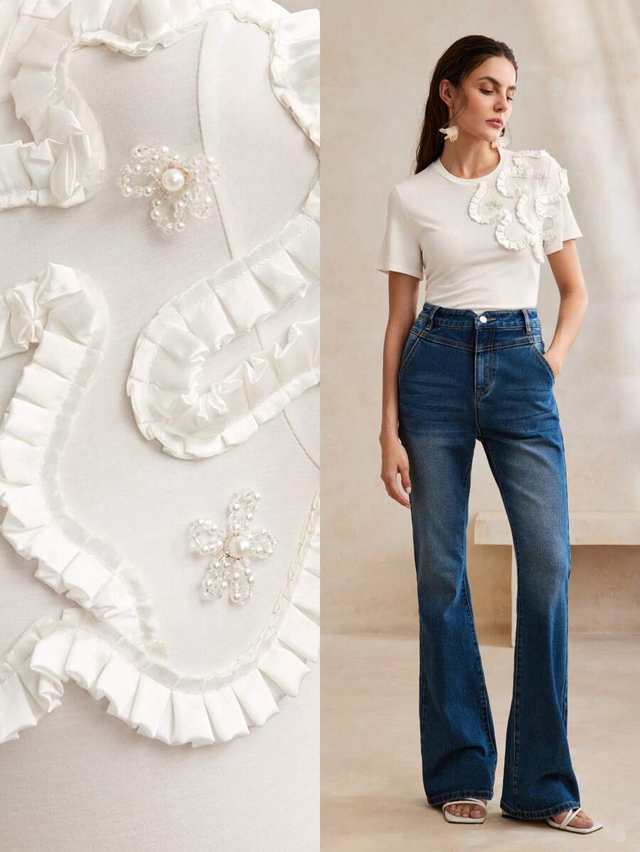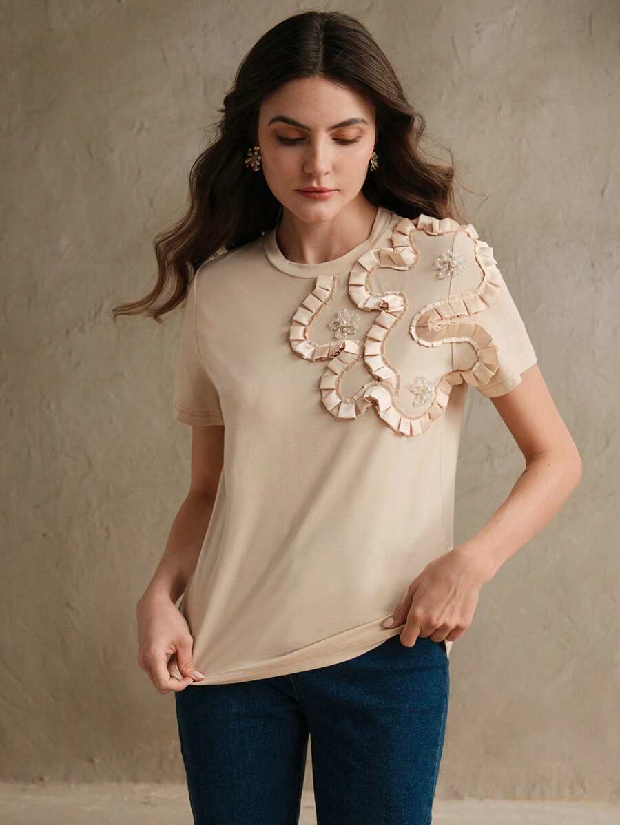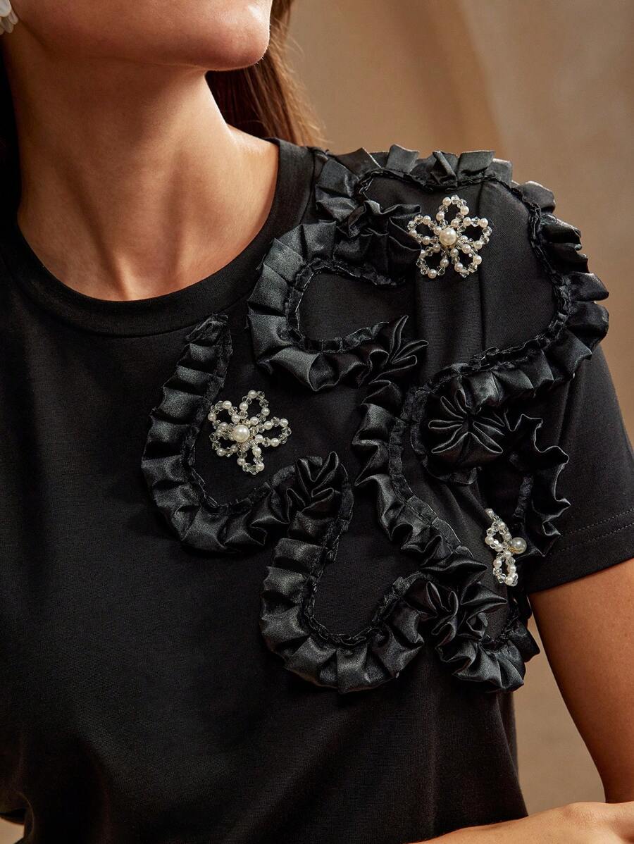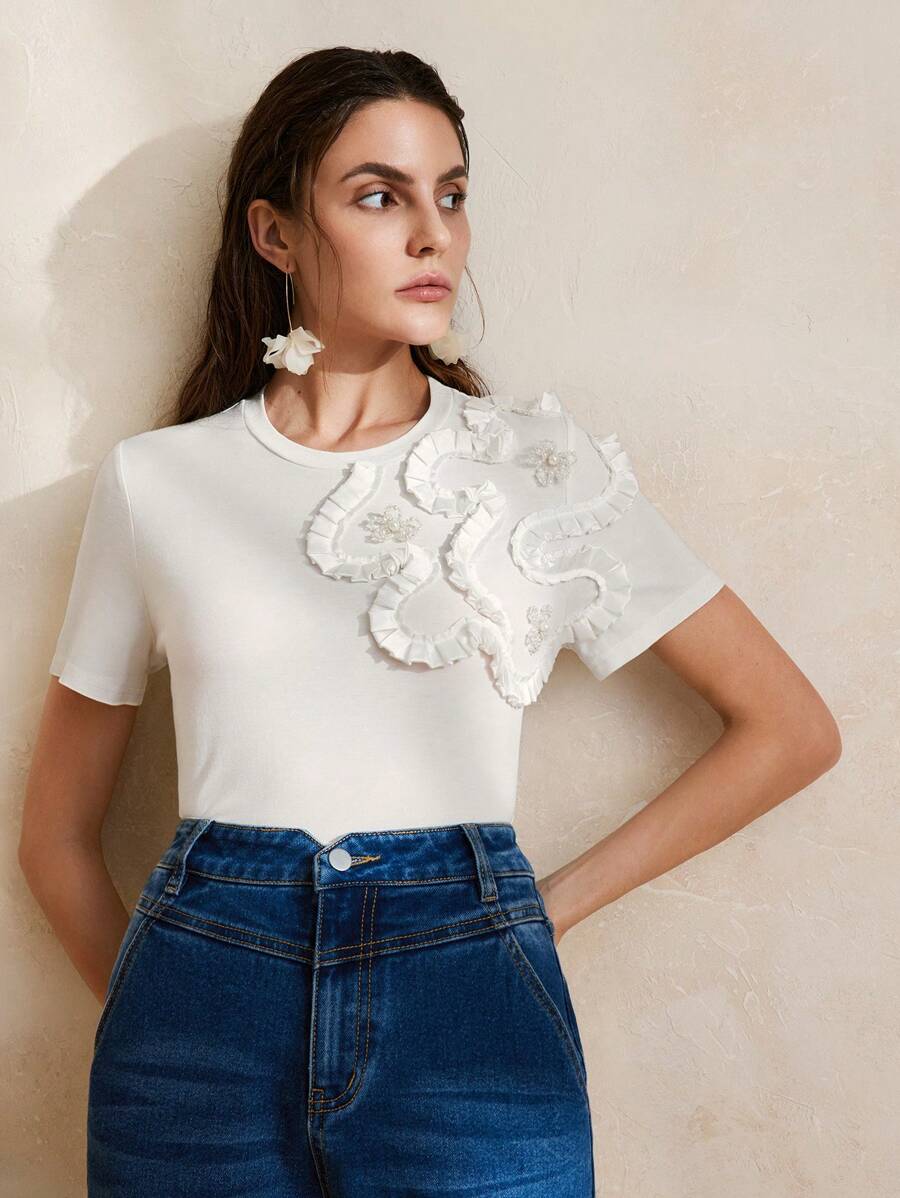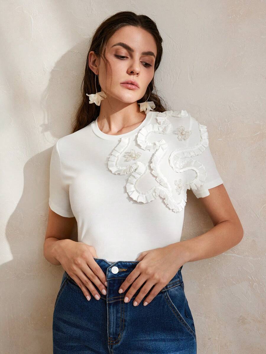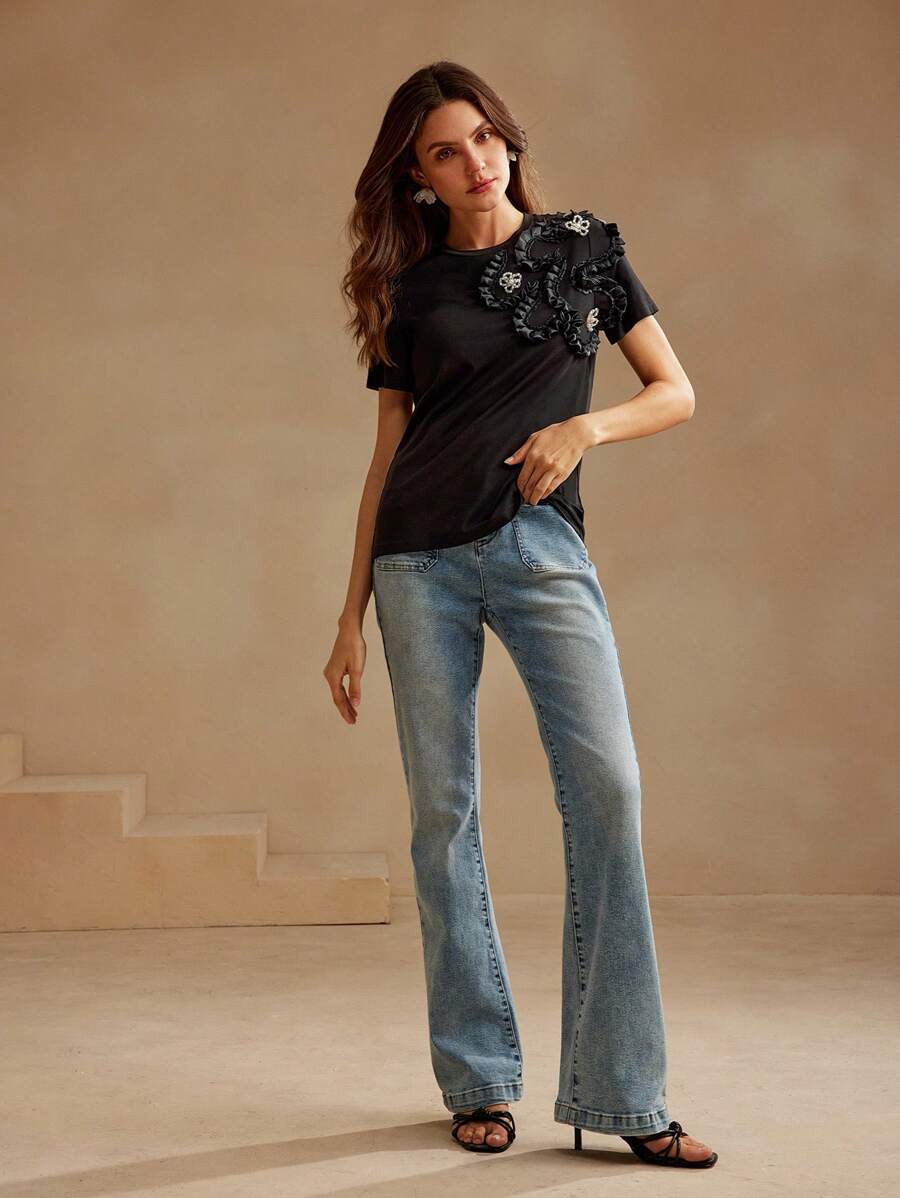 MIU Urban Blue Elasticized 3D Flower Short Sleeve T-Shirt For Women, Spring Summer