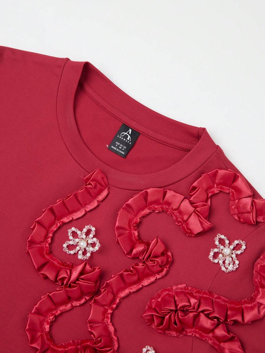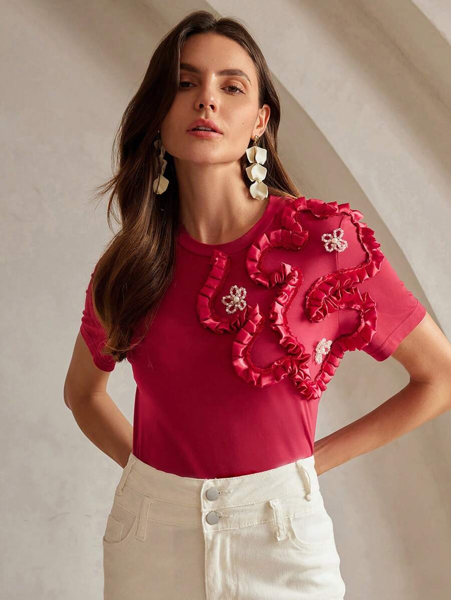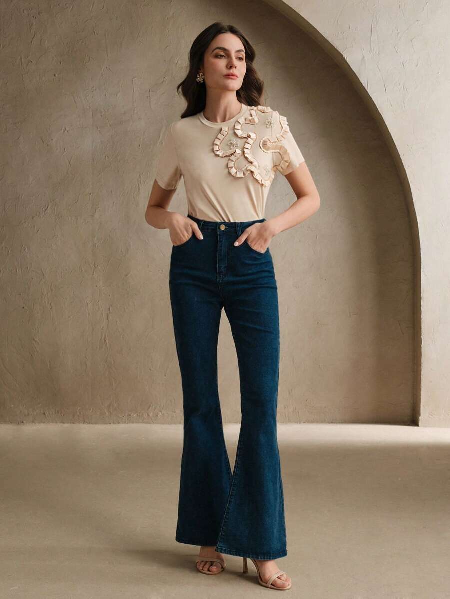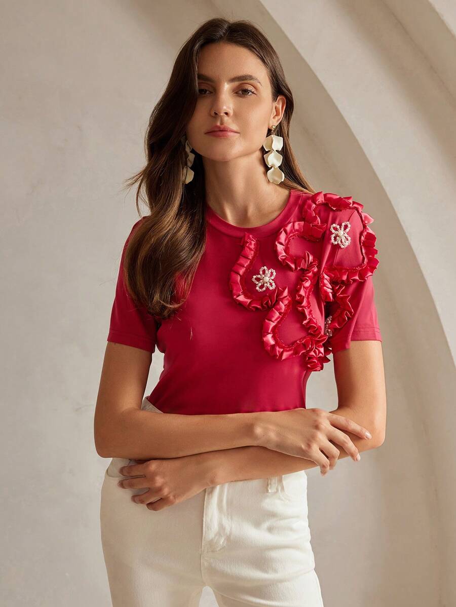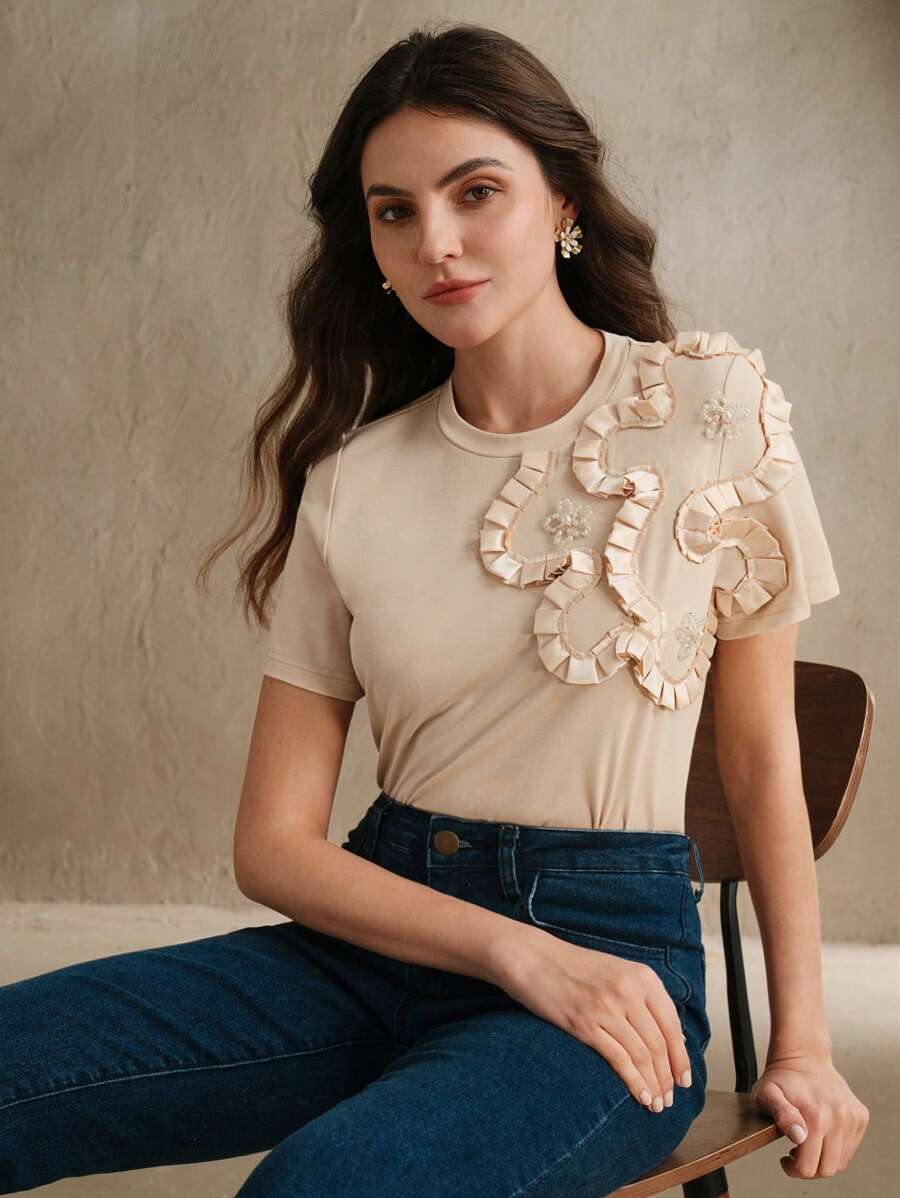 MIU Urban Blue Elasticized 3D Flower Short Sleeve T-Shirt For Women, Spring Summer
