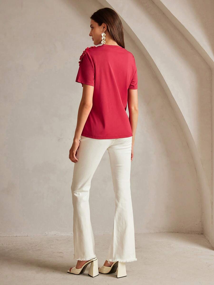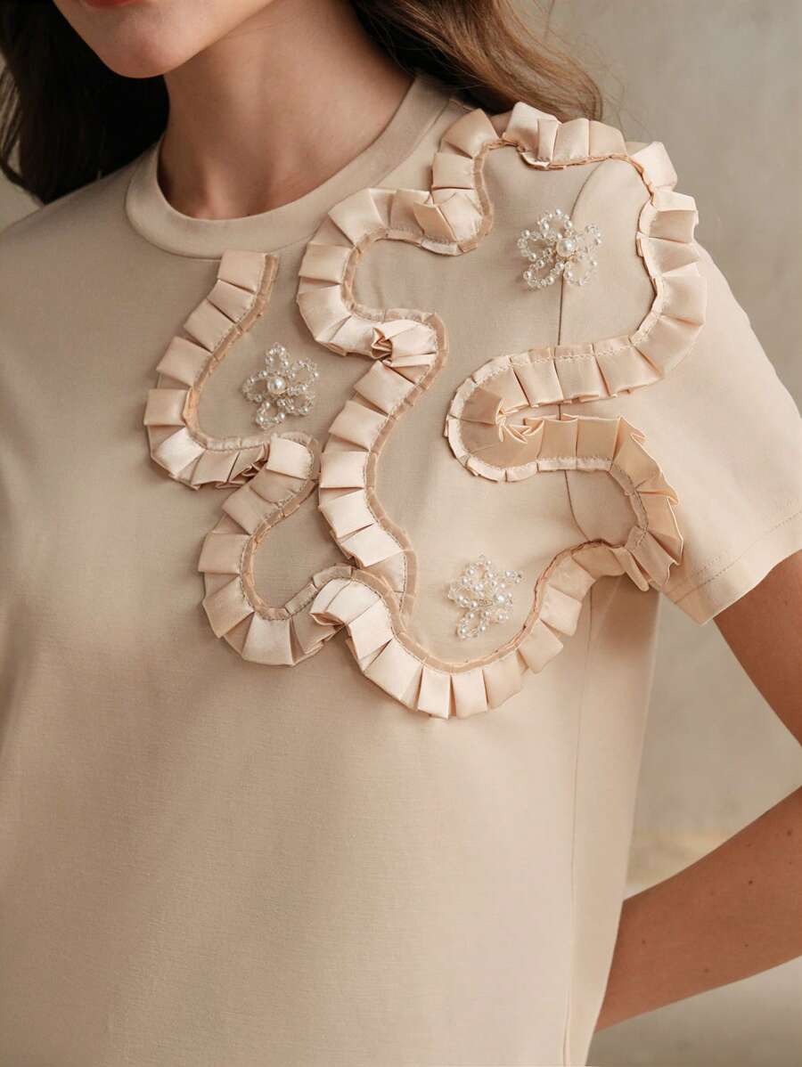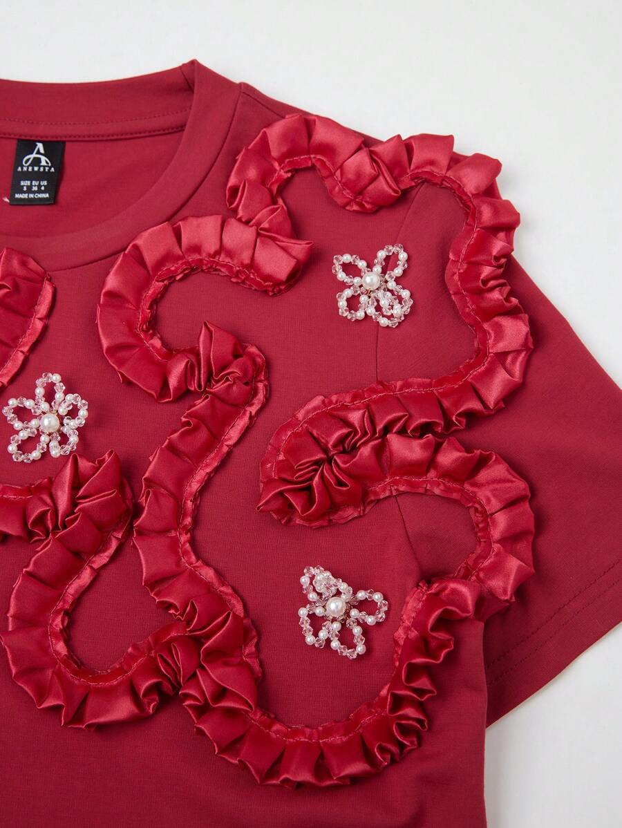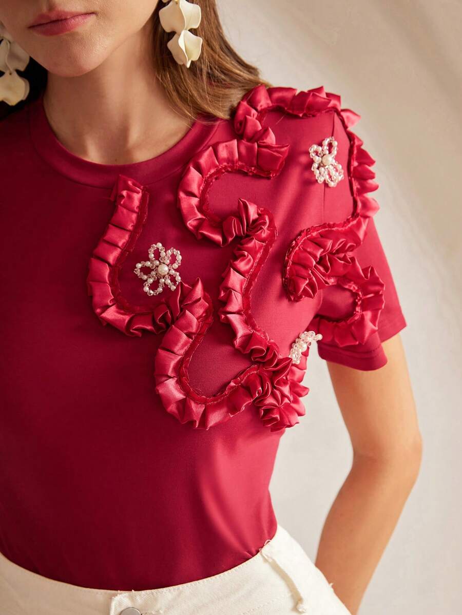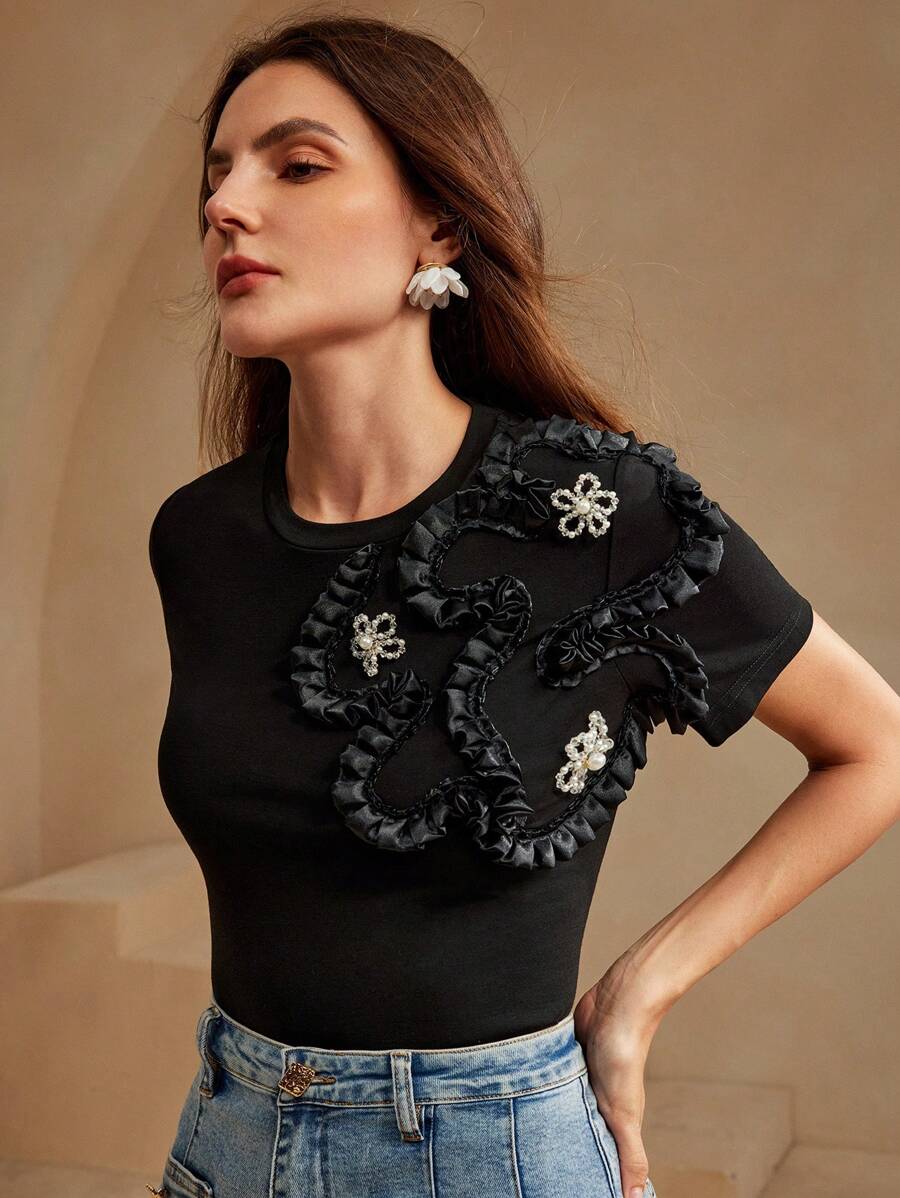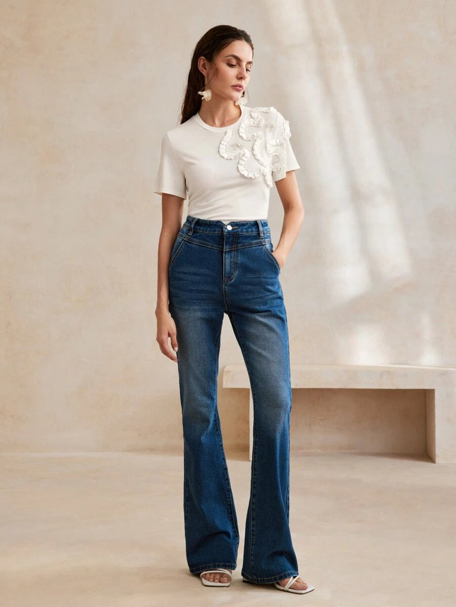 MIU Urban Blue Elasticized 3D Flower Short Sleeve T-Shirt For Women, Spring Summer