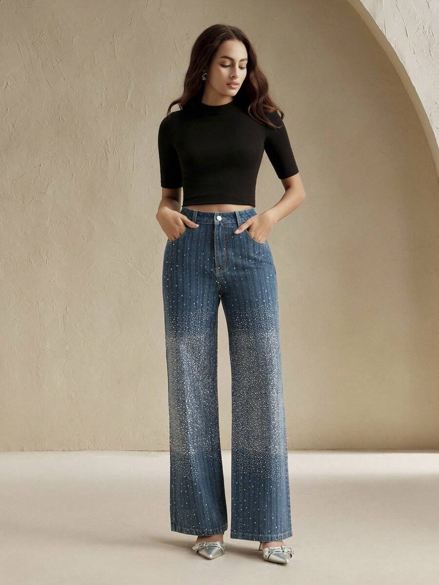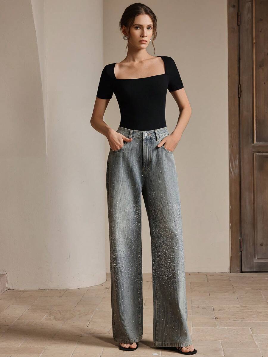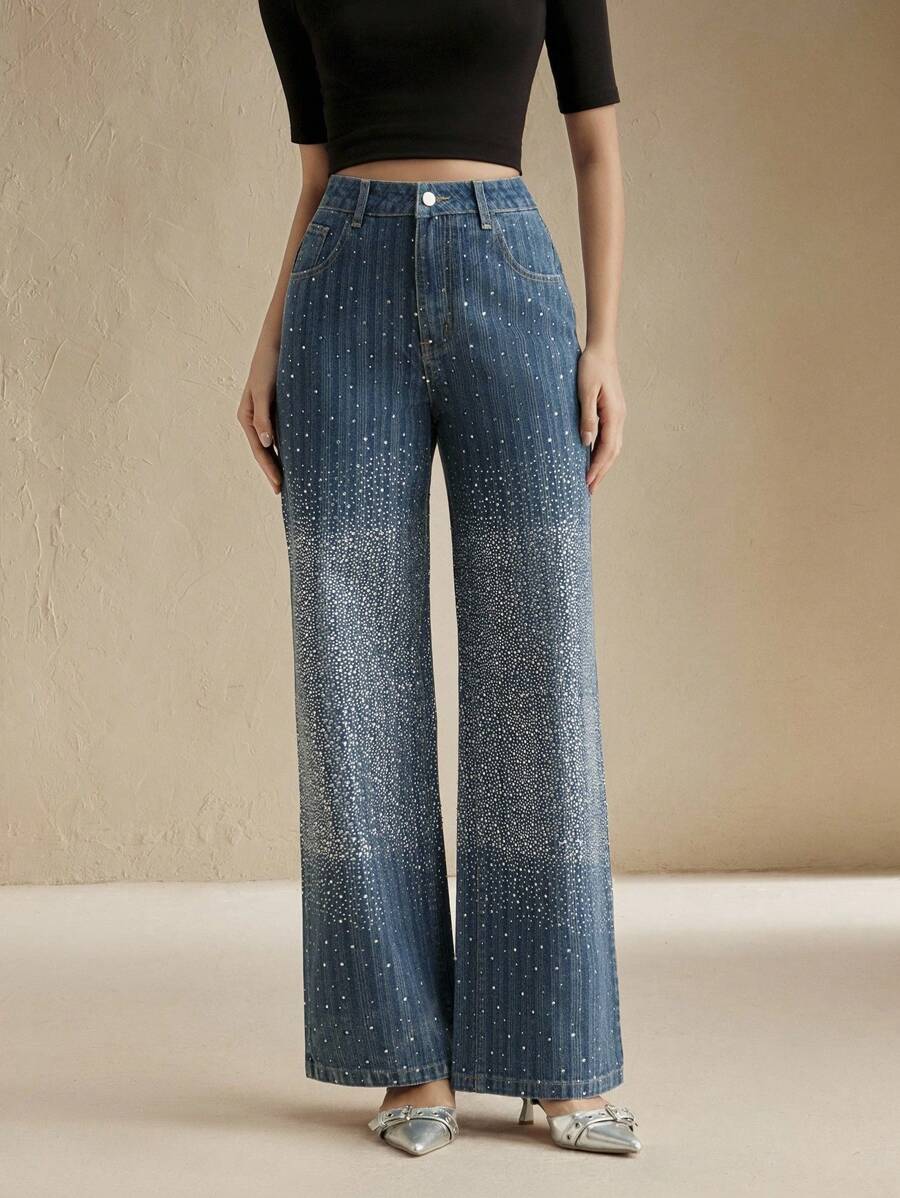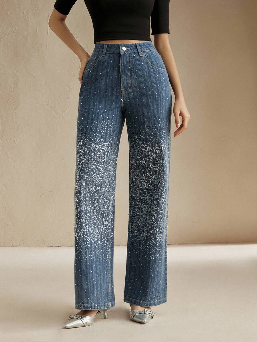 MIU US Style Heavily-Distressed Rhinestone Embellishment Straight Leg Jeans For Women, Versatile