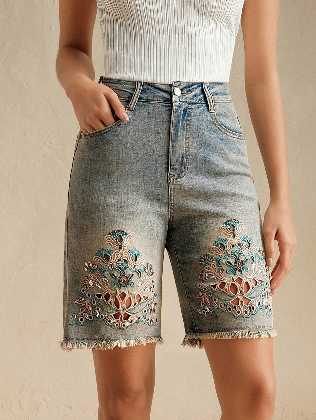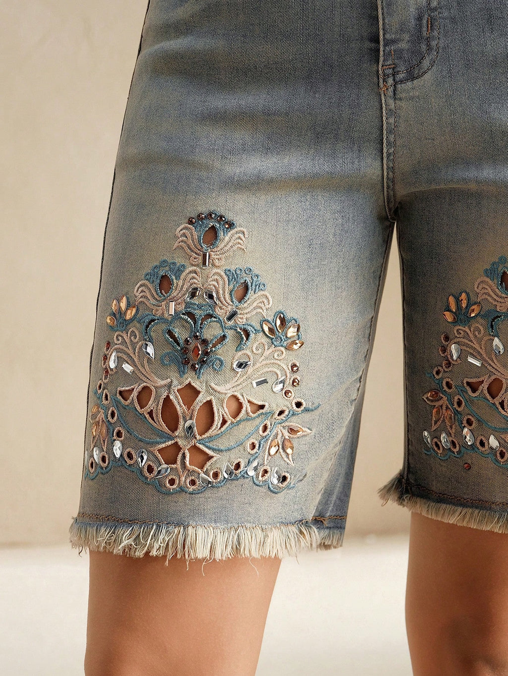 MIU Versatile Heavy Embroidered Hollow Out Rhinestone Fringed Edge Denim Jeans