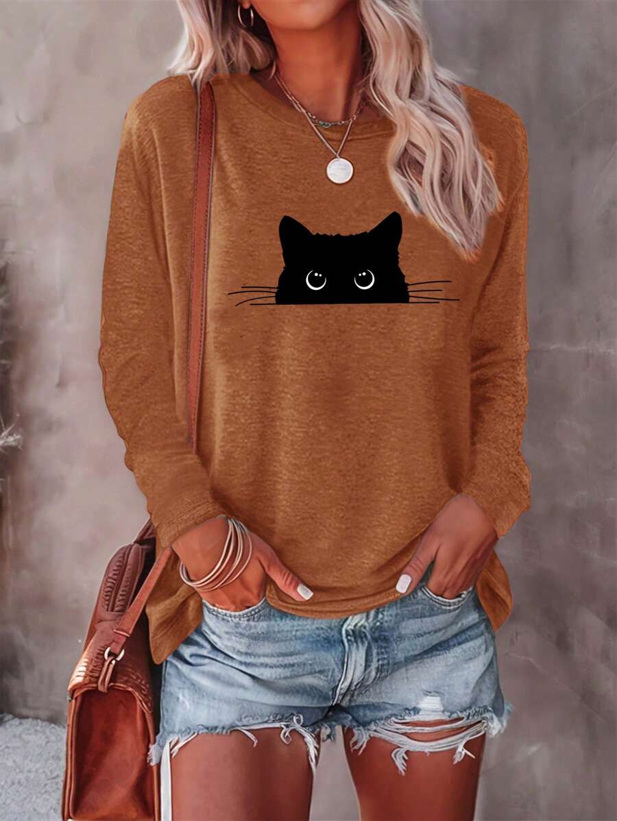MIU Women Casual Crew Neck Long Sleeve Cat Print Graphic Tees Women Tops For Spring Fall Cloth For Women
