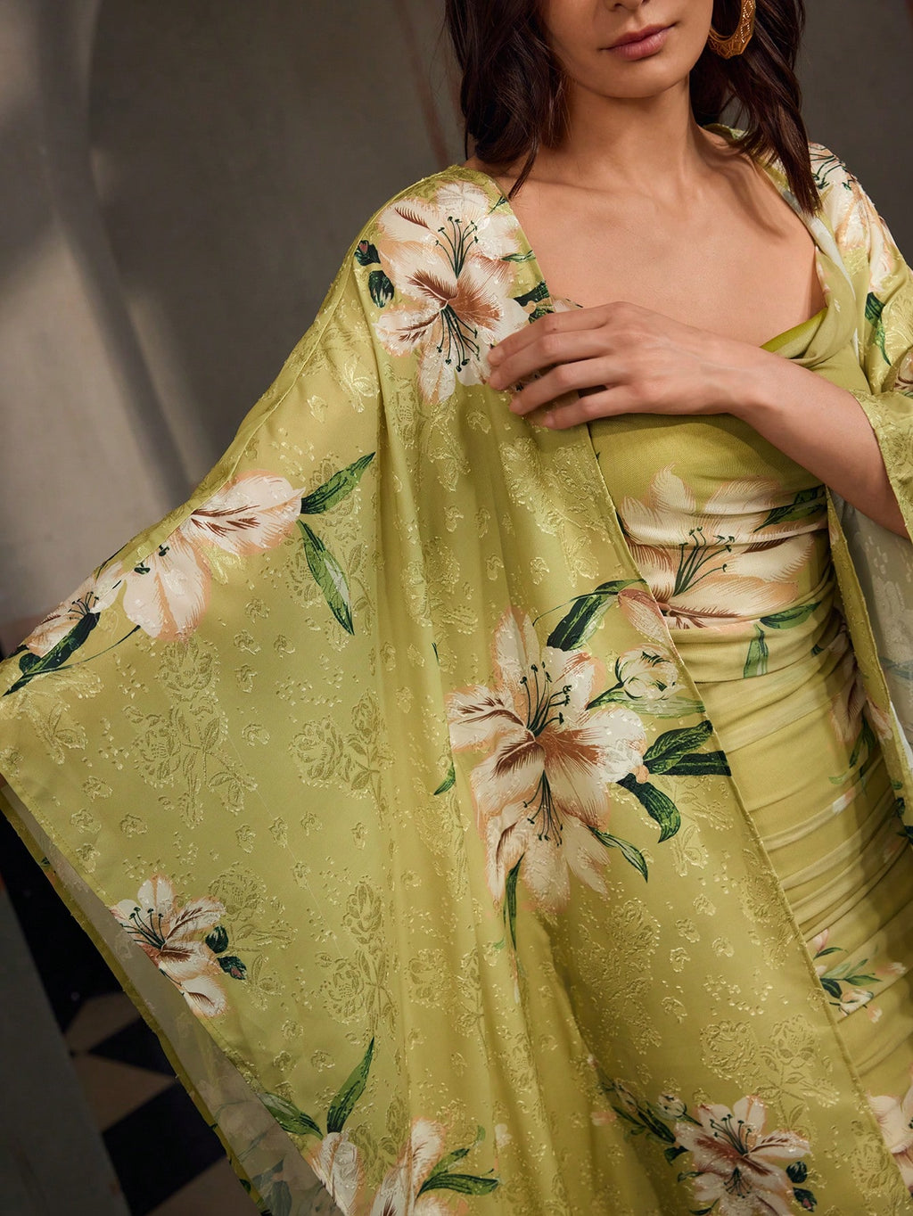MIU Women Floral Print Batwing Jacket And Pleated Slip Dress Elegant 2-Piece Set