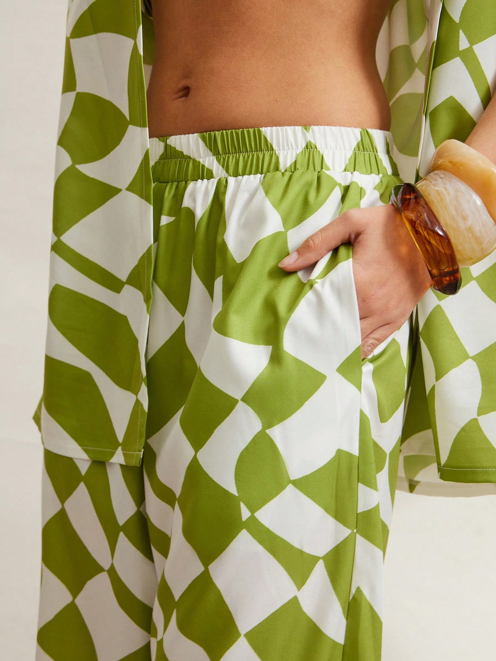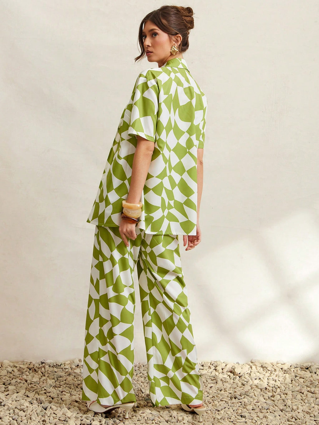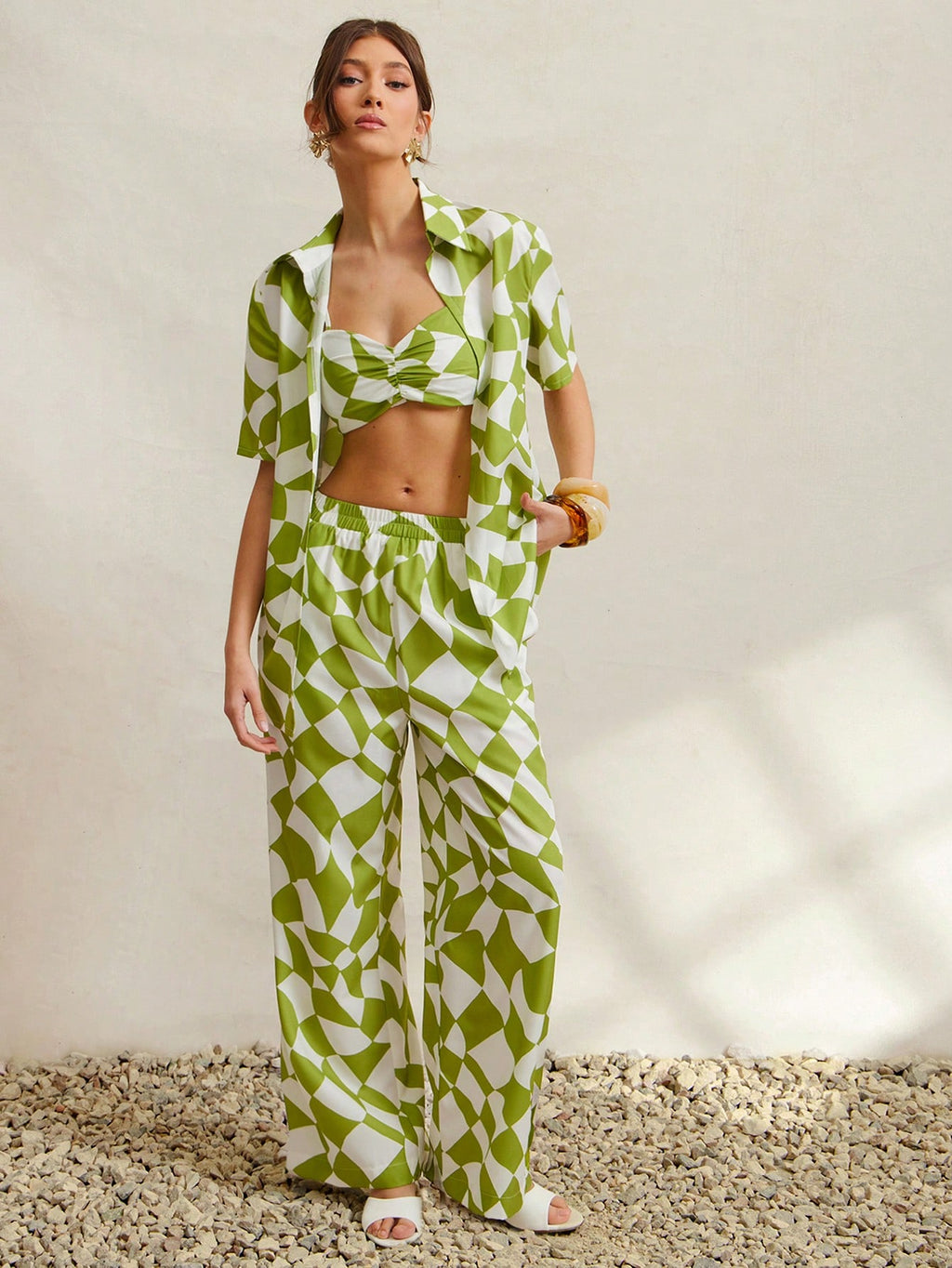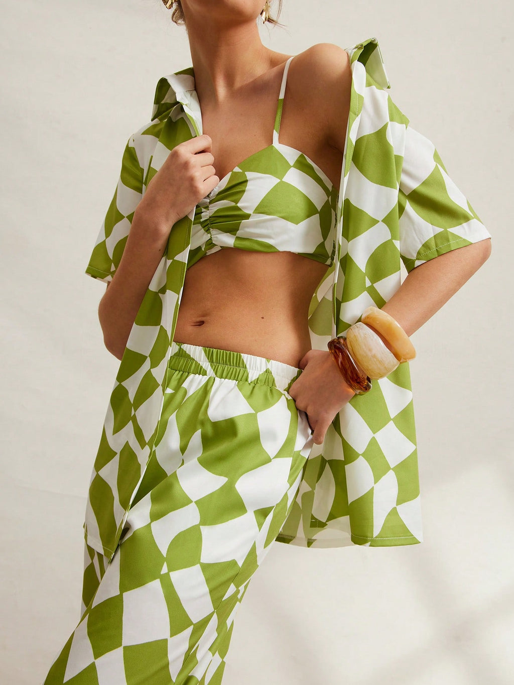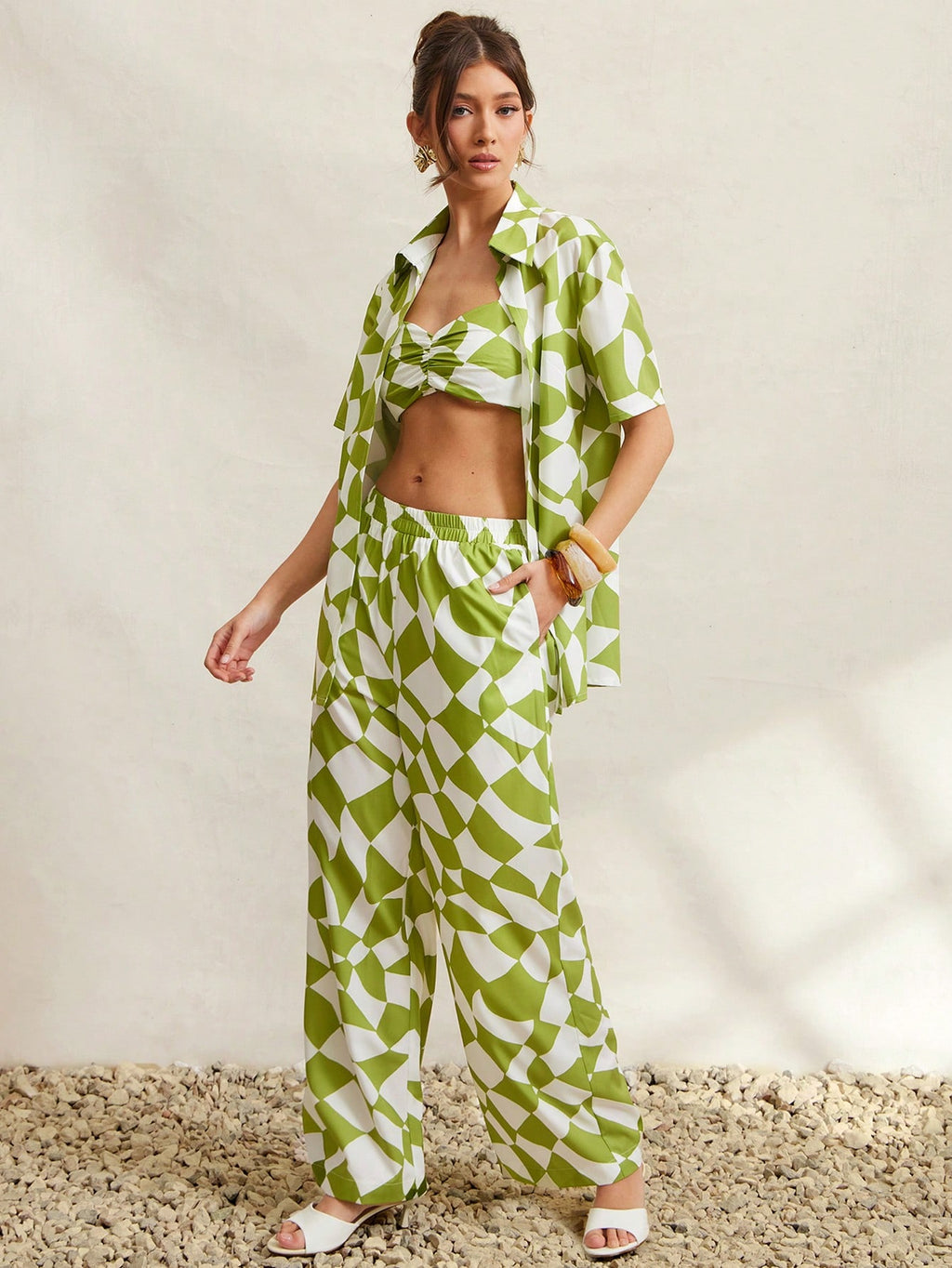 MIU Women Geometric Print Short Sleeve Shirt, Cropped Camisole And Pants Casual 3-Piece Set