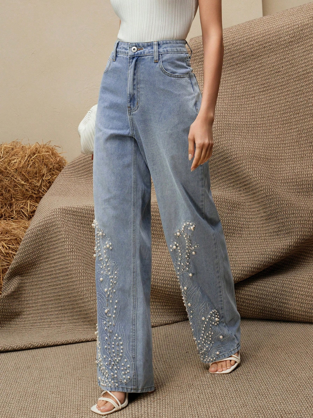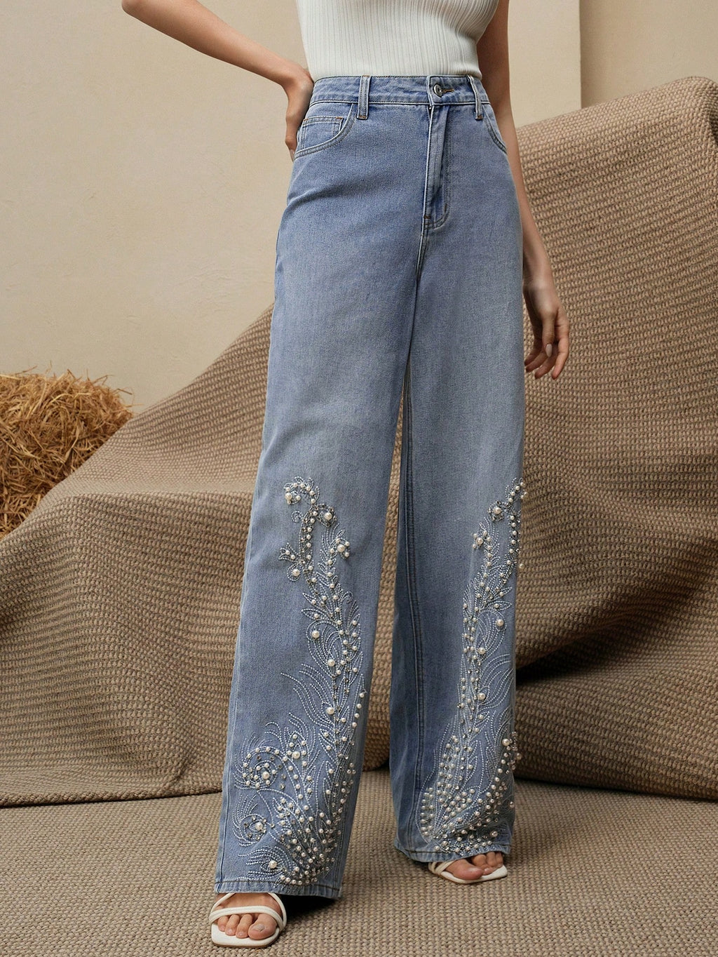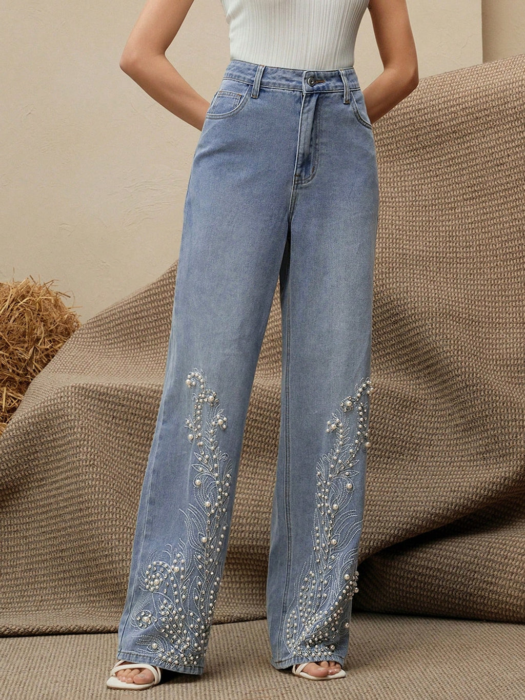 MIU Women High Waist Fashionable Rhinestone Pearls Decorative Loose Fit Wide Leg Straight Jeans