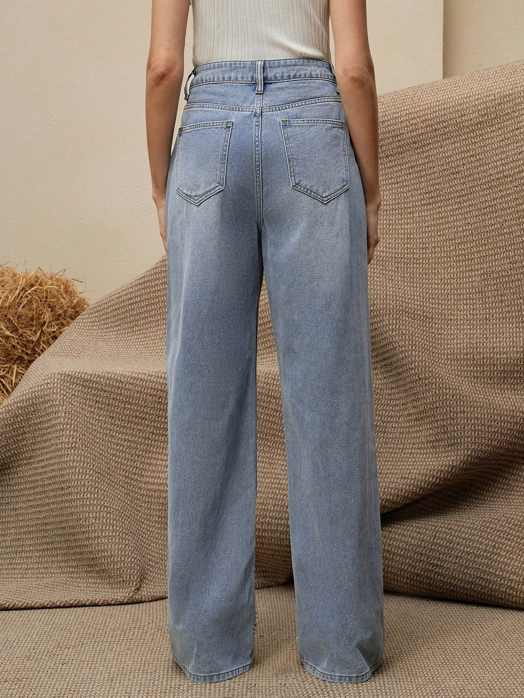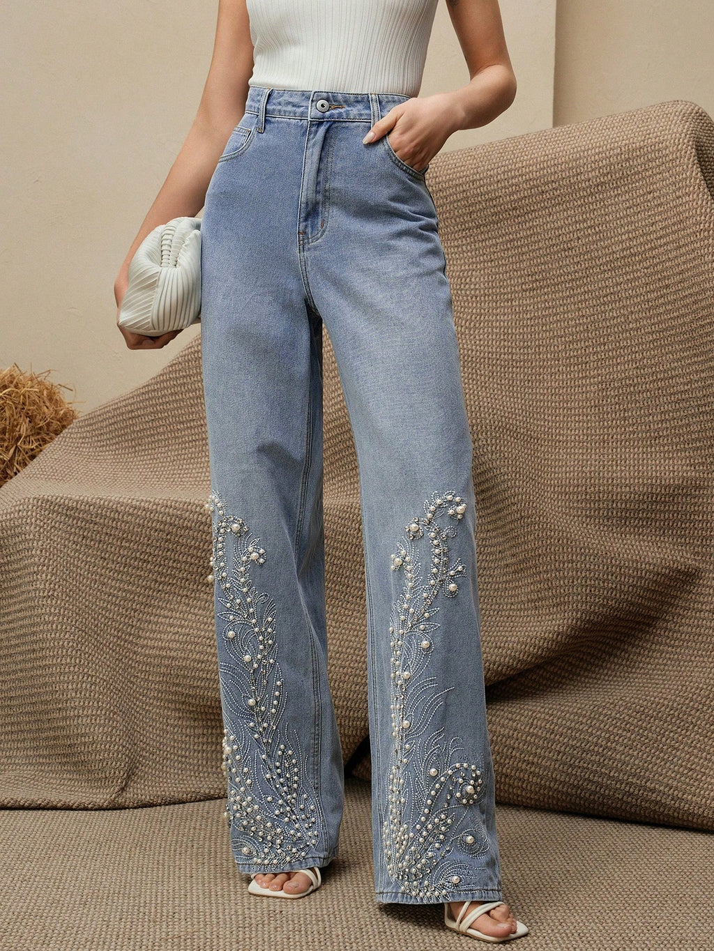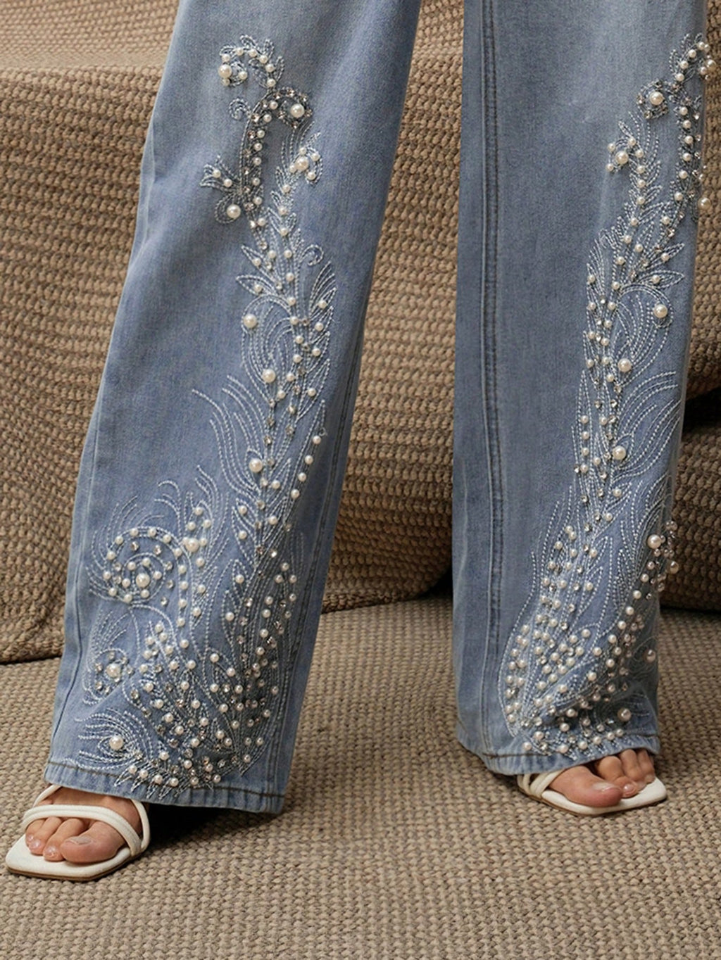 MIU Women High Waist Fashionable Rhinestone Pearls Decorative Loose Fit Wide Leg Straight Jeans