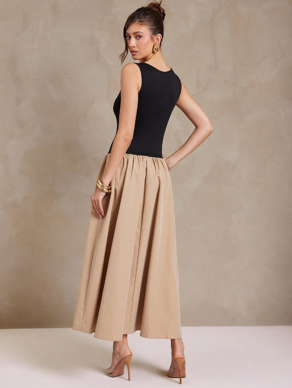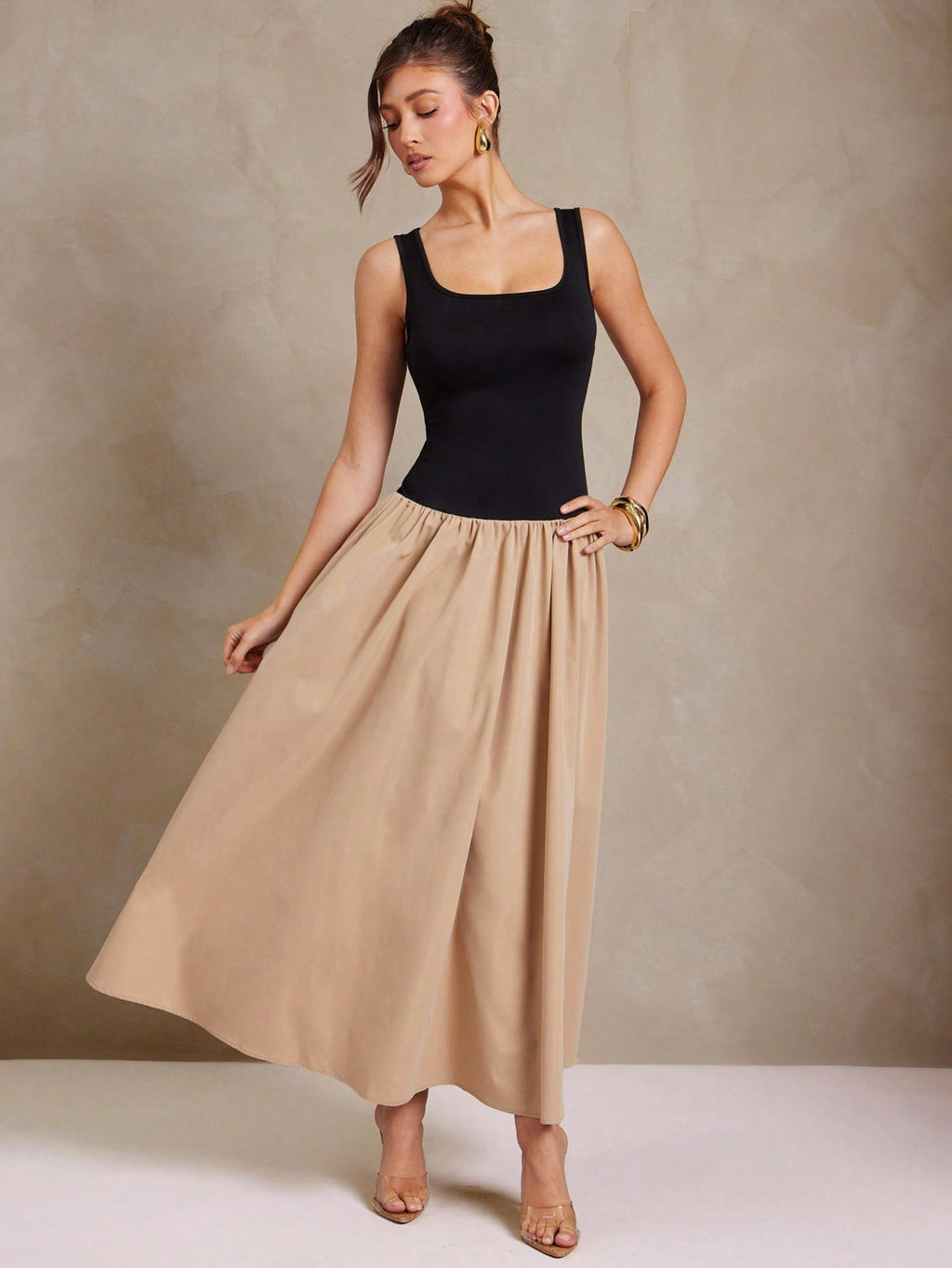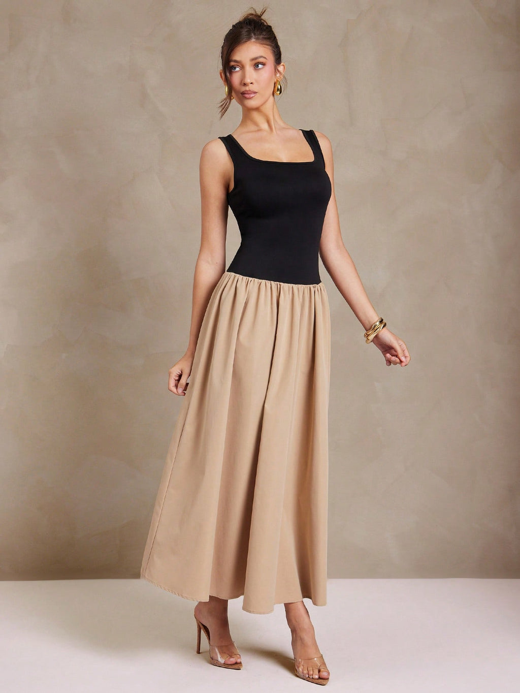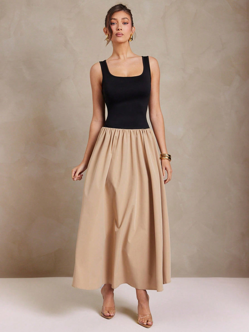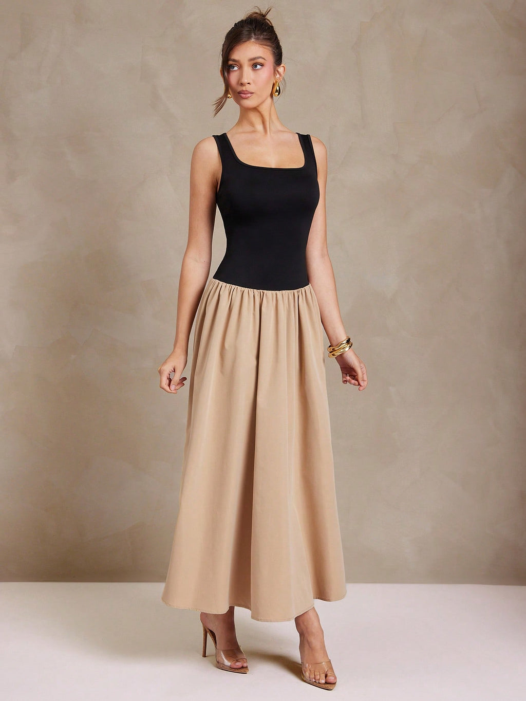 MIU Women Square Neck Ruffle Hem Color Block Sleeveless Elegant Midi Dress