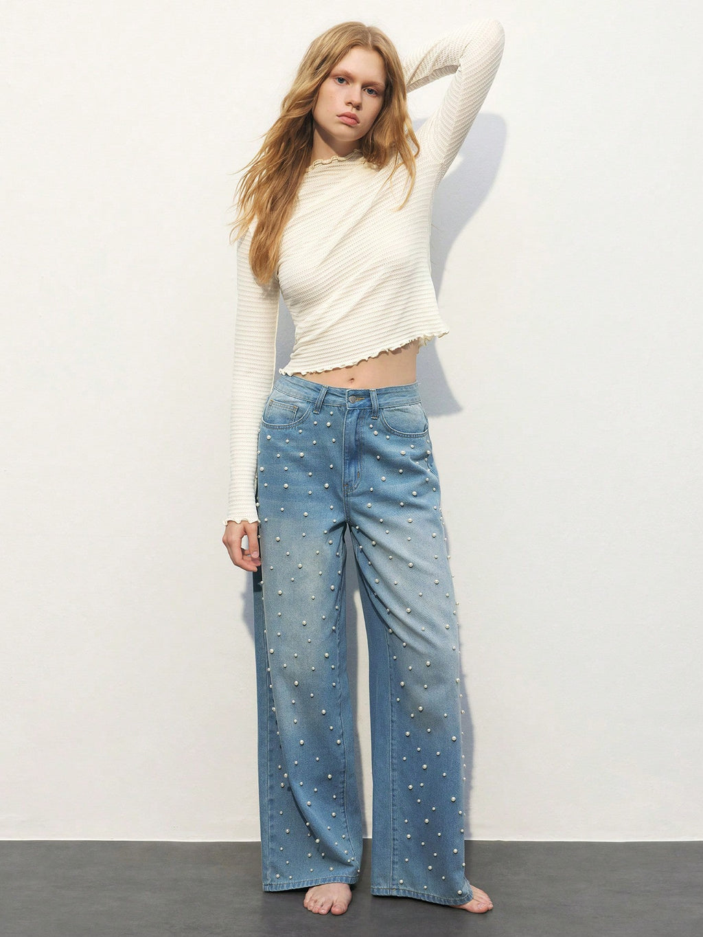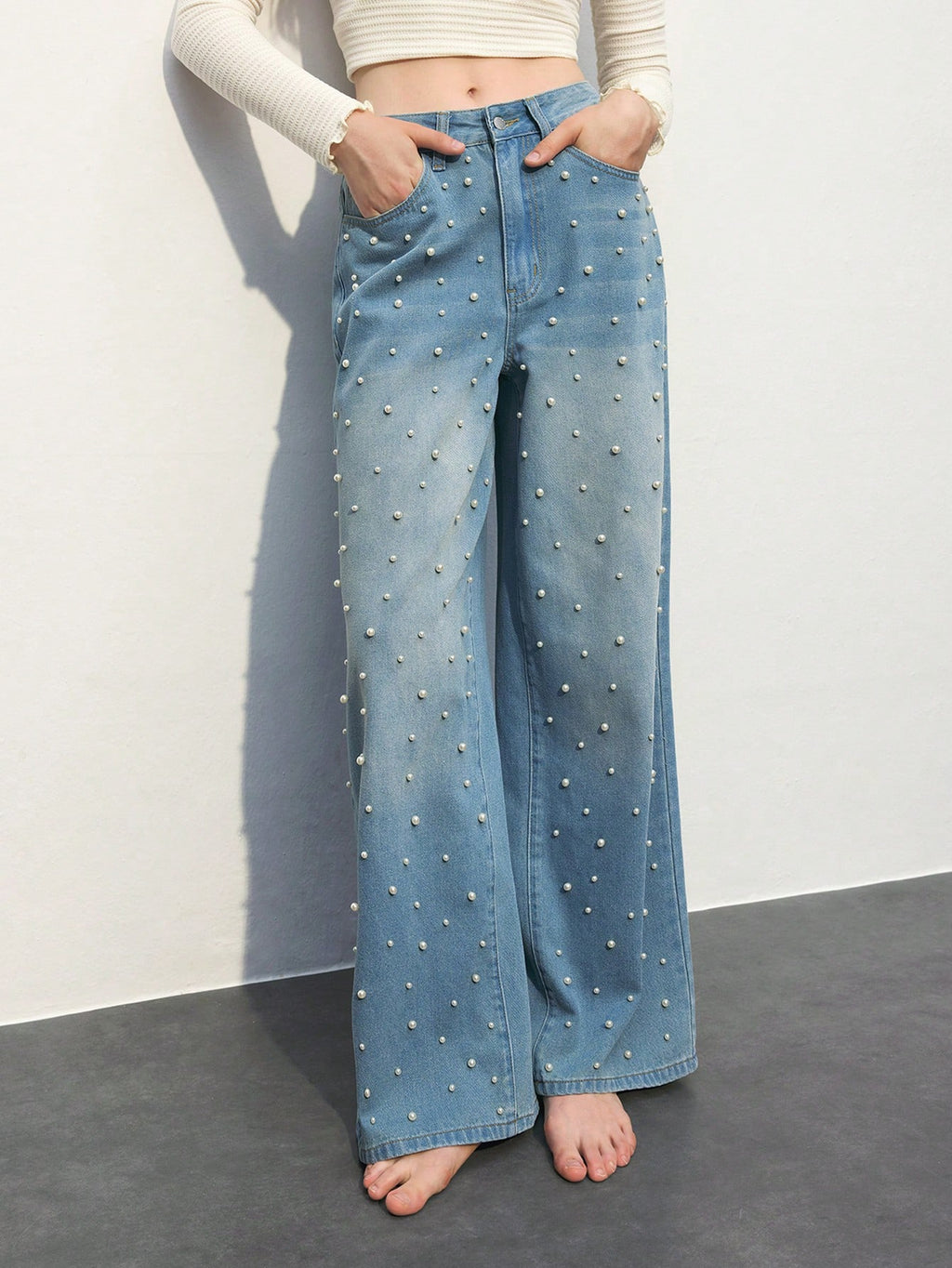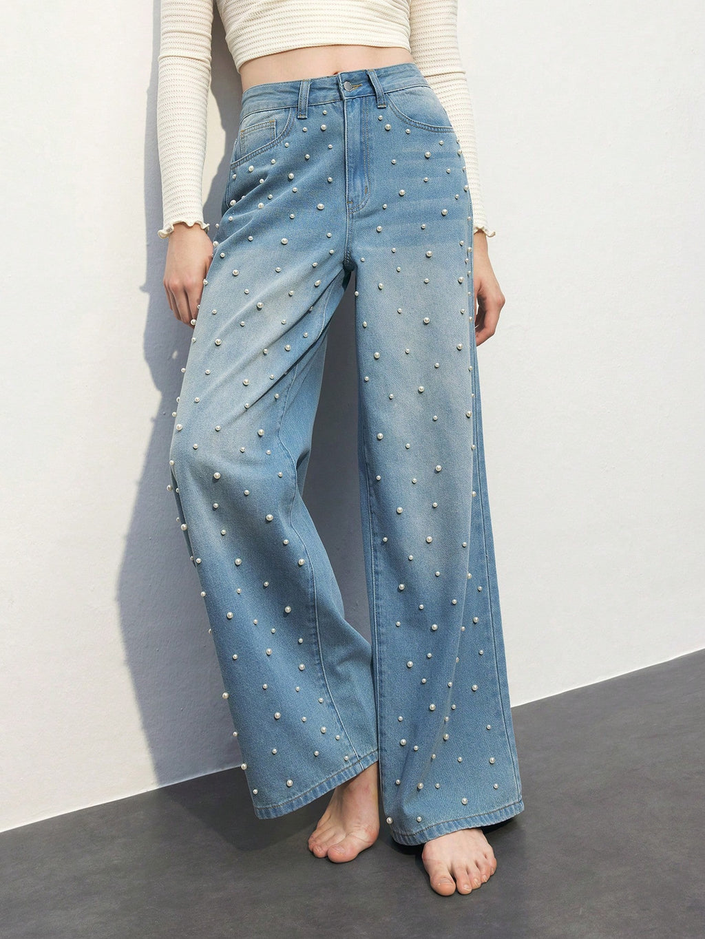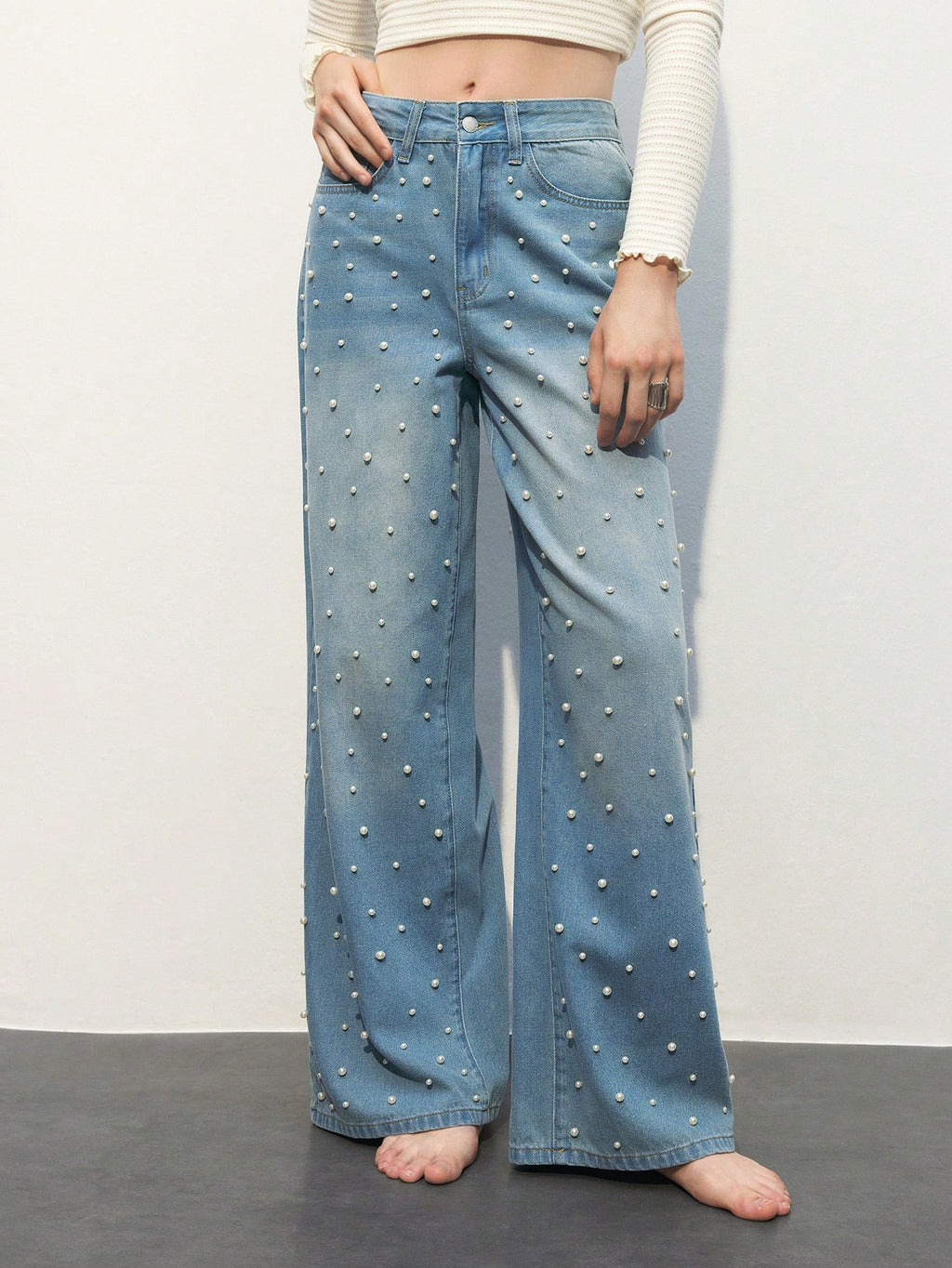 MIU Women White Beaded Loose Fit Blue Denim Wide Leg Pants