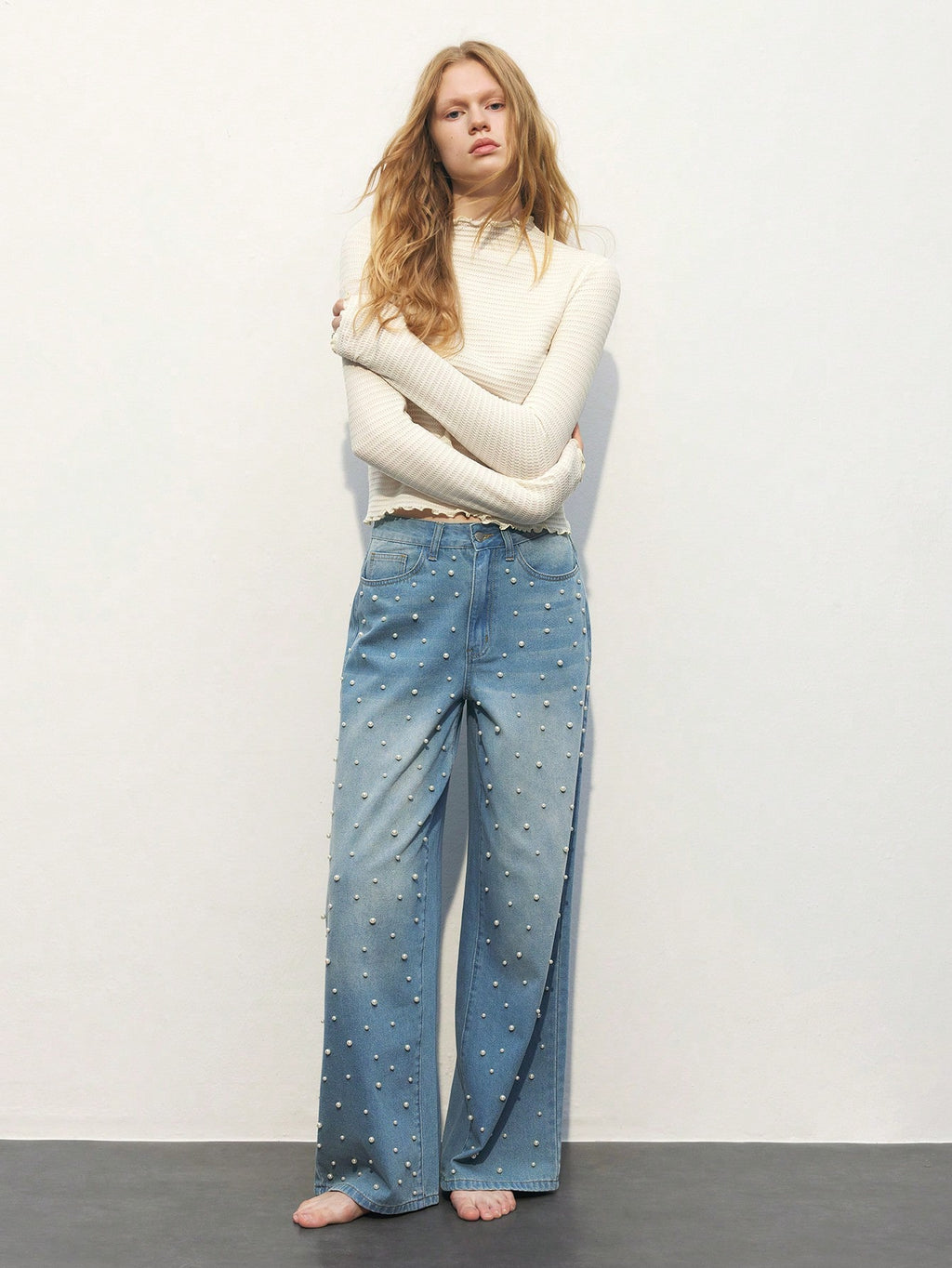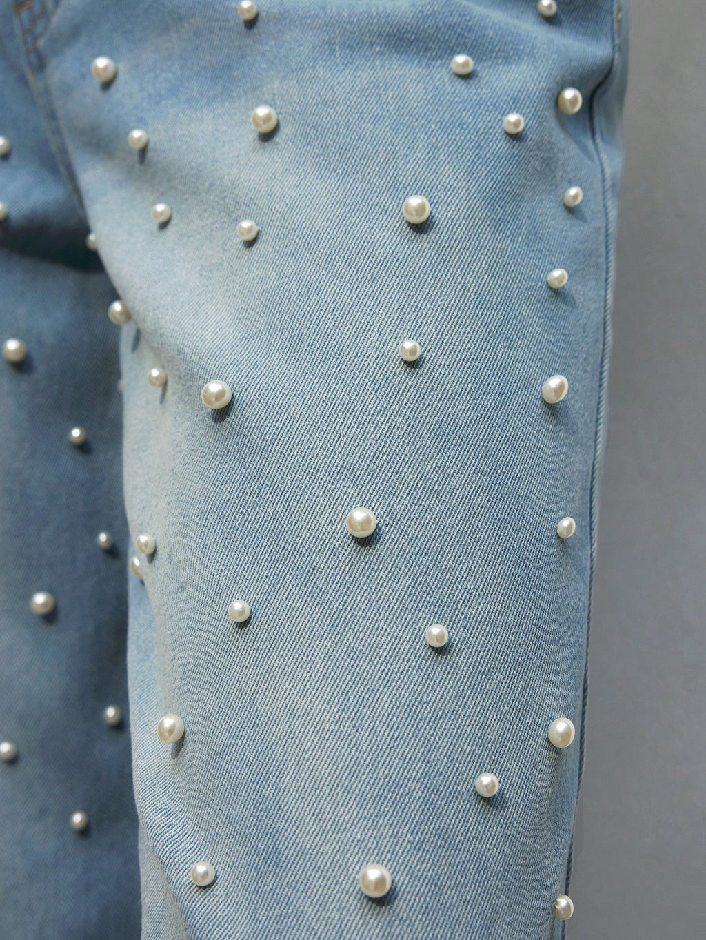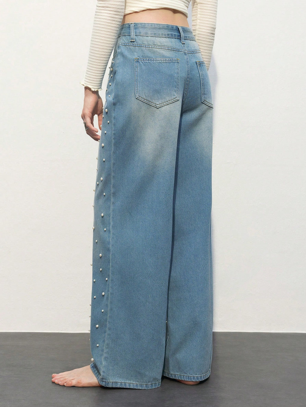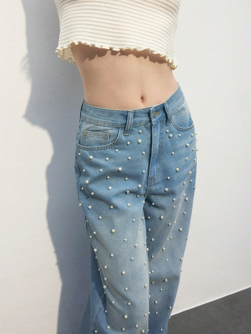MIU Women White Beaded Loose Fit Blue Denim Wide Leg Pants