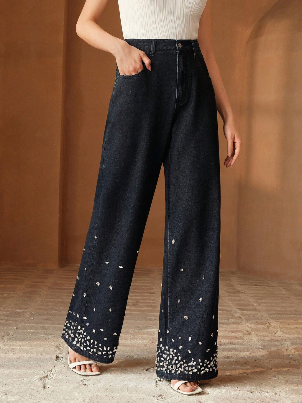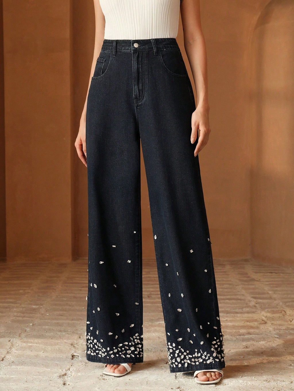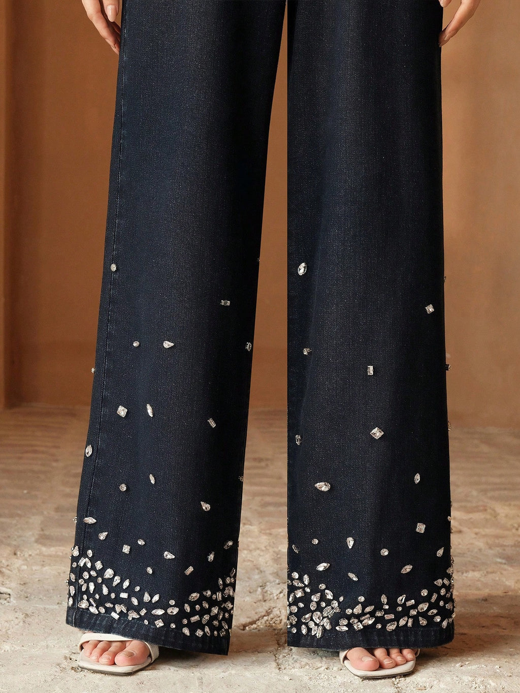 MIU Women's Black Denim Long Jeans With Rhinestone Embellishments And Zipper Detail