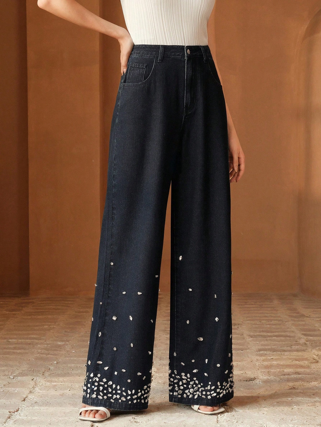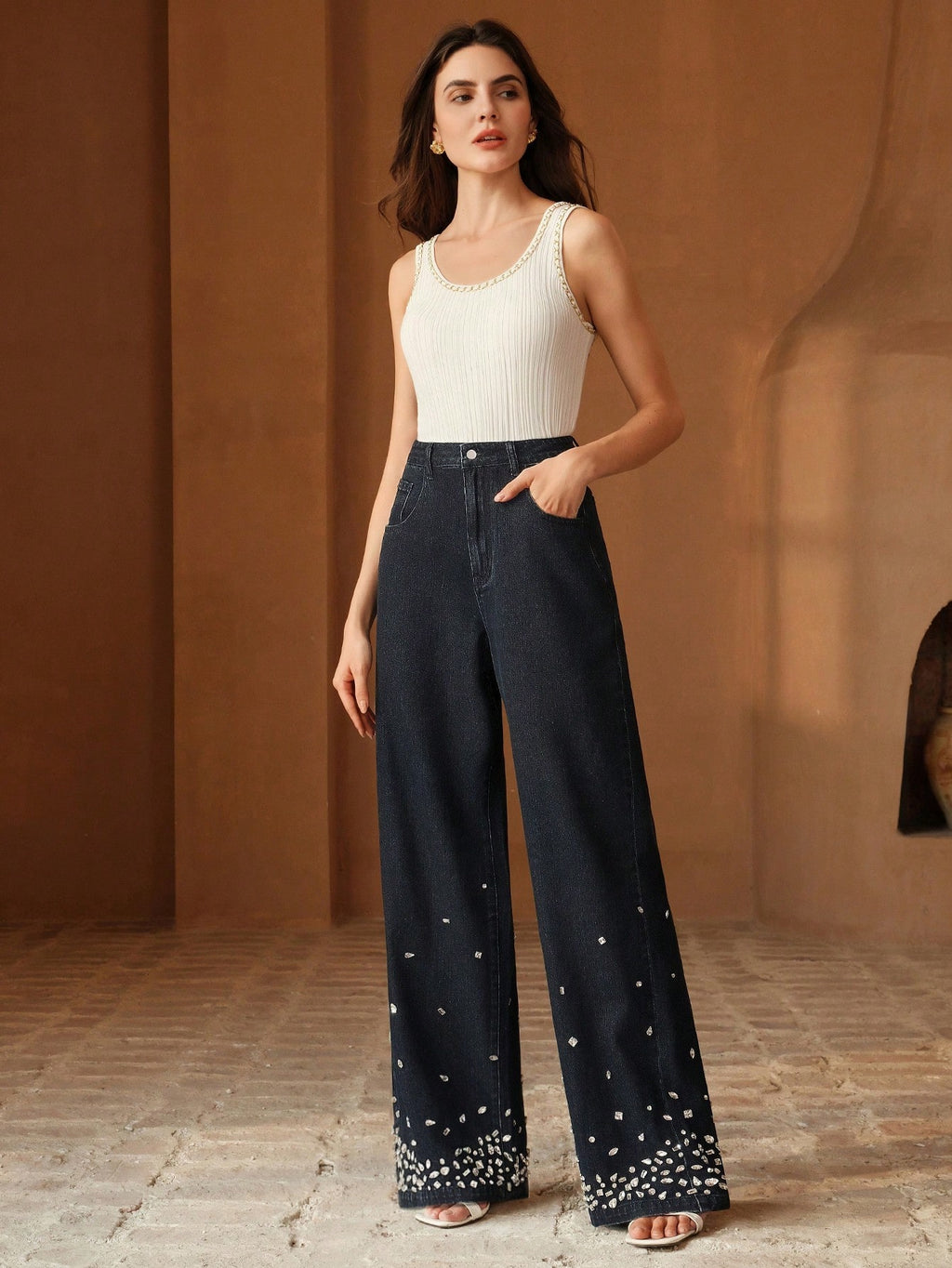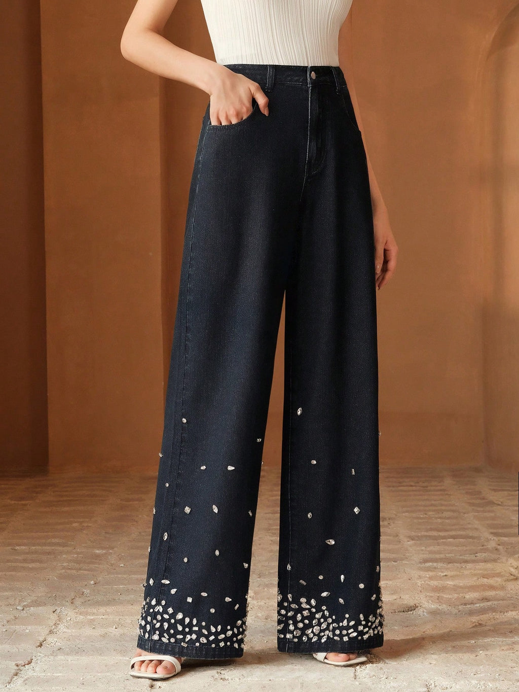 MIU Women's Black Denim Long Jeans With Rhinestone Embellishments And Zipper Detail
