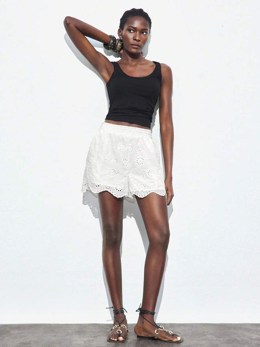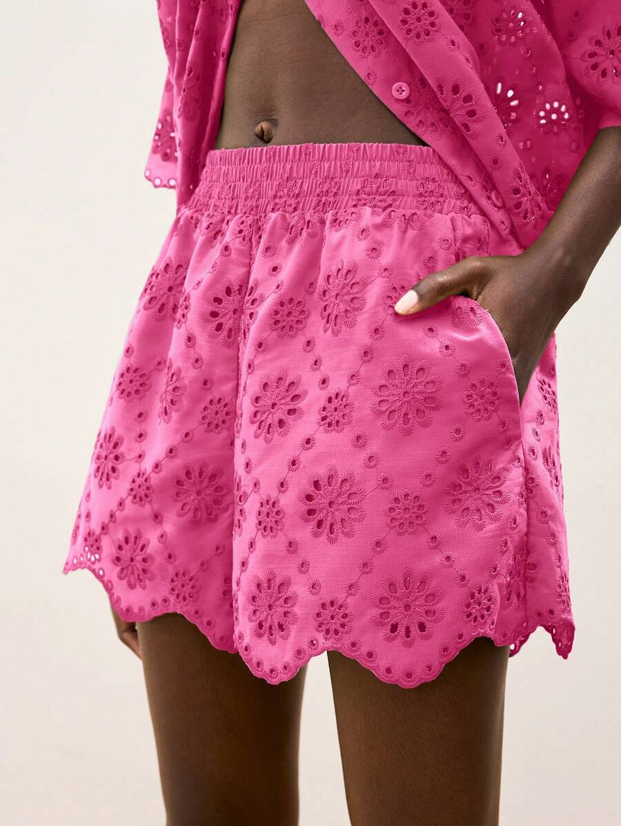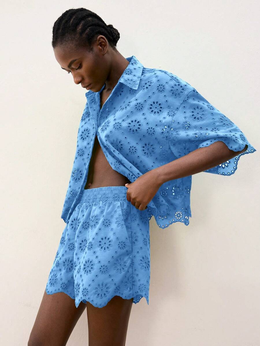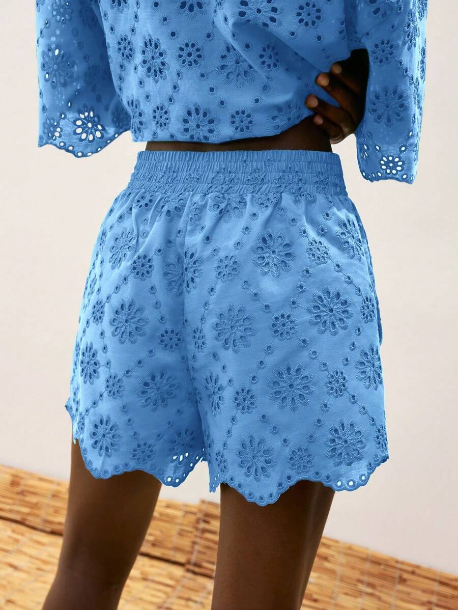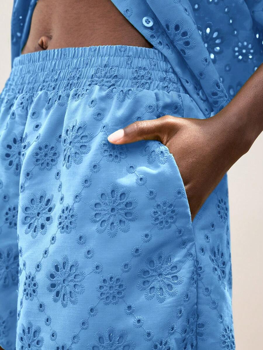 MIU Women's Blue Summer Clothing, Hollow Cotton Embroidered Fabric, Ruffled Hem Boho Beach Style, Casual Solid Color Daily Wear, Ladies Outdoor Shorts, Summer Hawaiian Style Women Apparel, Festival Celebration Outfits