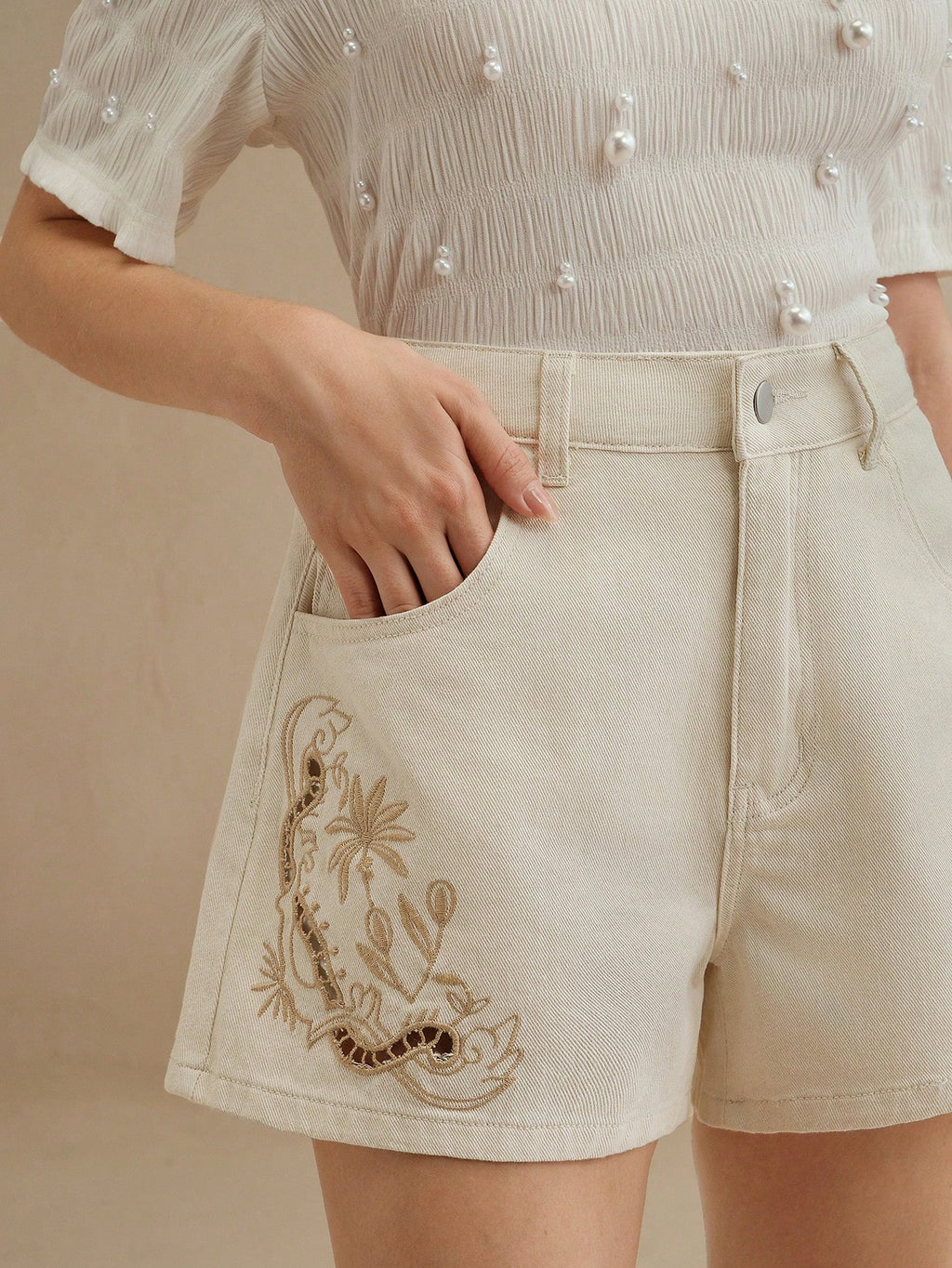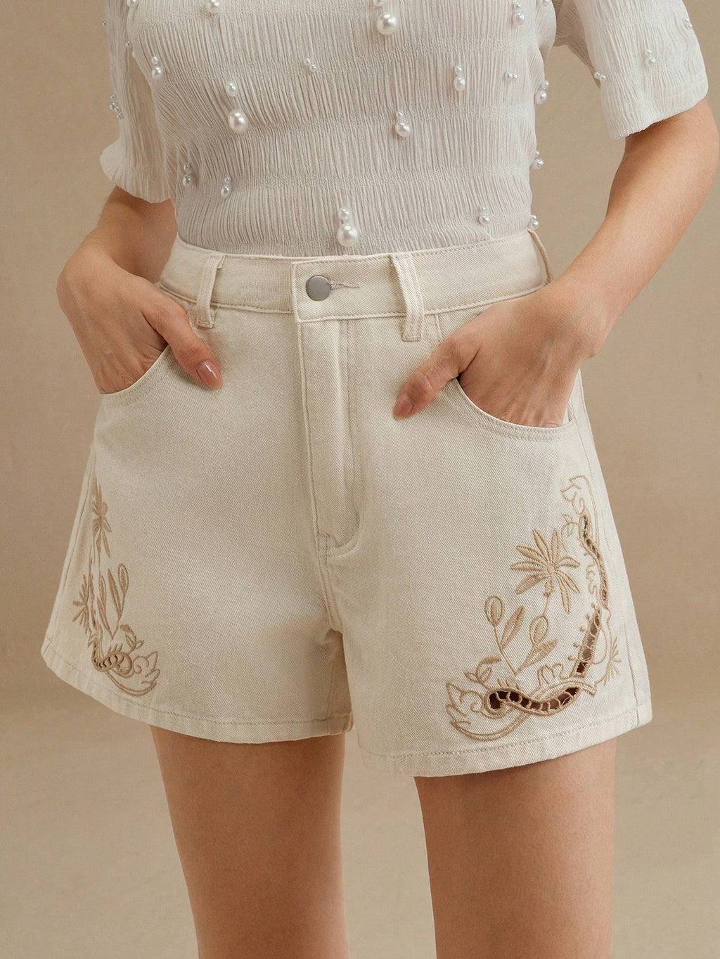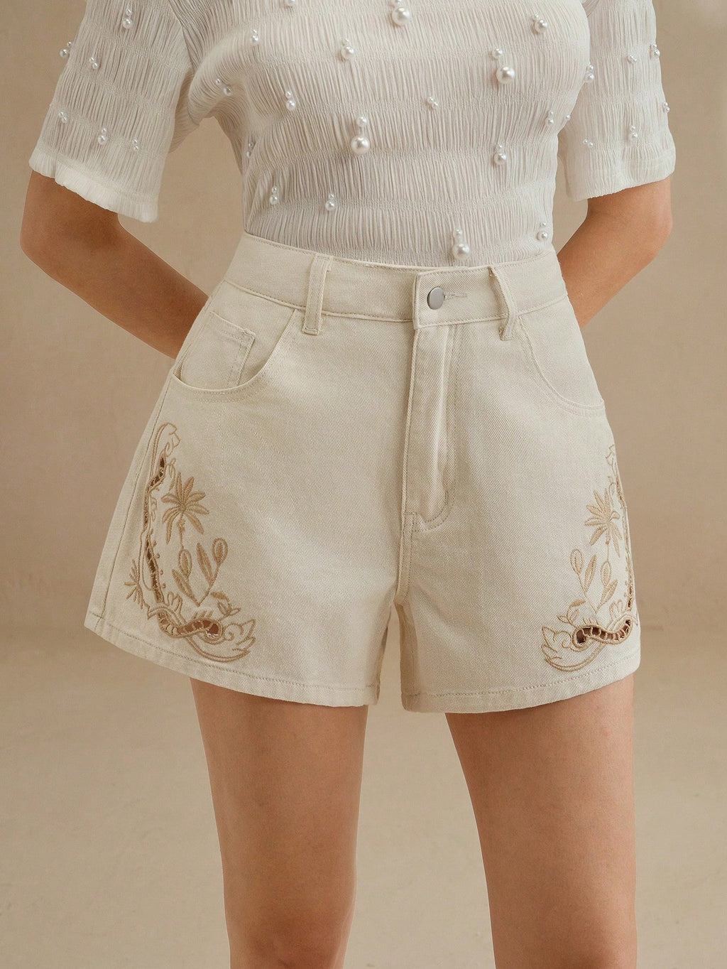 MIU Women's Casual Beige Denim Shorts With Embroidered Floral Design And Zipper Detail