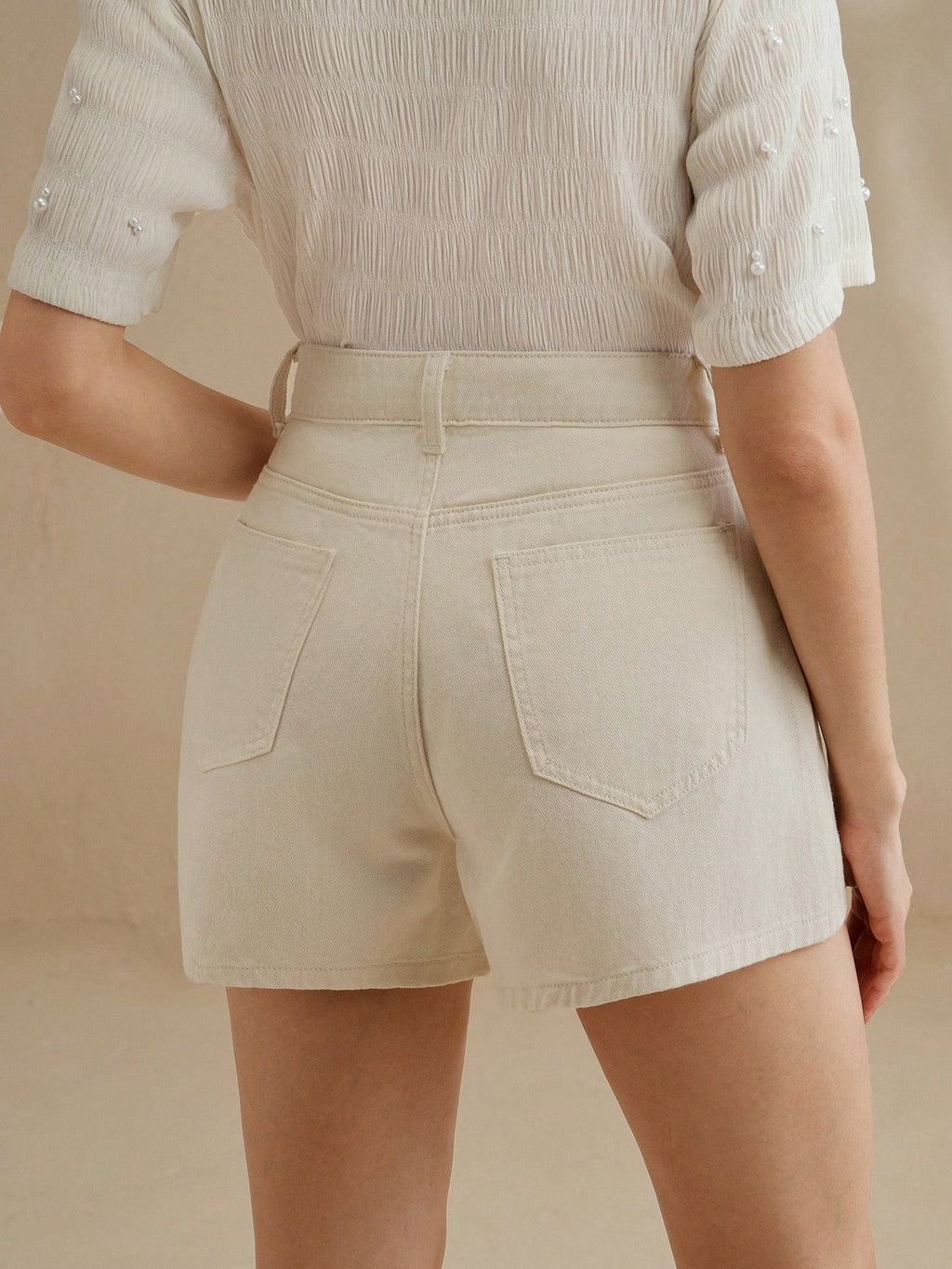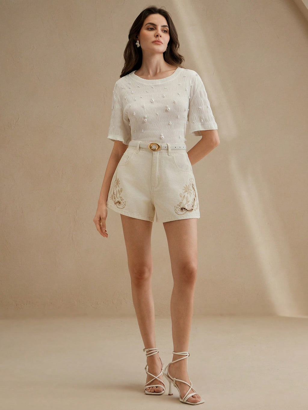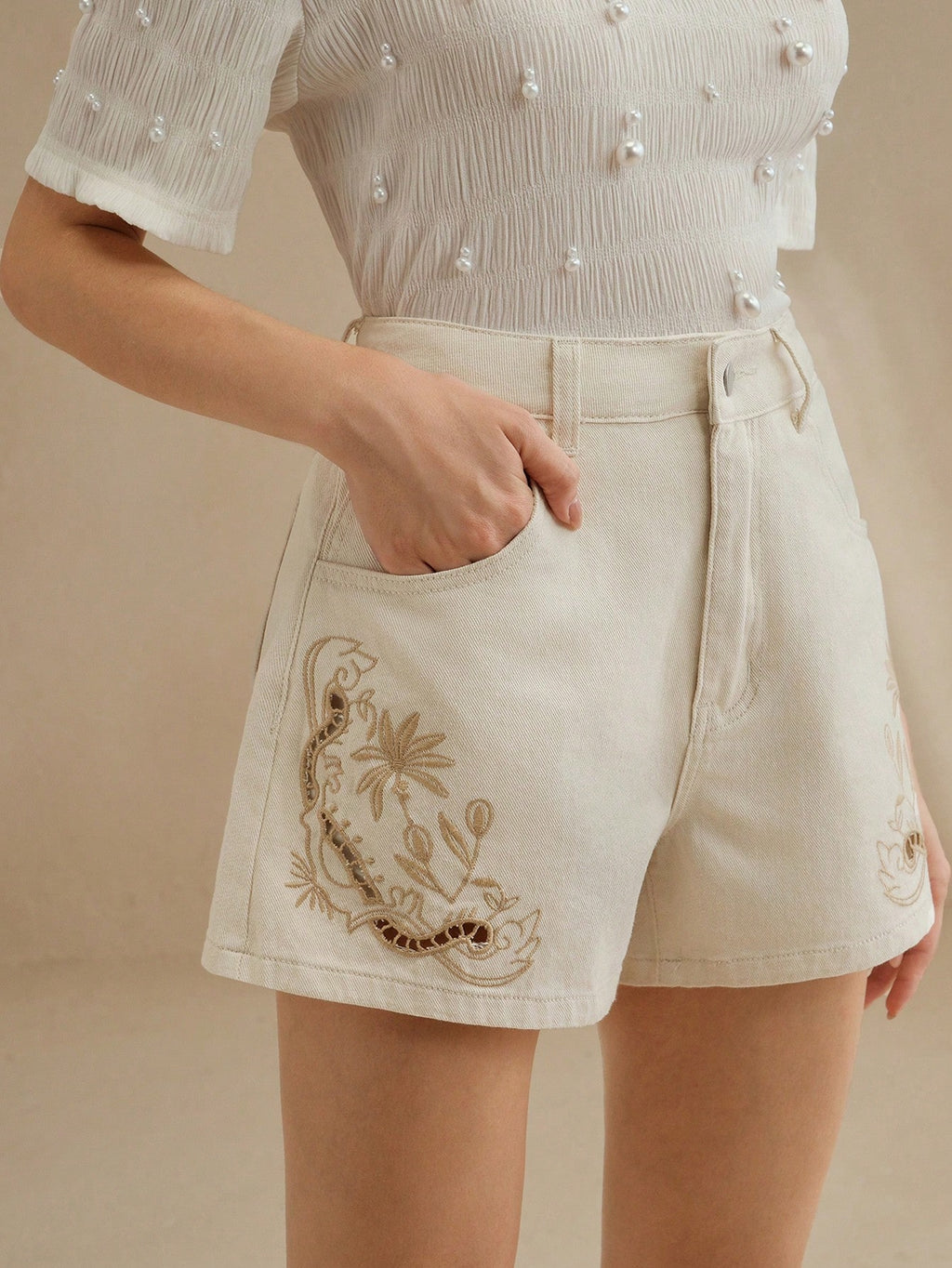 MIU Women's Casual Beige Denim Shorts With Embroidered Floral Design And Zipper Detail