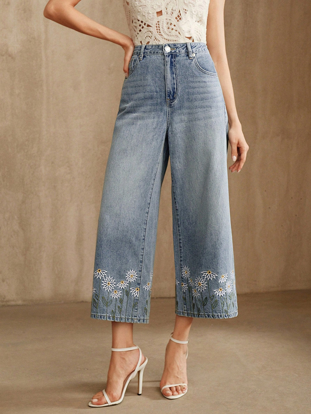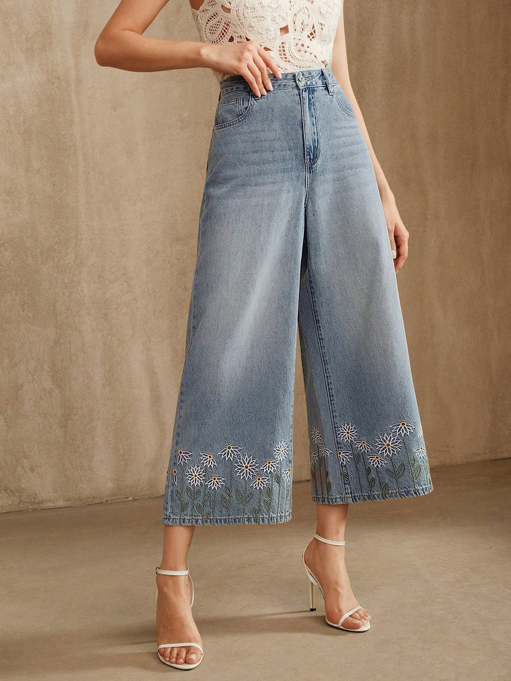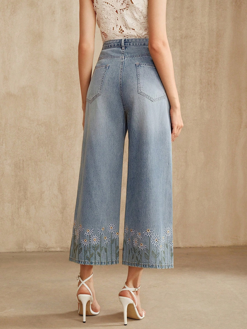 MIU Women's Casual Floral Embroidered Loose Short Wide Leg Jeans