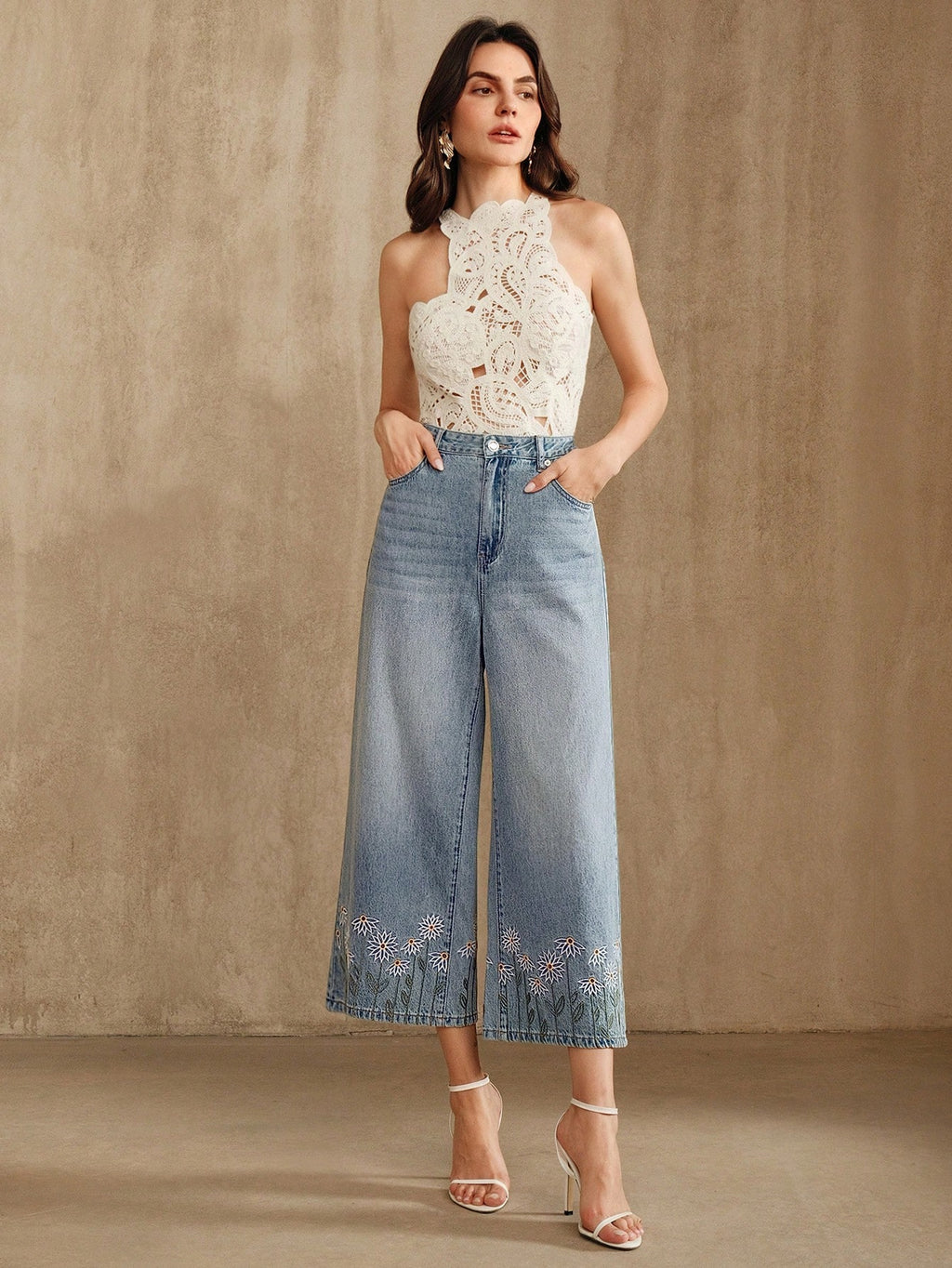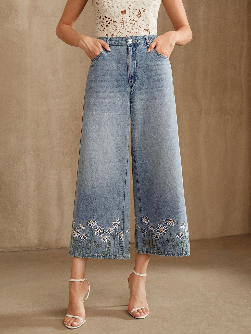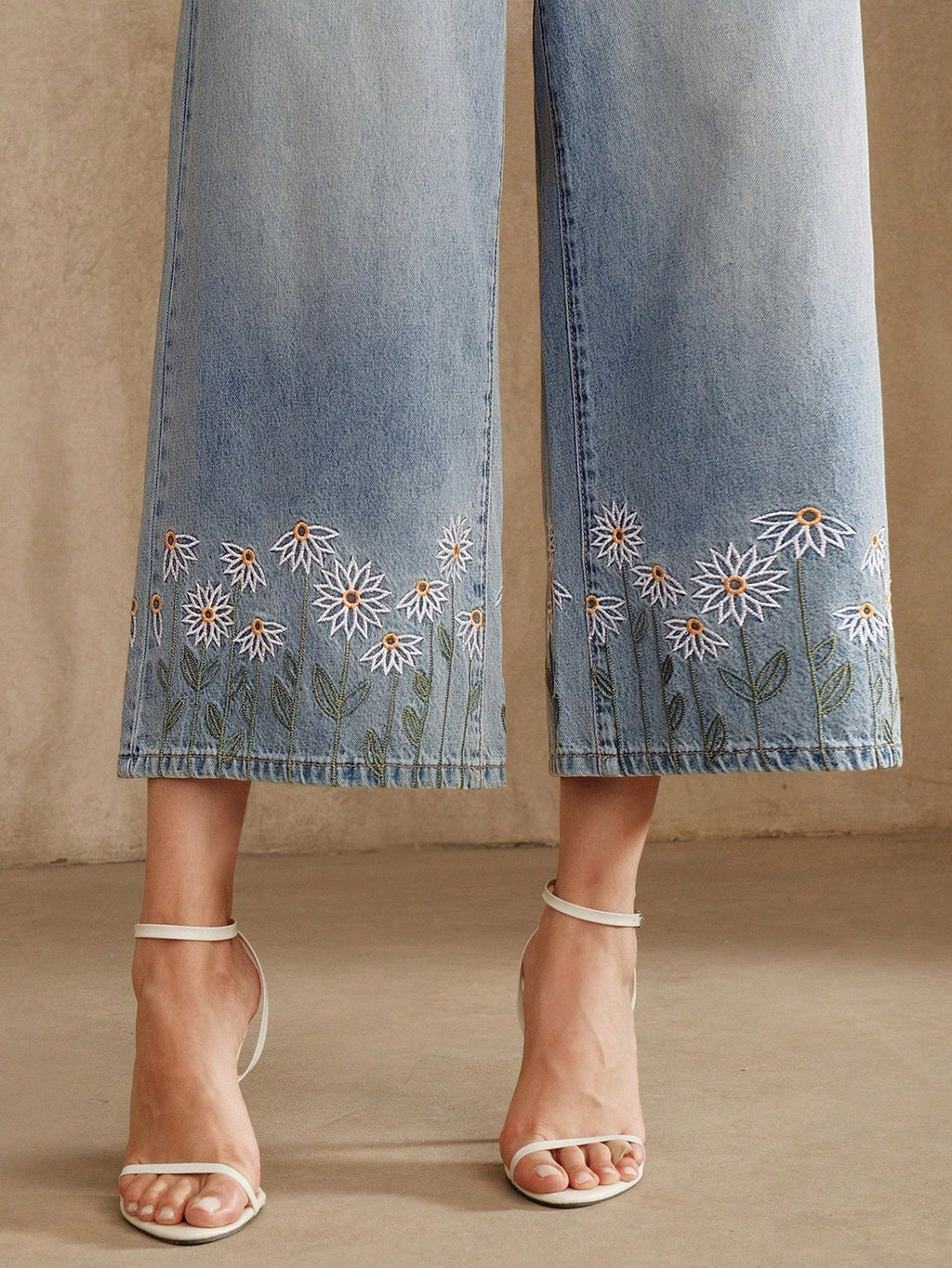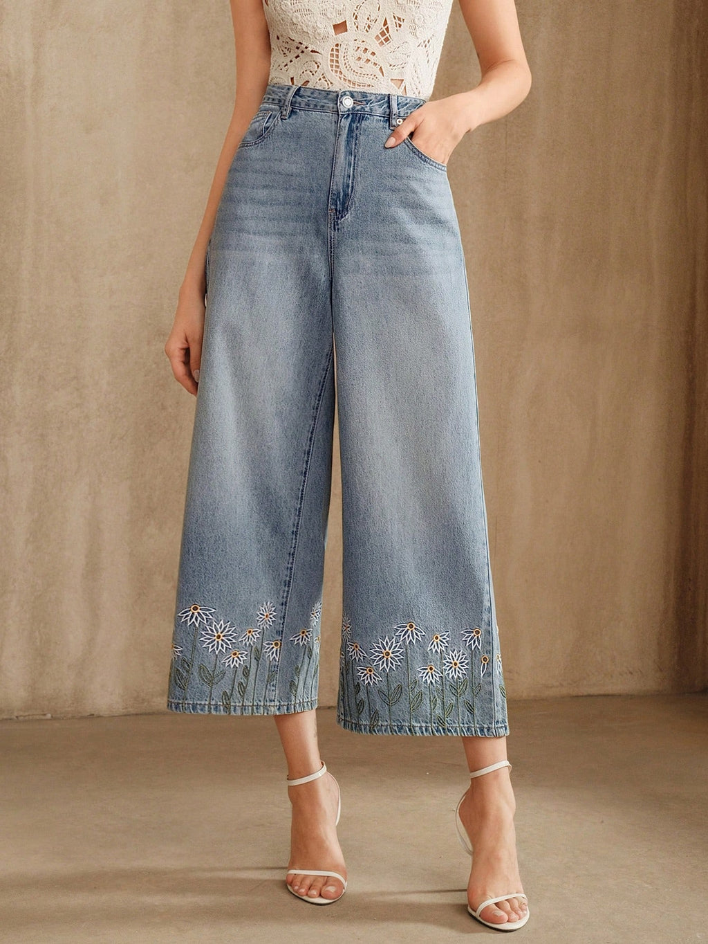 MIU Women's Casual Floral Embroidered Loose Short Wide Leg Jeans