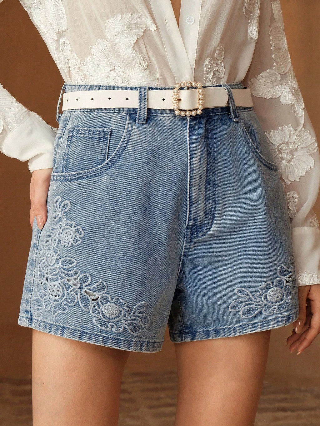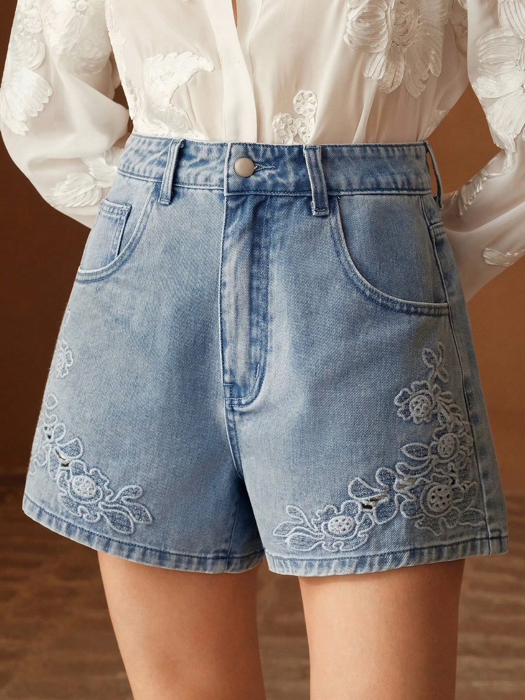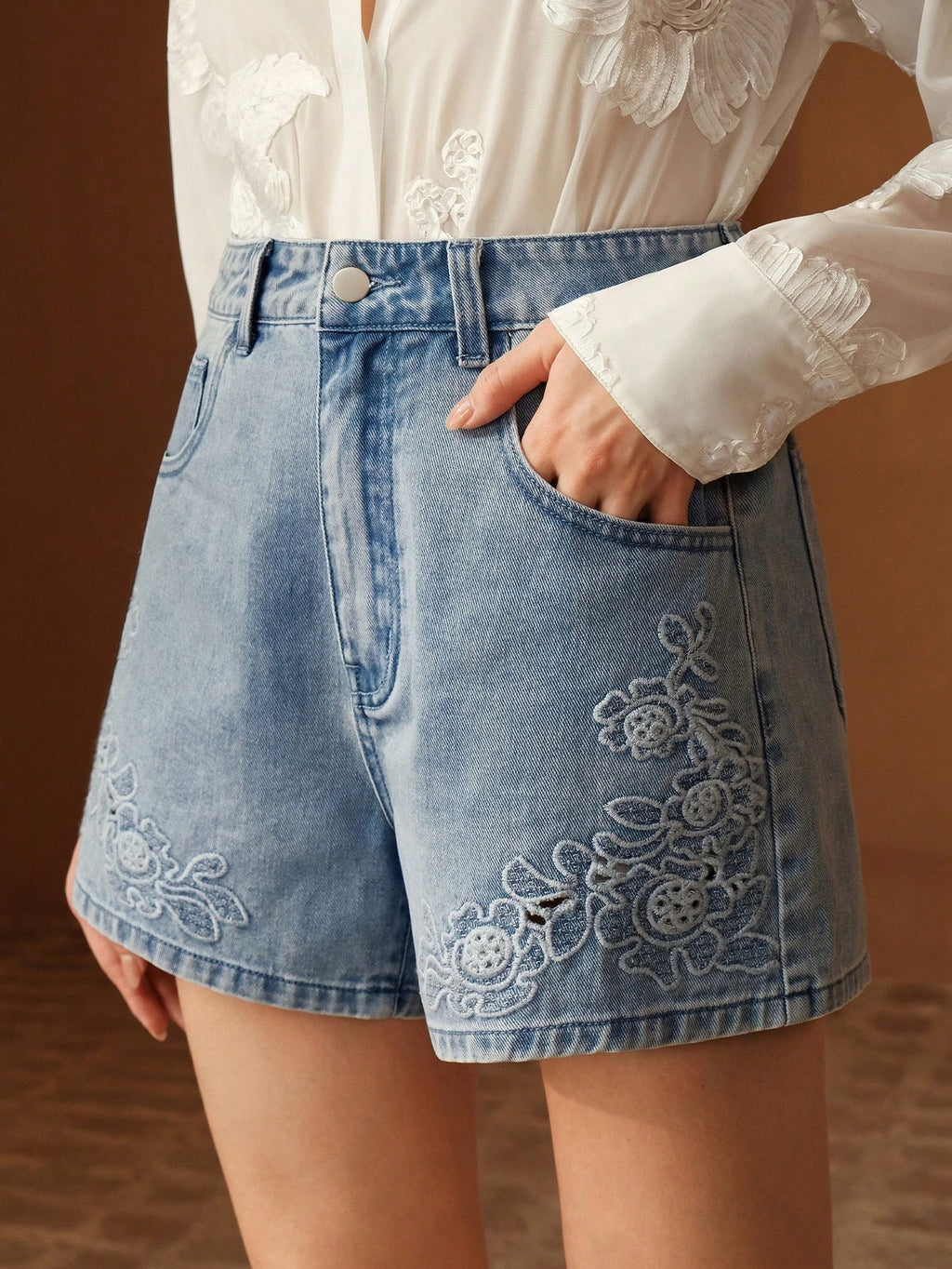 MIU Women's Casual Light Wash Denim Shorts With Floral Embroidery Detail And Zipper