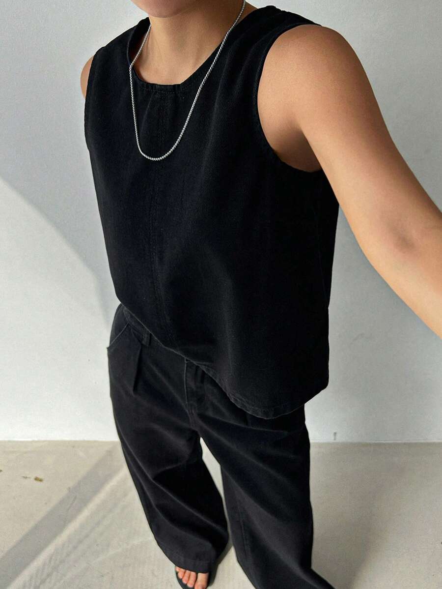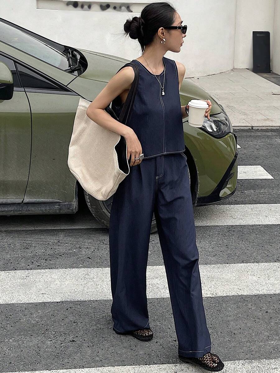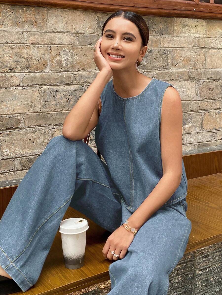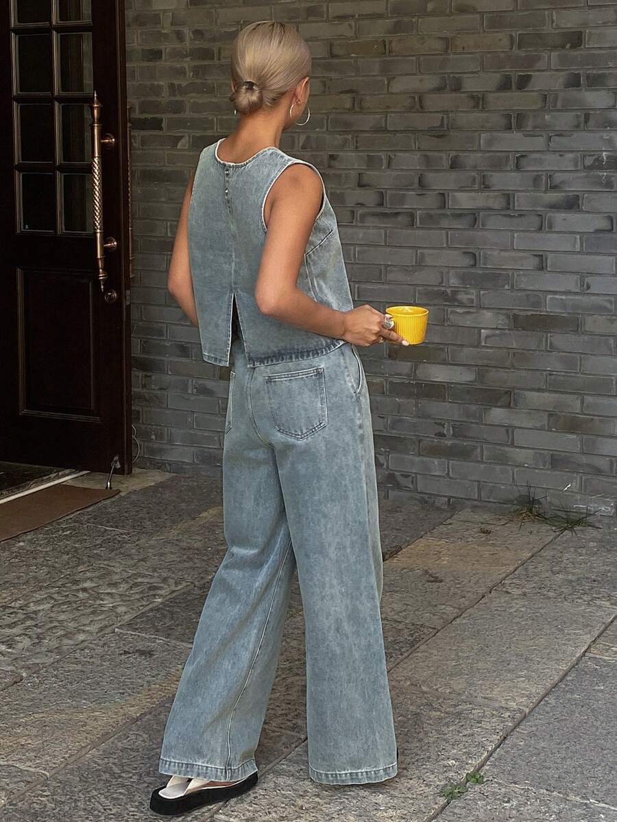 MIU Women's Casual Solid Color Denim Vest Jeans Set