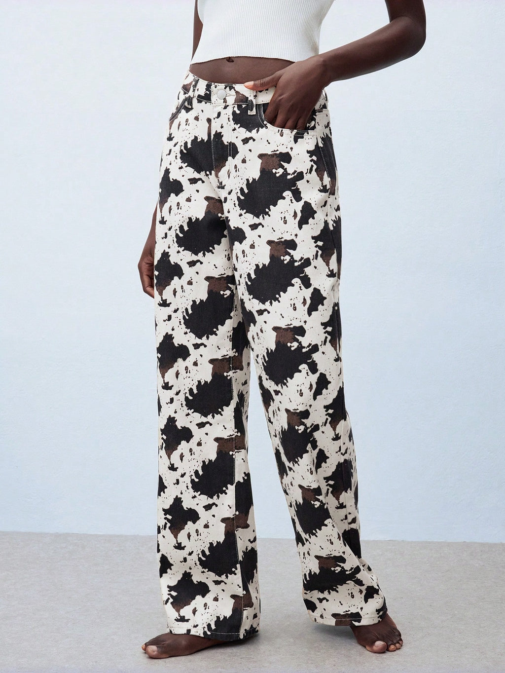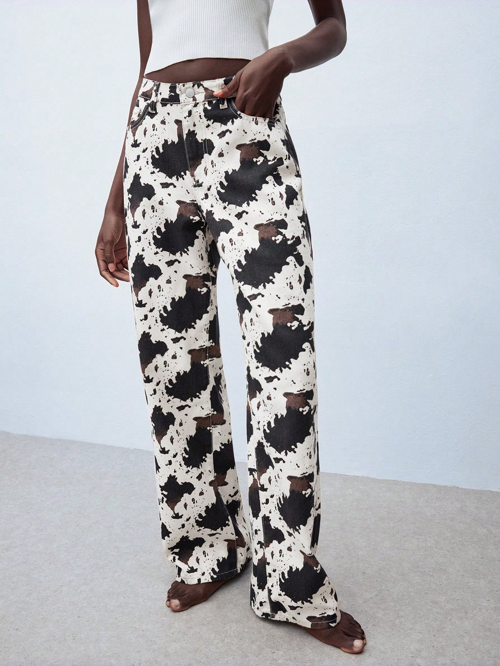 MIU Women's Cow Print Patch Pocket Straight Leg Loose Casual Jeans, Going Out