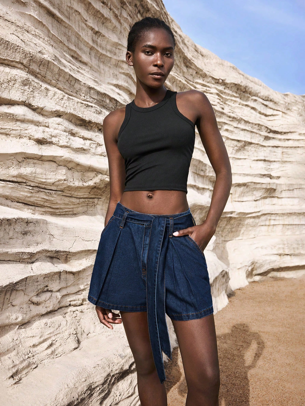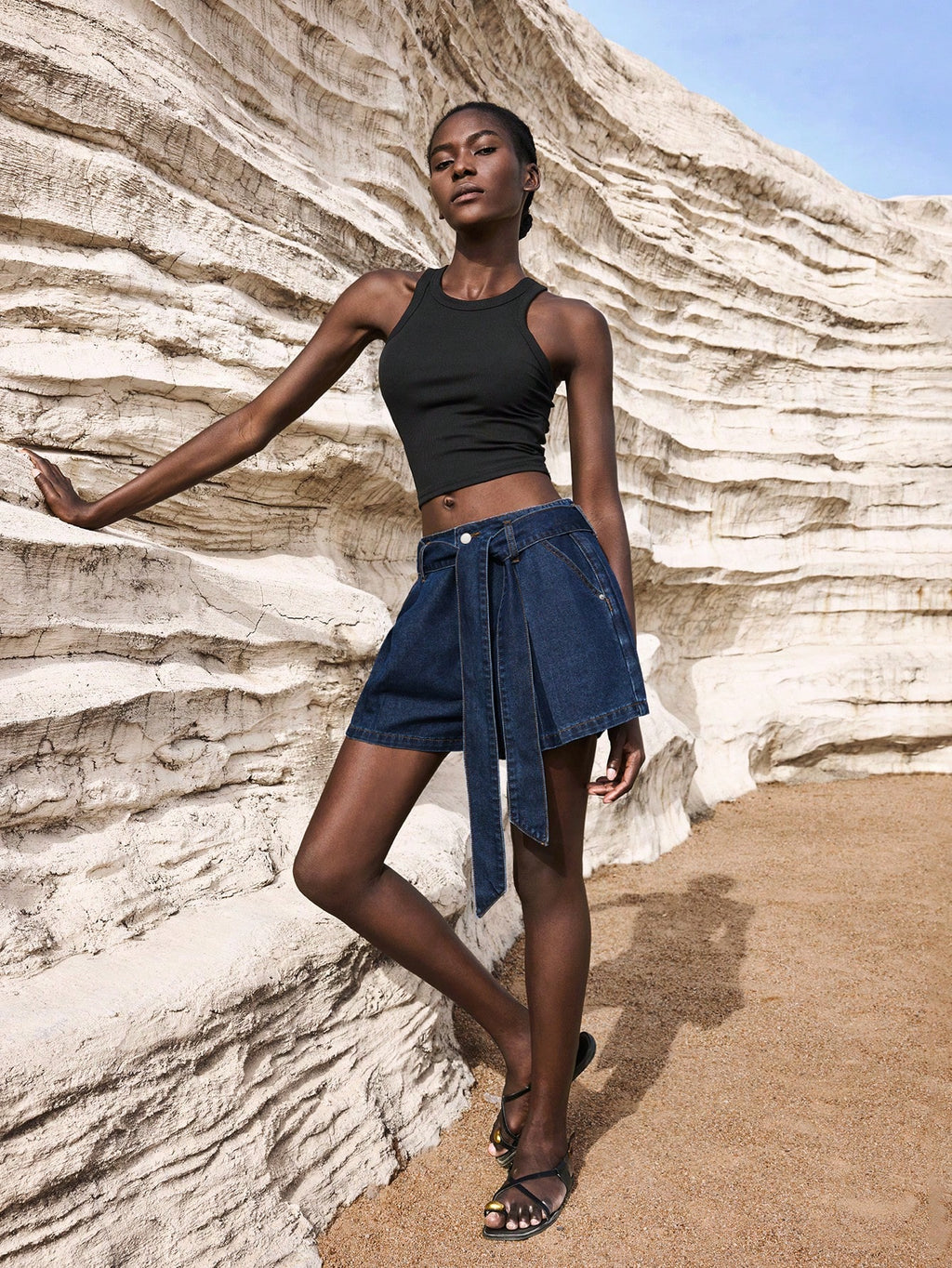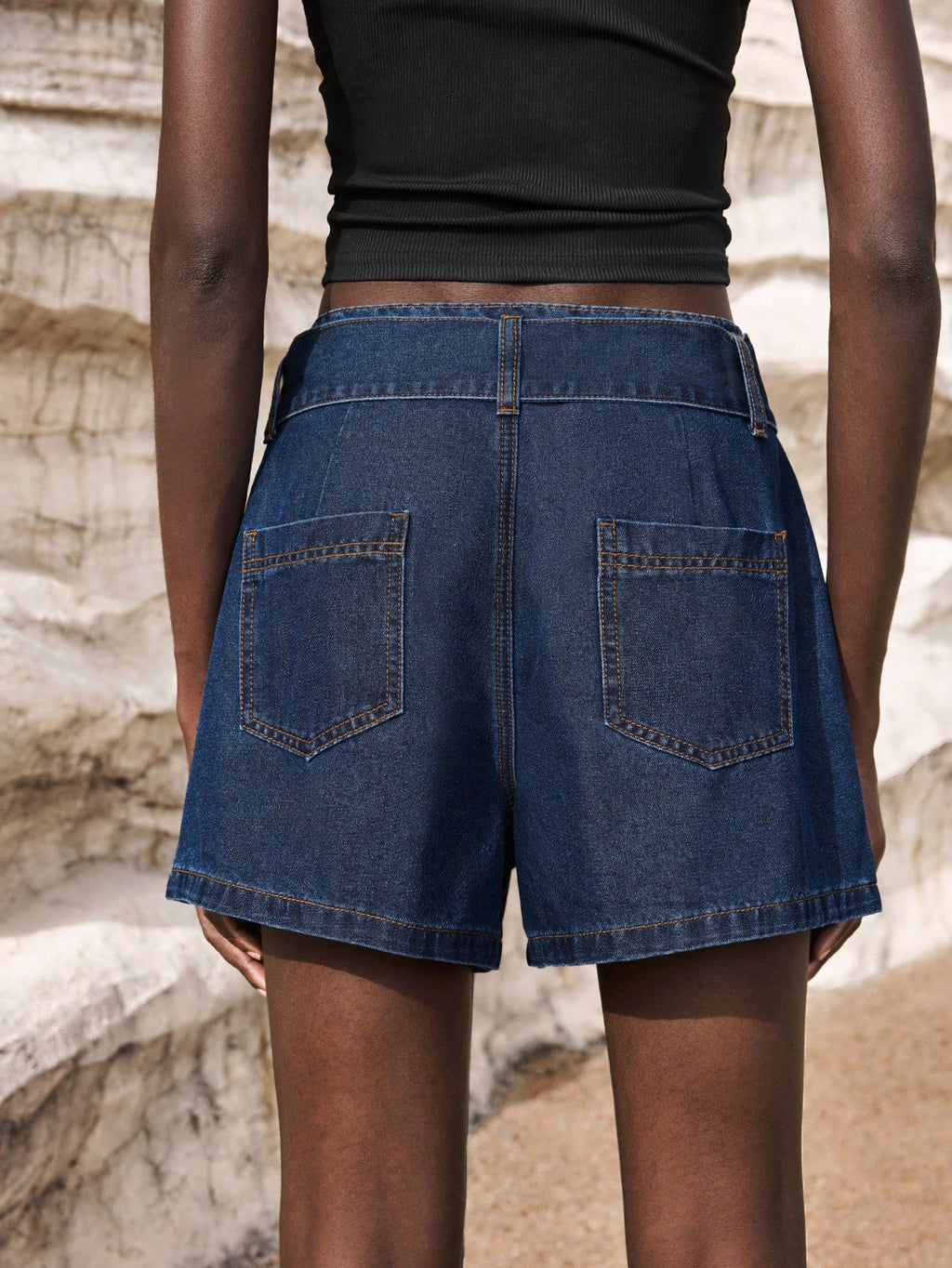 MIU Women's Dark Blue Denim Shorts Belt Included Old Money Style Casual Denim Shorts