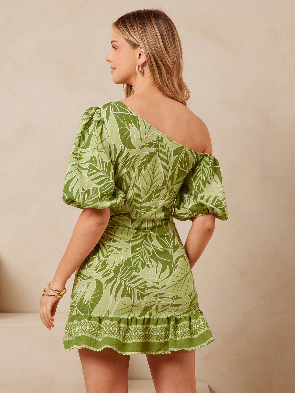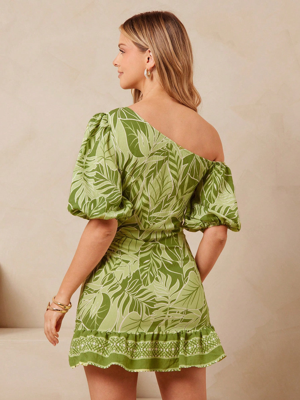 MIU Women's Elegane One Shoulder Puff Sleeve Side Cut Out Green Tropical Border Print Summer Sun Dress, Summer Outfits For Women, Vacation Outfits For Women, Birthday Outfits, 4th Of July Women