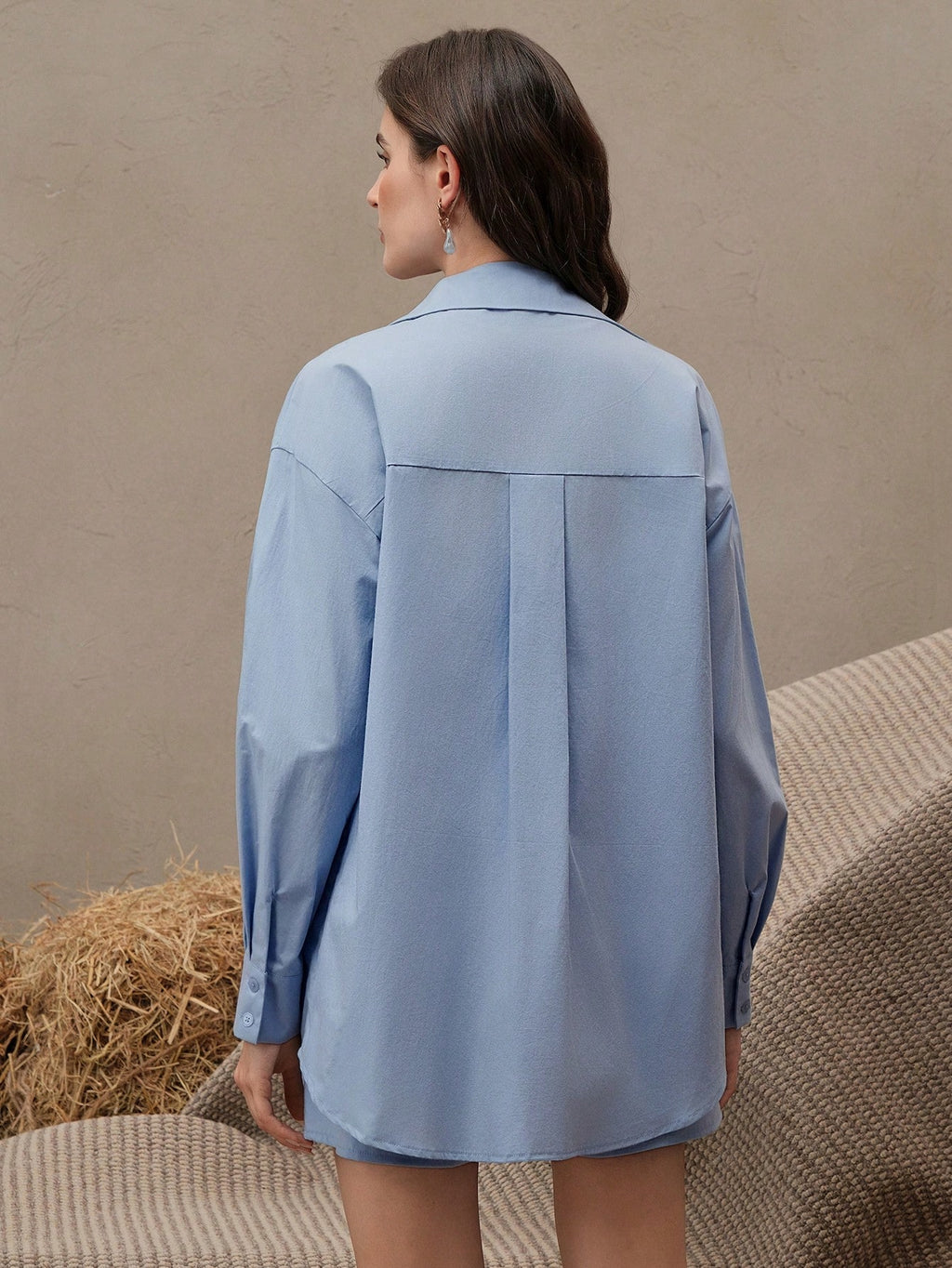MIU Women's Elegant Blue Vacation Embroidered Hollow-Out Casual Shirt Top And Shorts 2 Pieces Set, Spring Summer Festival Graduation