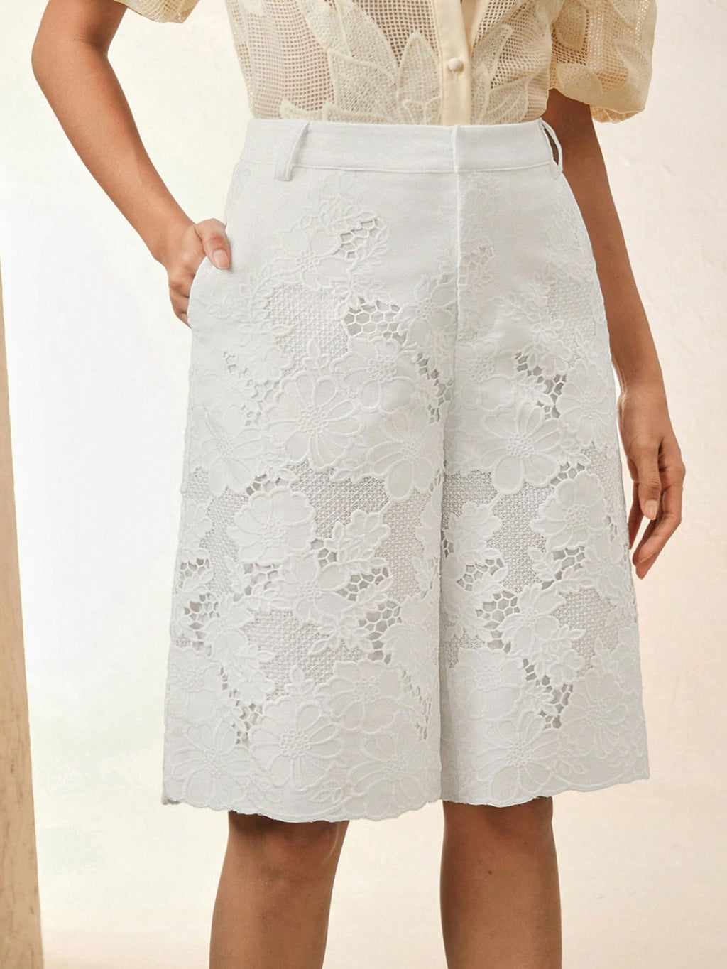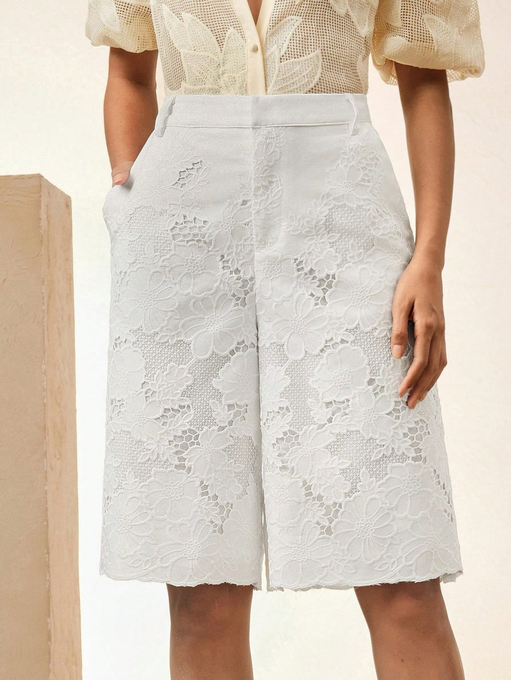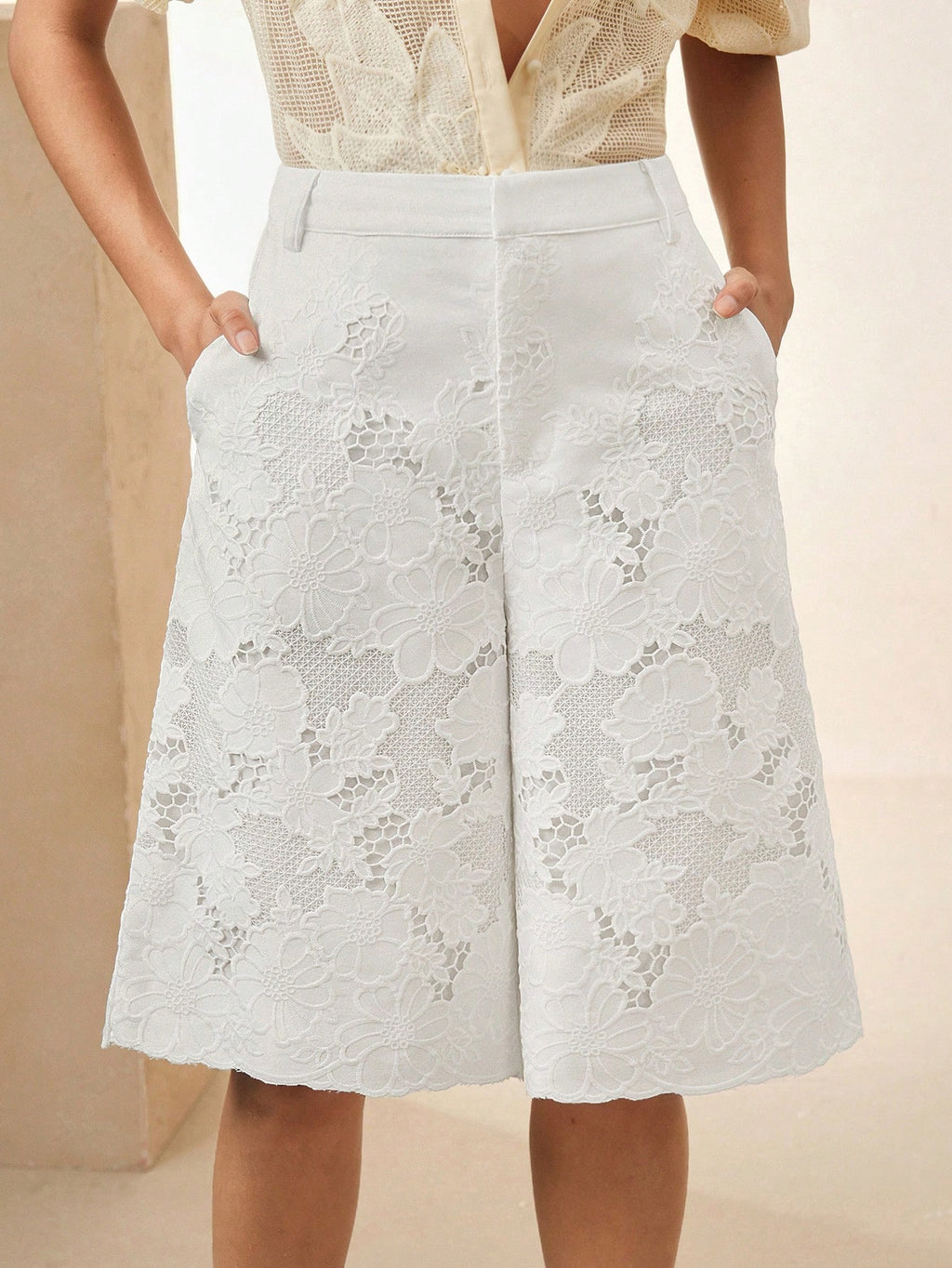 MIU Women's Elegant Commute Hollow Floral Textured Wide Leg Shorts Suit Pants, Spring, Summer, Festival, Graduation