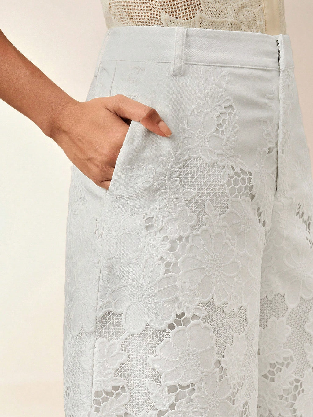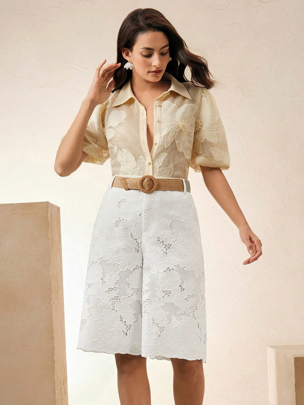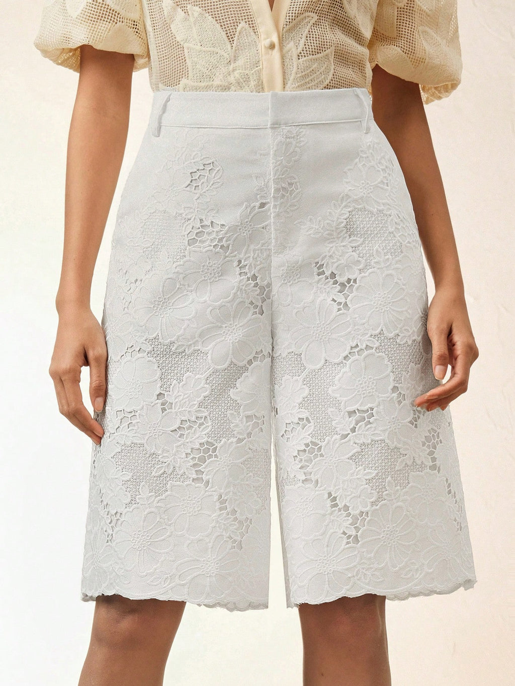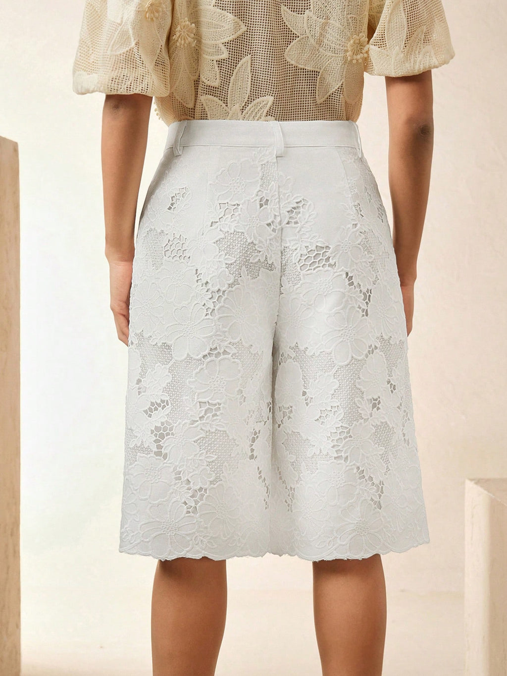 MIU Women's Elegant Commute Hollow Floral Textured Wide Leg Shorts Suit Pants, Spring, Summer, Festival, Graduation