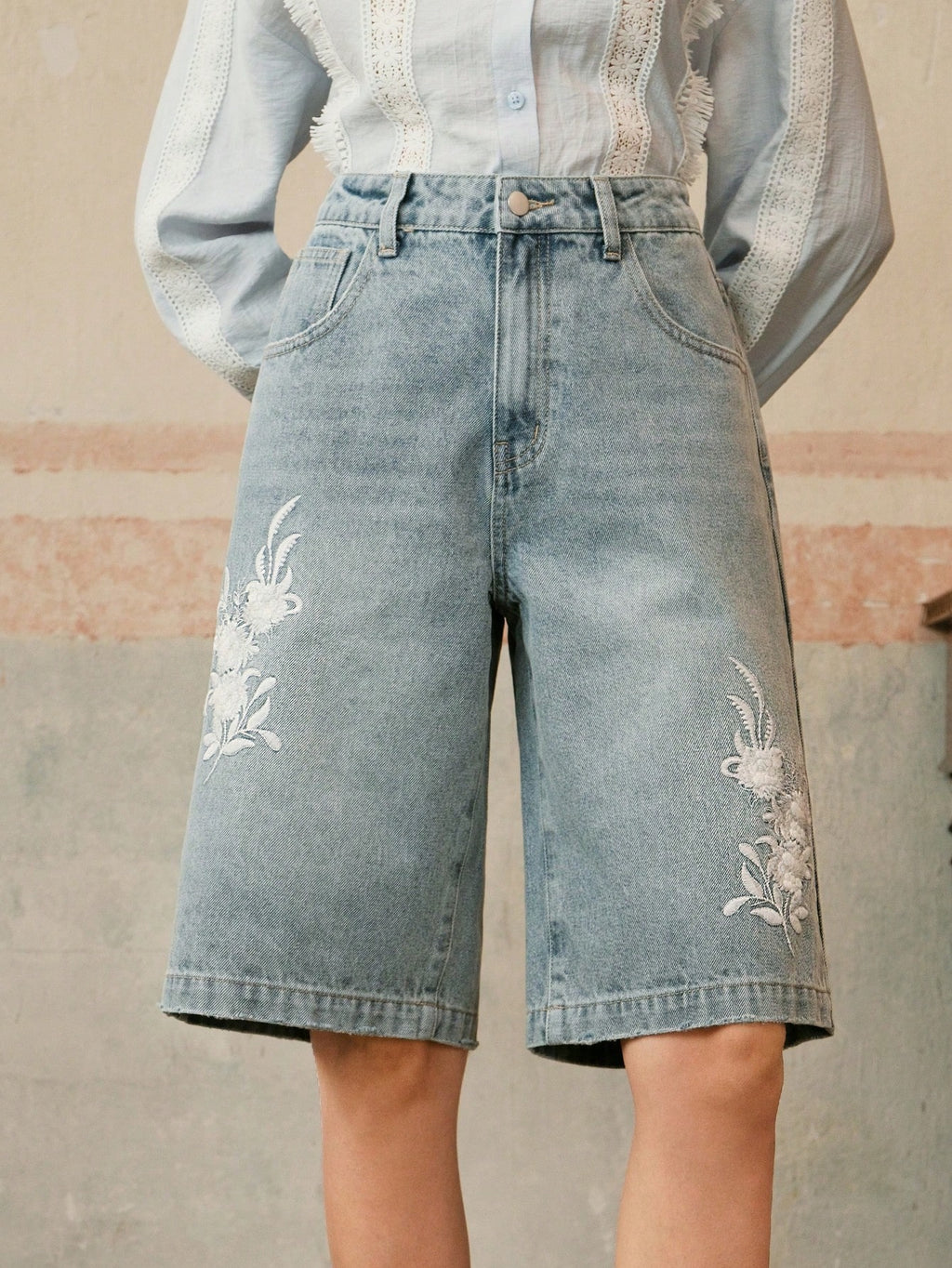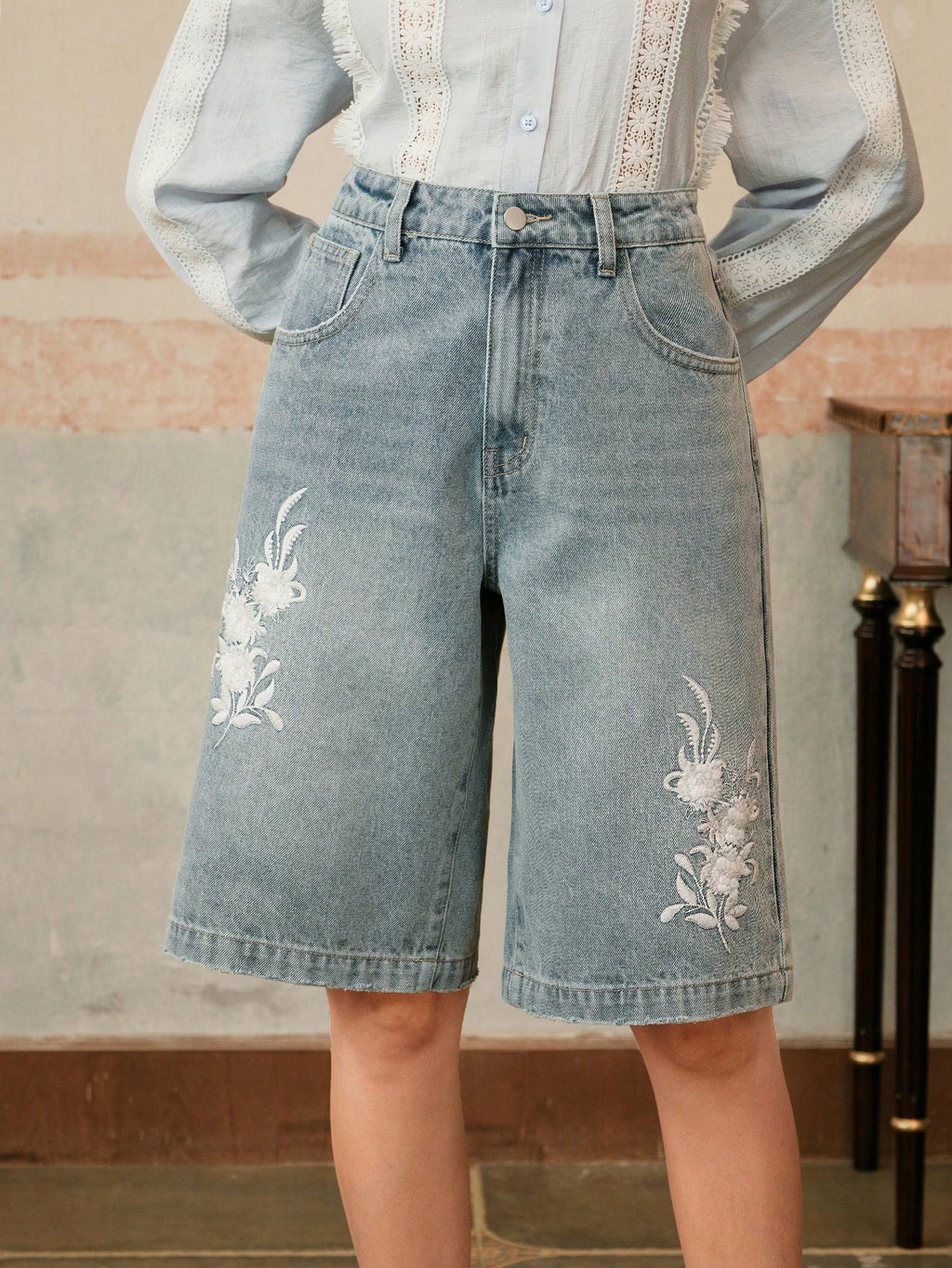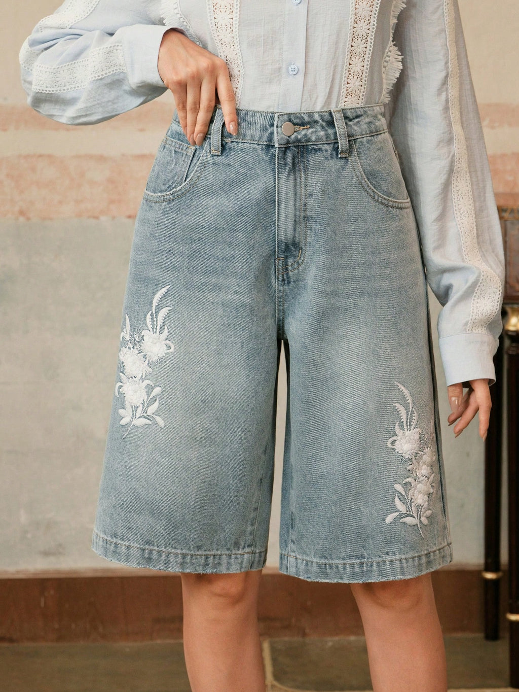 MIU Women's Elegant Floral Embroidered Bermuda Shorts, Blue, Casual, Spring/Summer, Festival, Holiday, Vacation