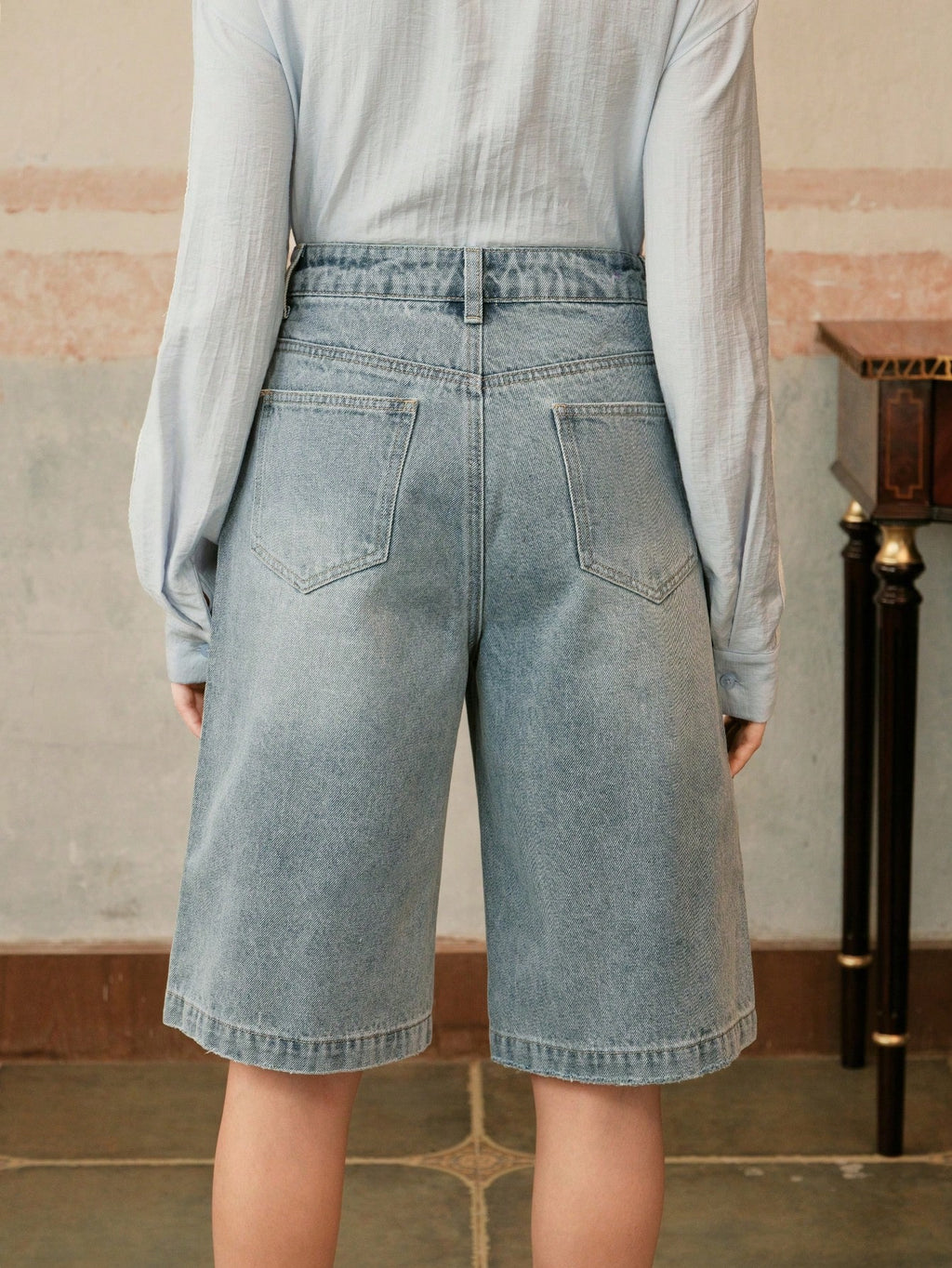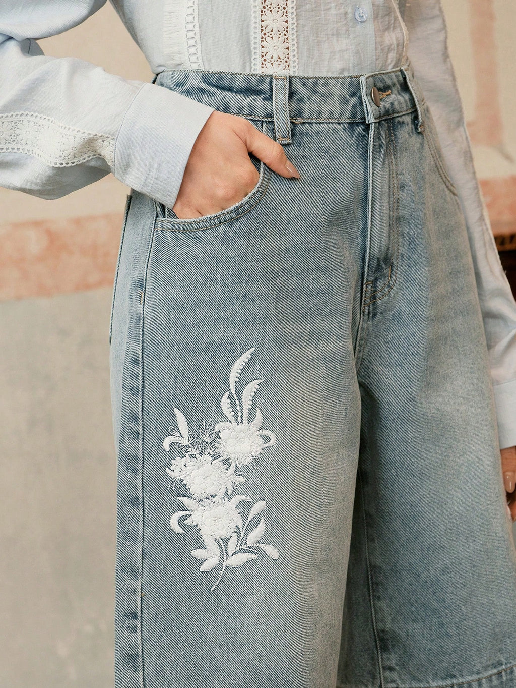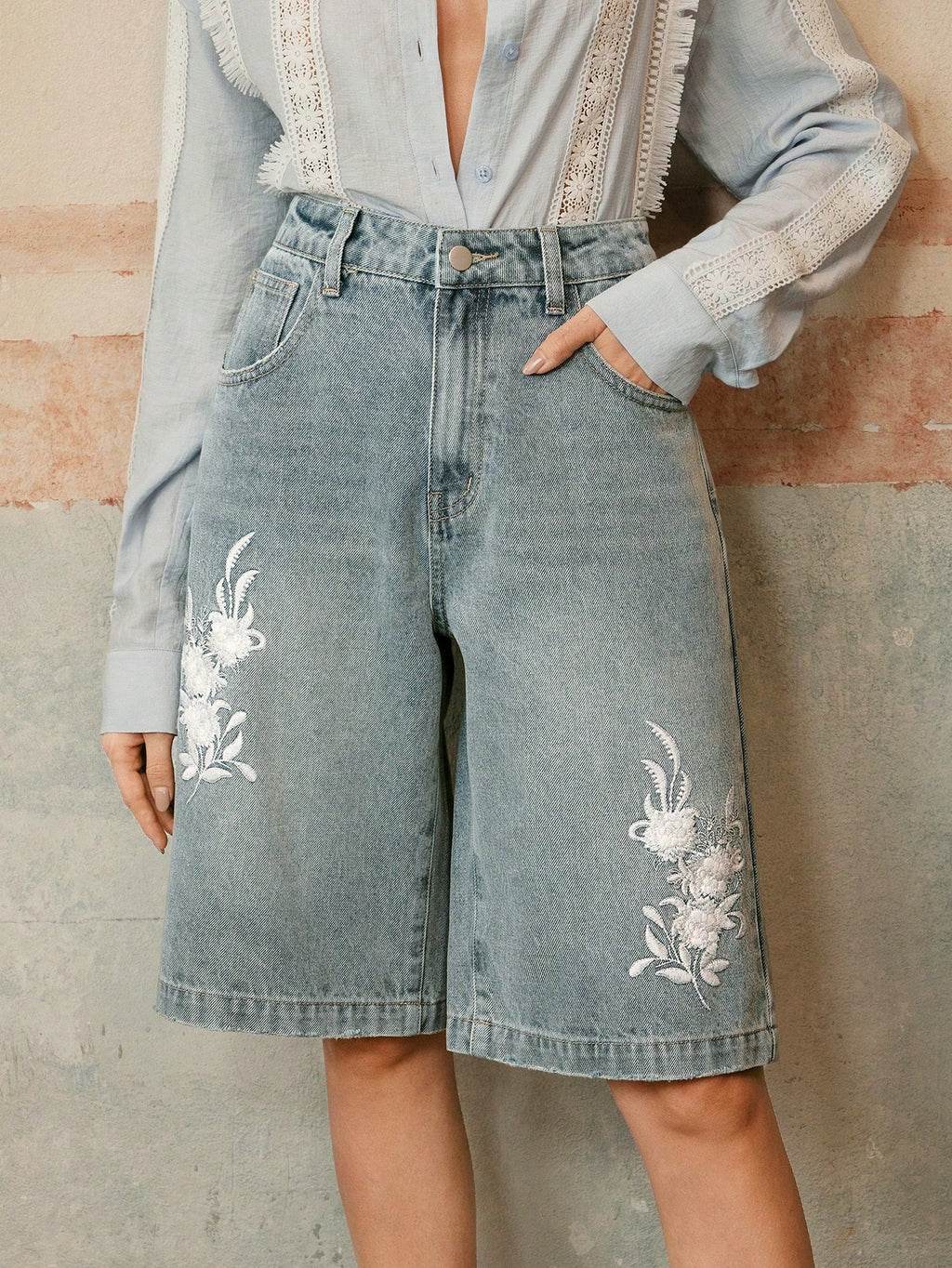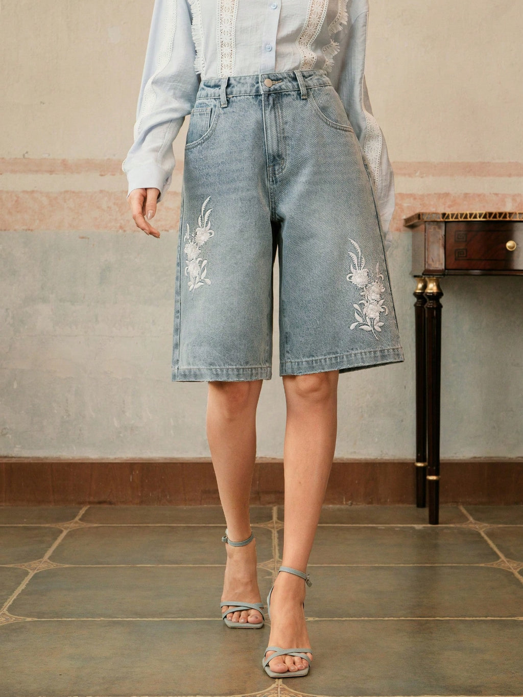 MIU Women's Elegant Floral Embroidered Bermuda Shorts, Blue, Casual, Spring/Summer, Festival, Holiday, Vacation