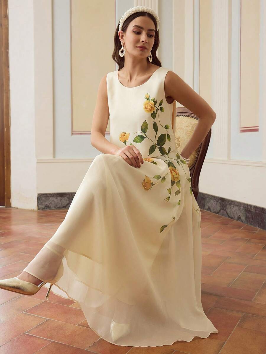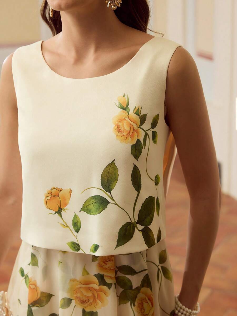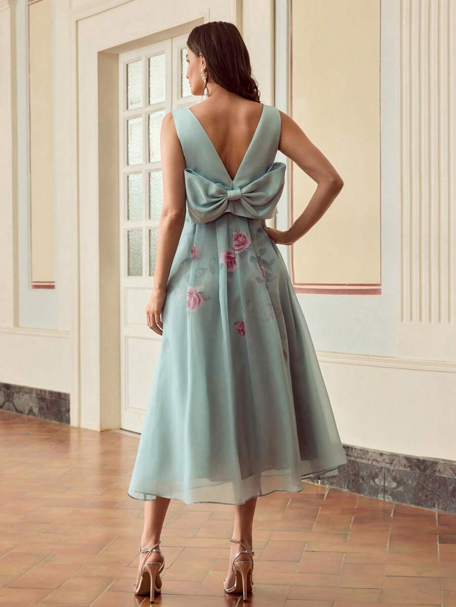MIU Women's Elegant Floral Print Backless With Bow Decor Sleeveless Midi Dress, Summer Dating Dress