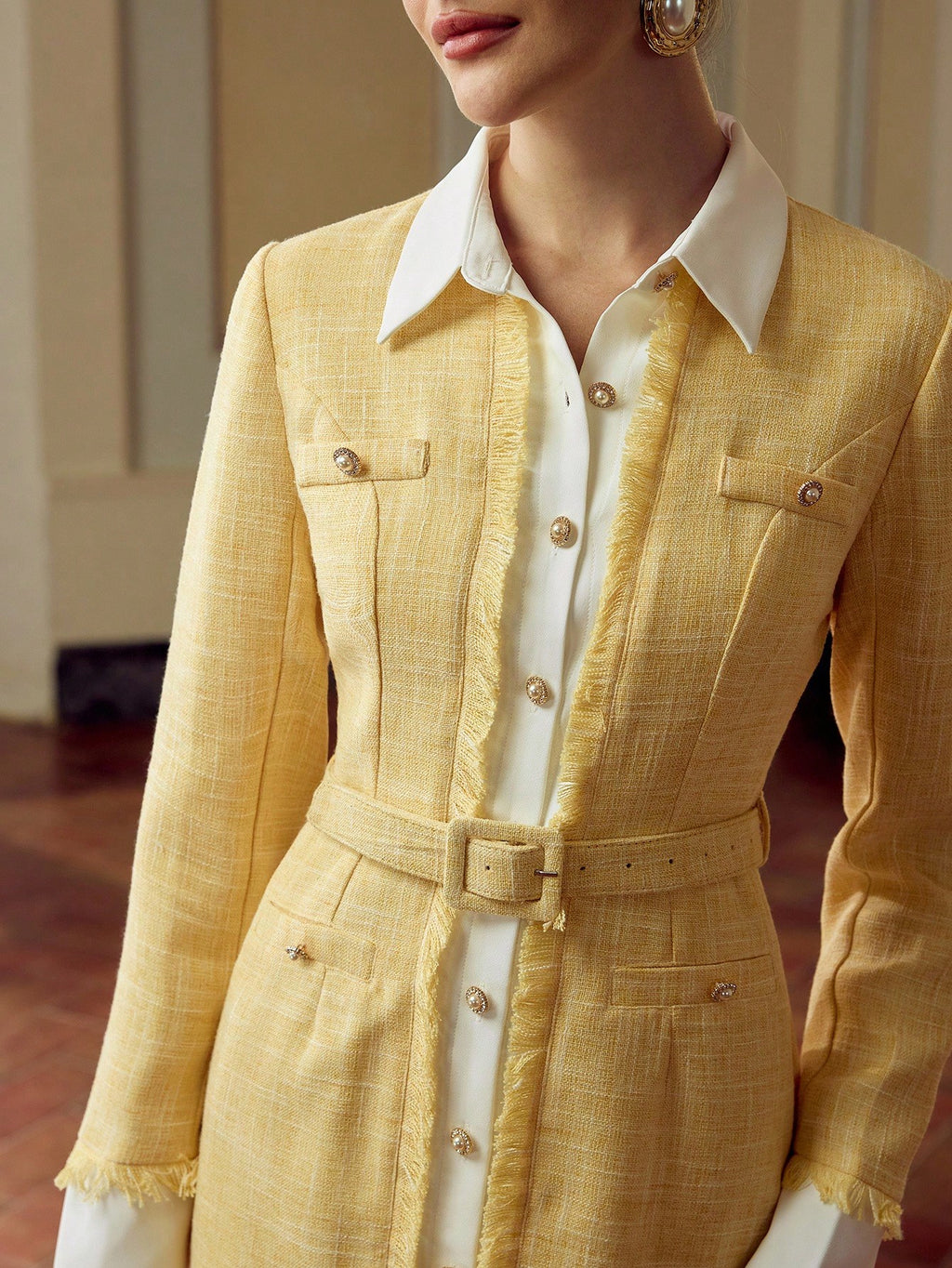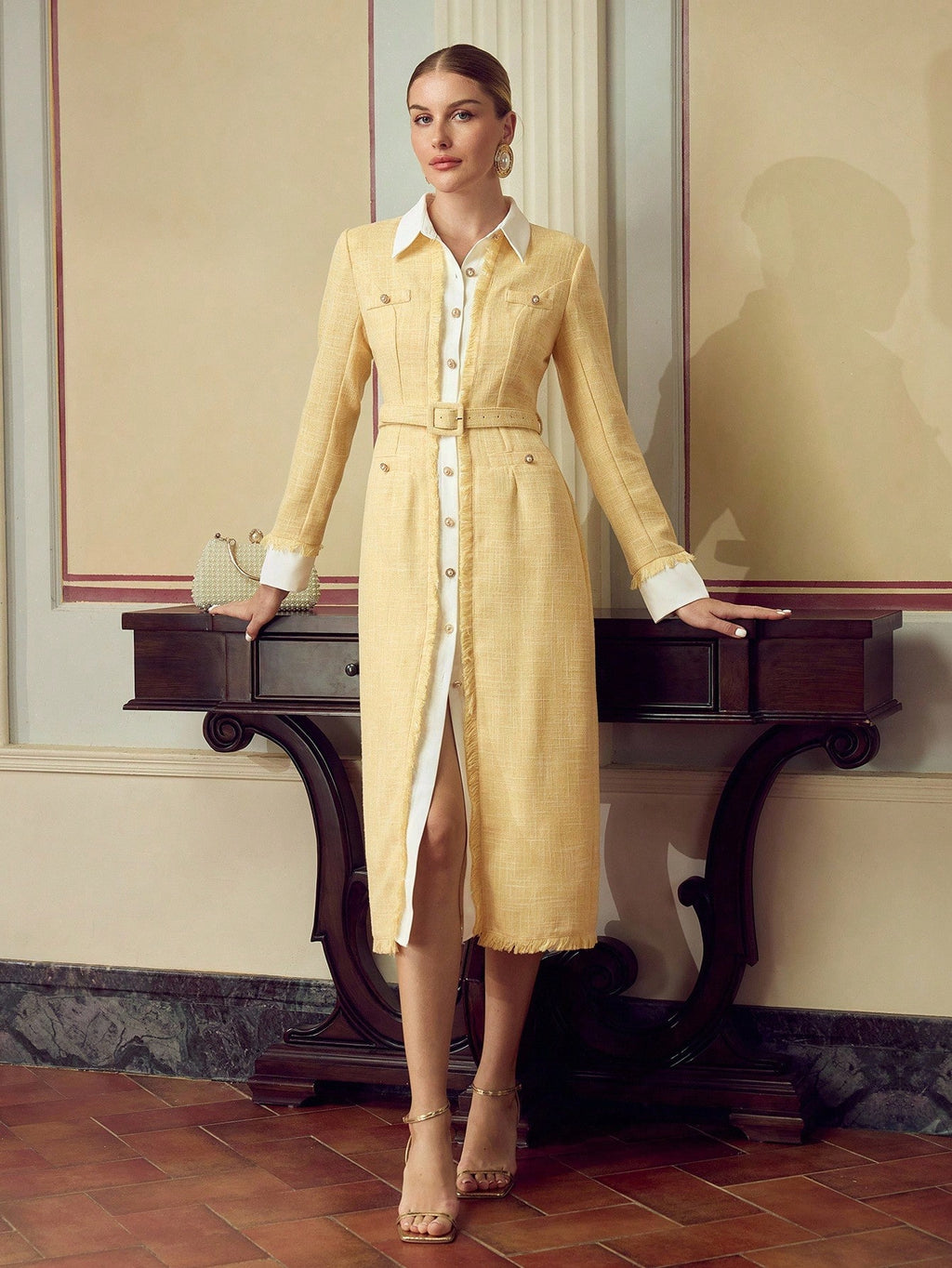 MIU Women's Elegant Mid-Length Dress With 2 In 1 Design, Long Sleeve, Single-Breasted