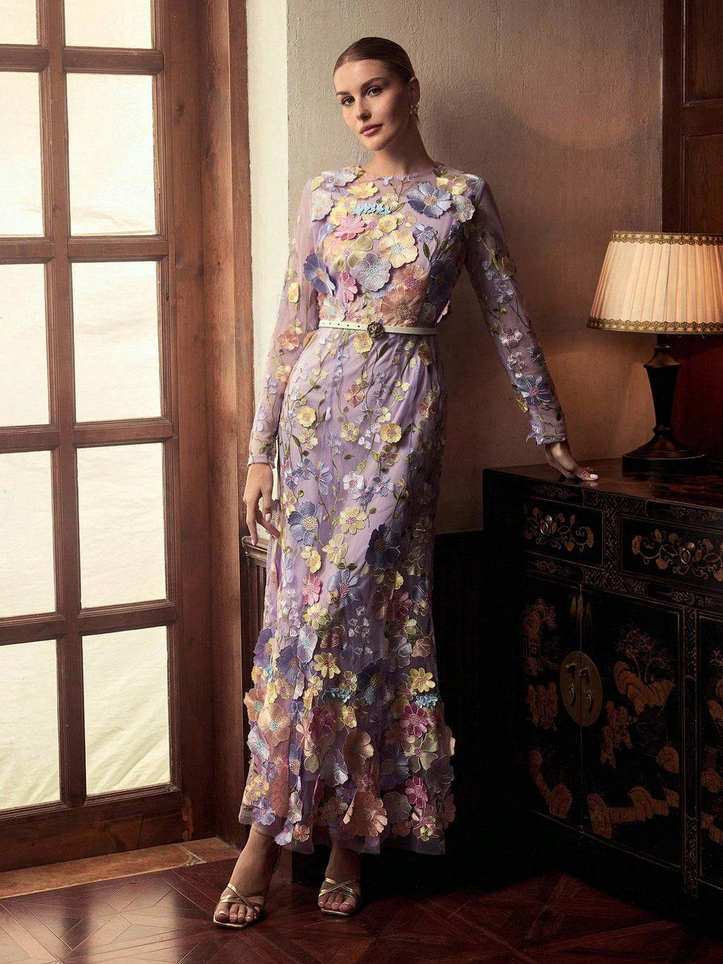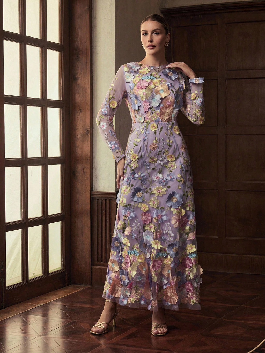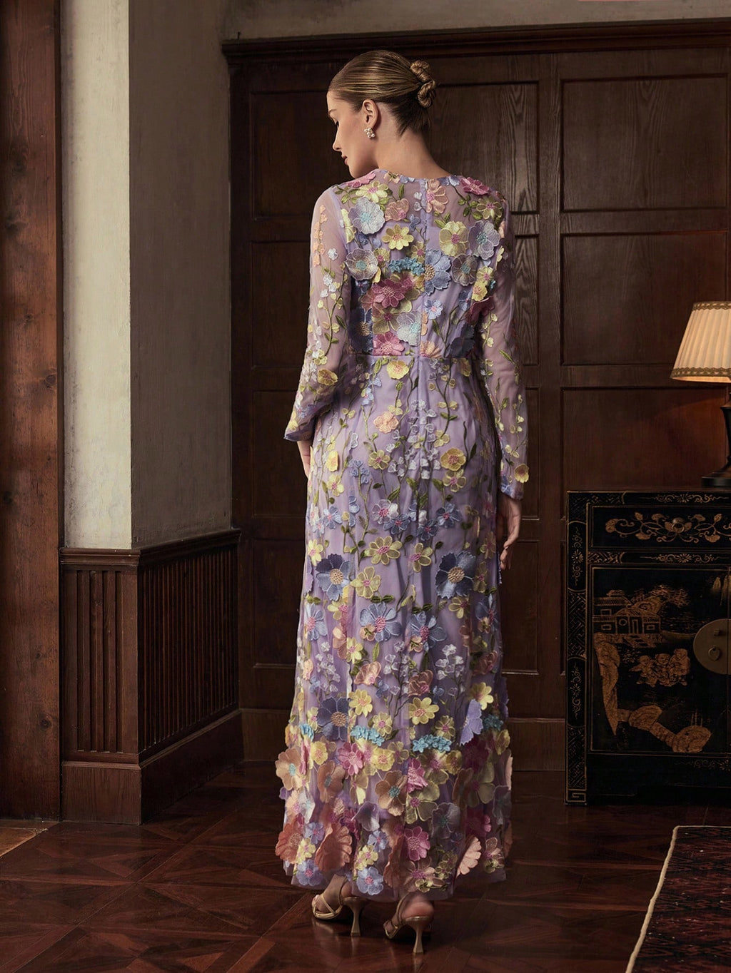 MIU Women's Elegant Party 3D Floral Embroidered Mesh Dress